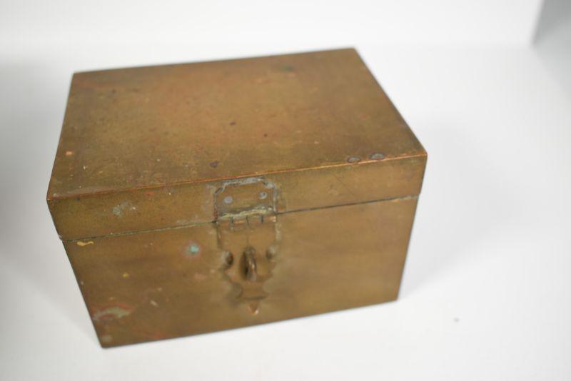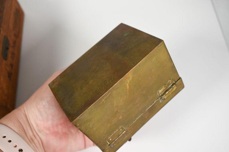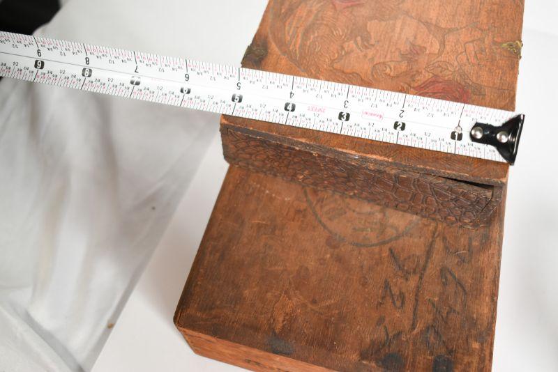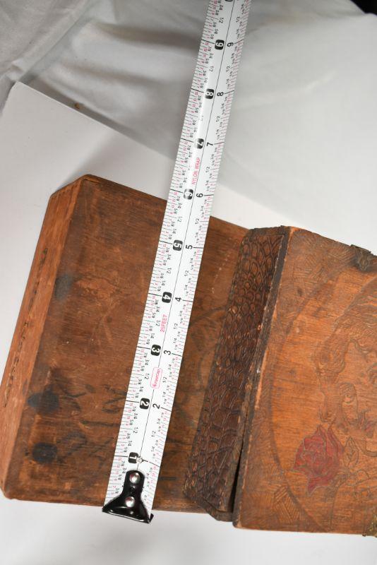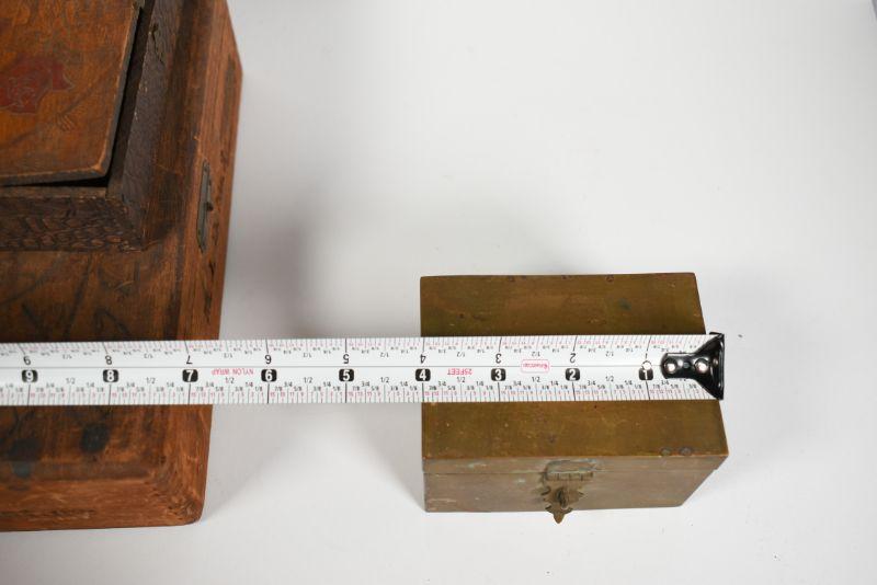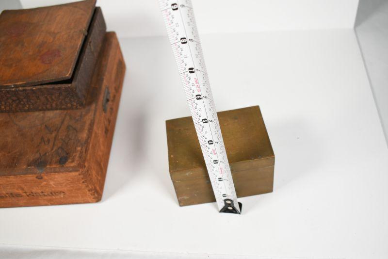 Cigar box, brass recipe box and a carved wooden box. Good storage for your treasures. See pictures for sizes.**Please read Terms and Conditions before placing a bid. Pick up is Sunday, December 22 from 11am to 3pm or Monday, December 23 from 4pm-7pm in Mantua, NJ. All sales are final. All sales are as is, where is. Please review all photos. Props are not included. Measurements are approximate.