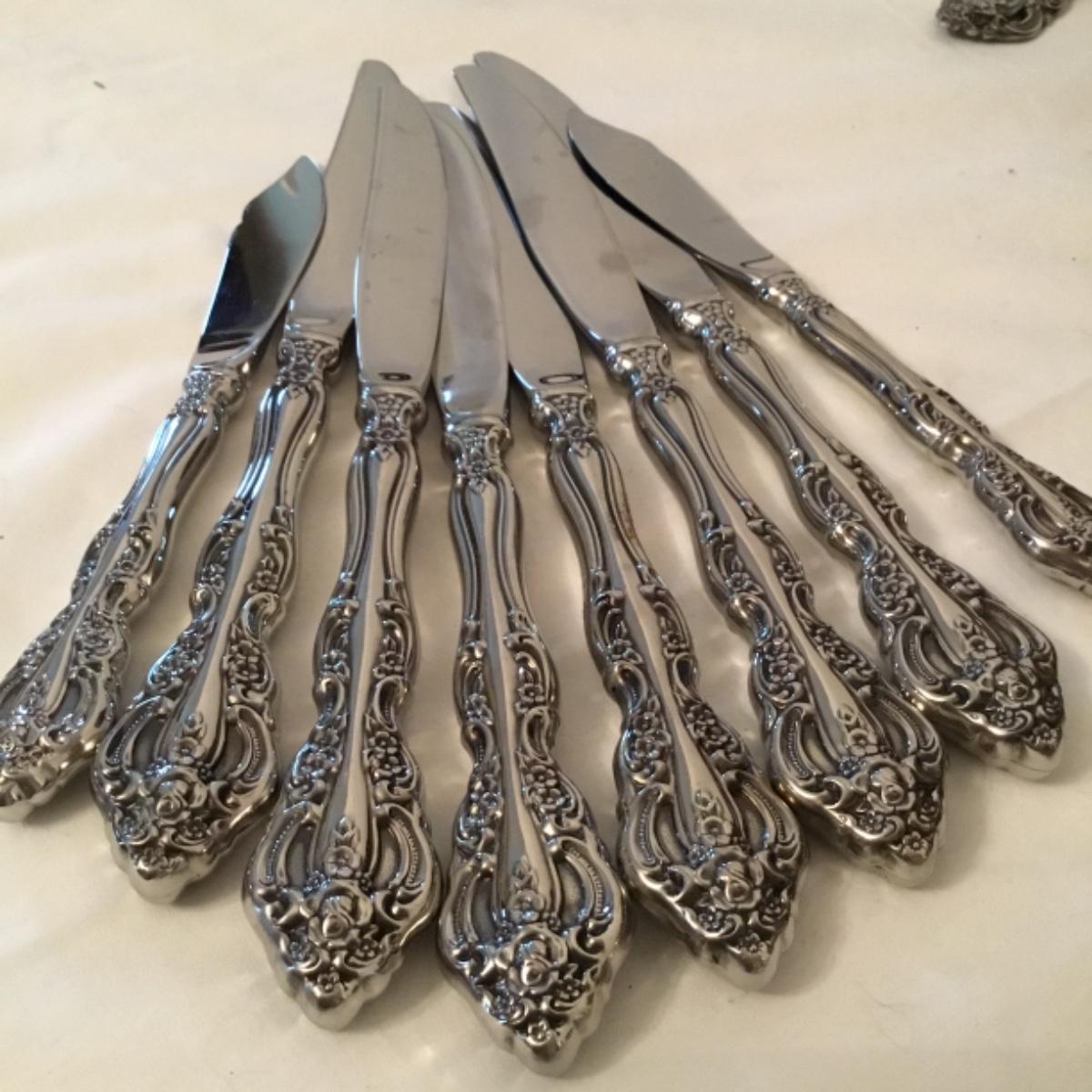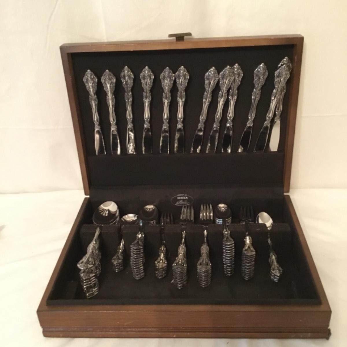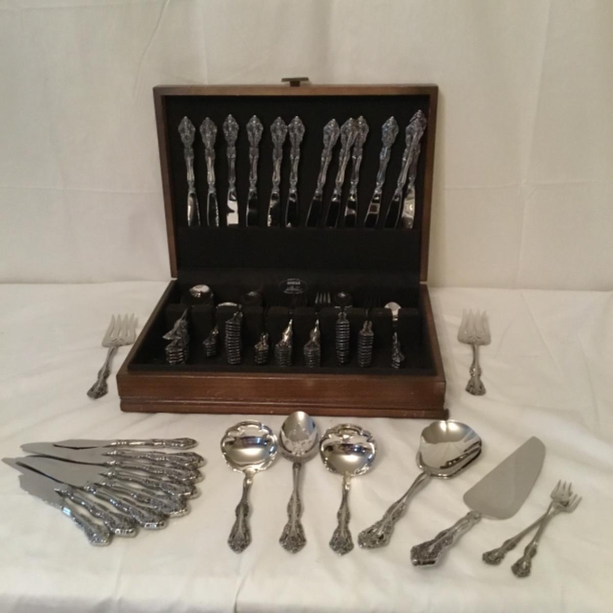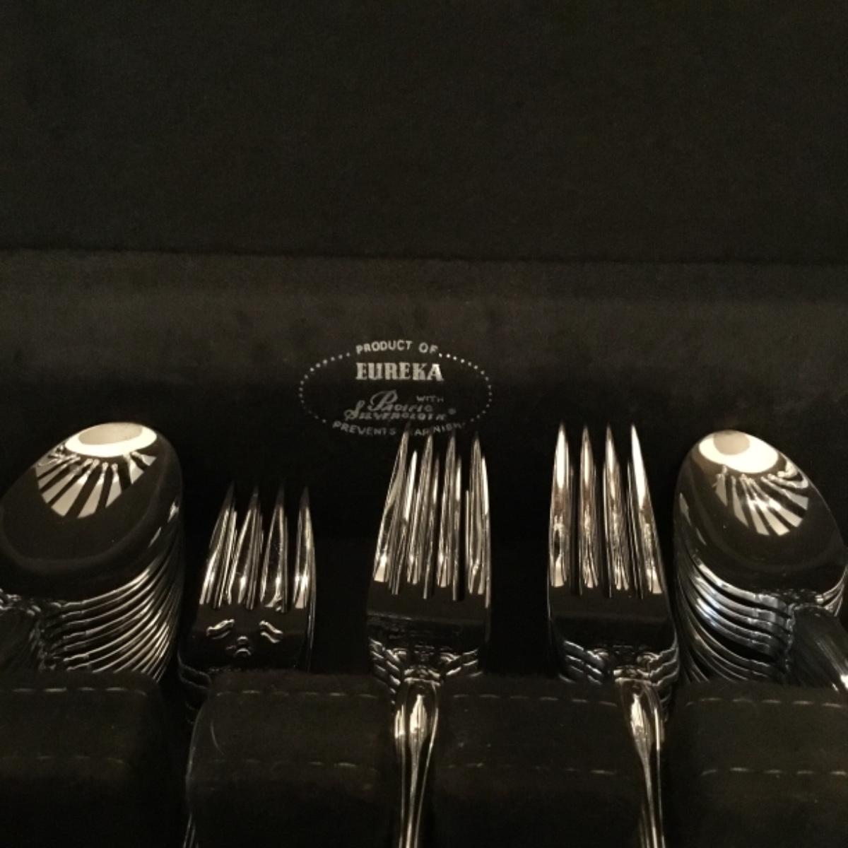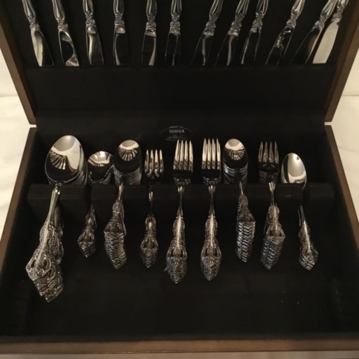 Enjoy this lot of a complete 5 piece-16 place settings plus more Eureka silverware set providing decor and functionality to your kitchen! Handles labeled Oneida Stainless. See photos for close-up details. The complete box measures 15.5"x11.5". Shipping available