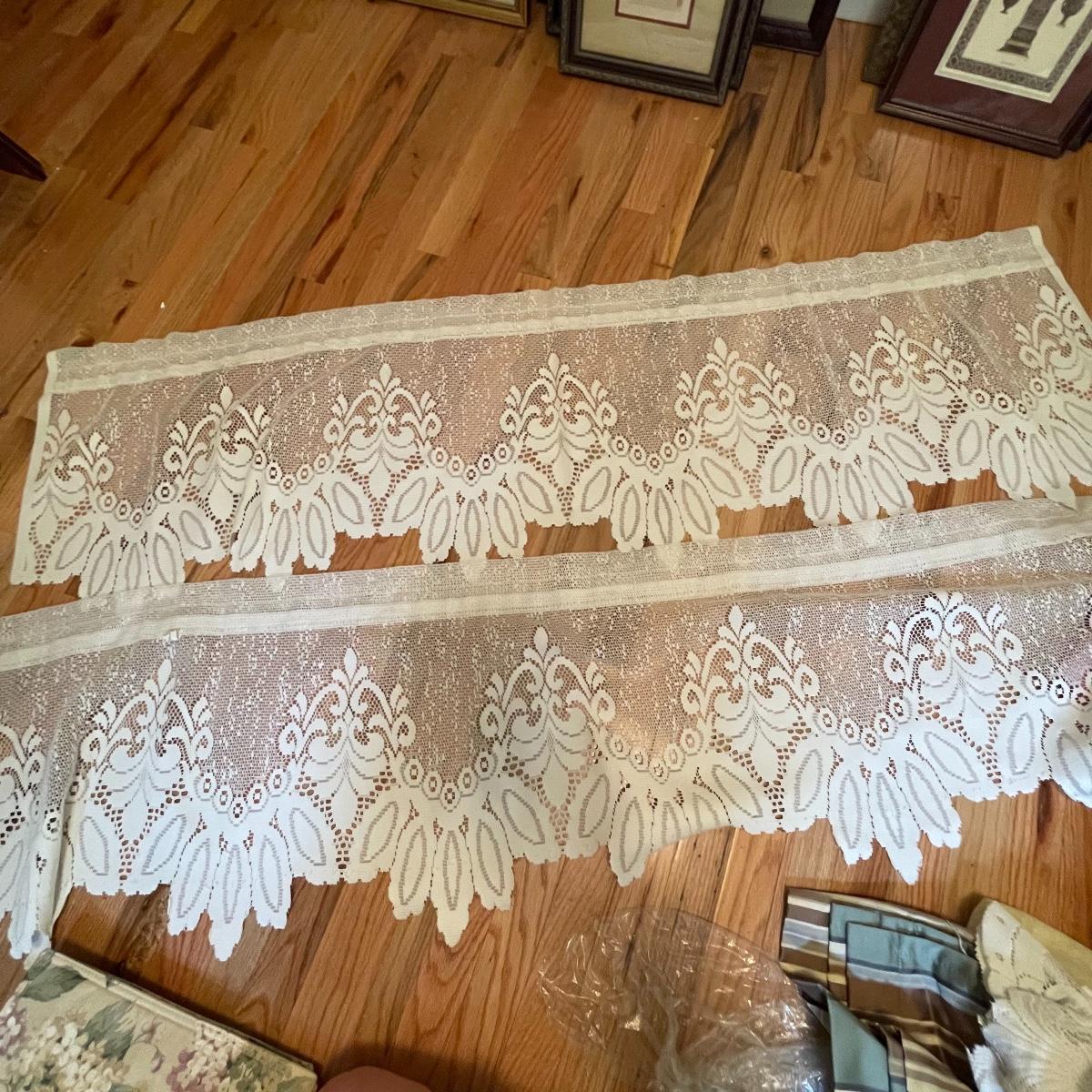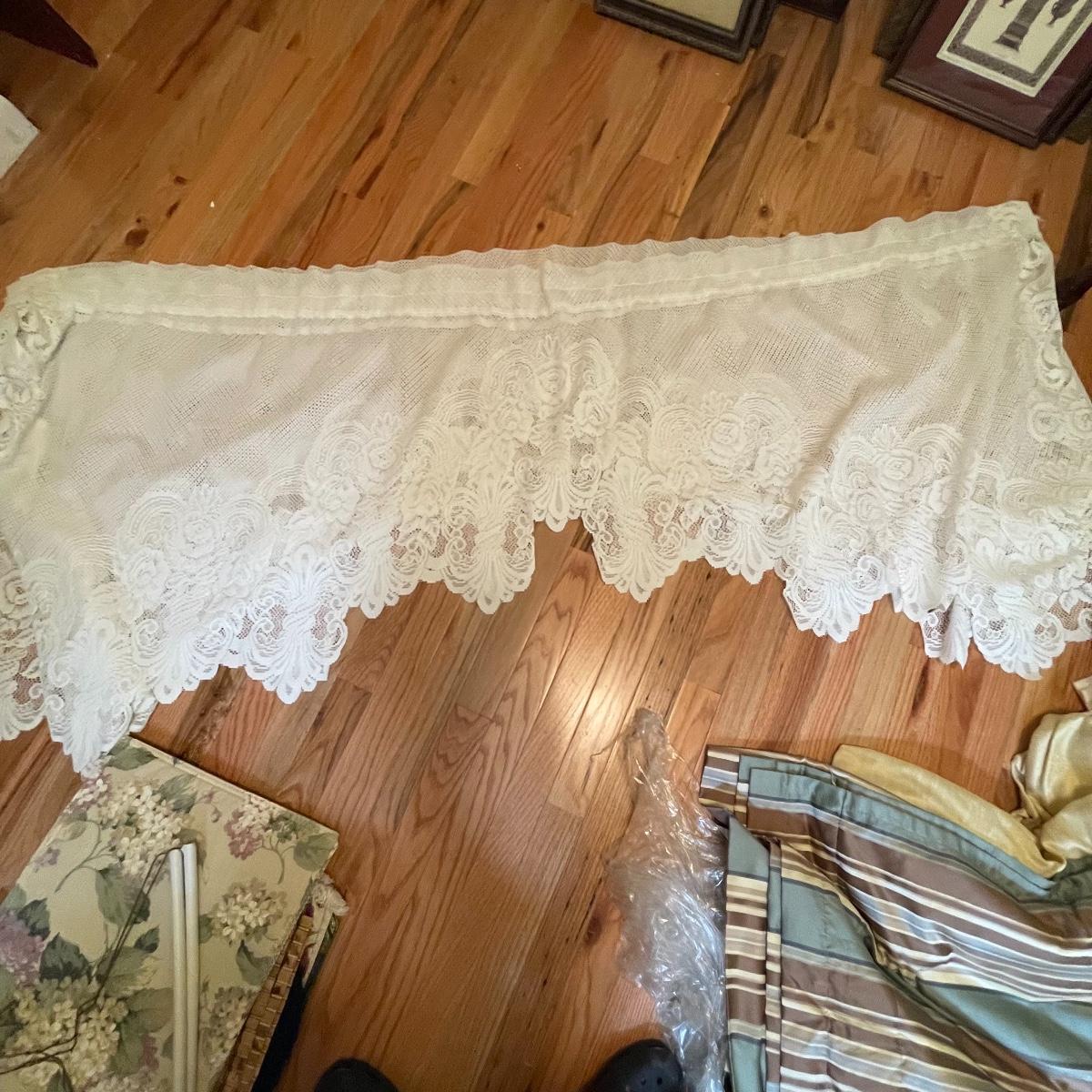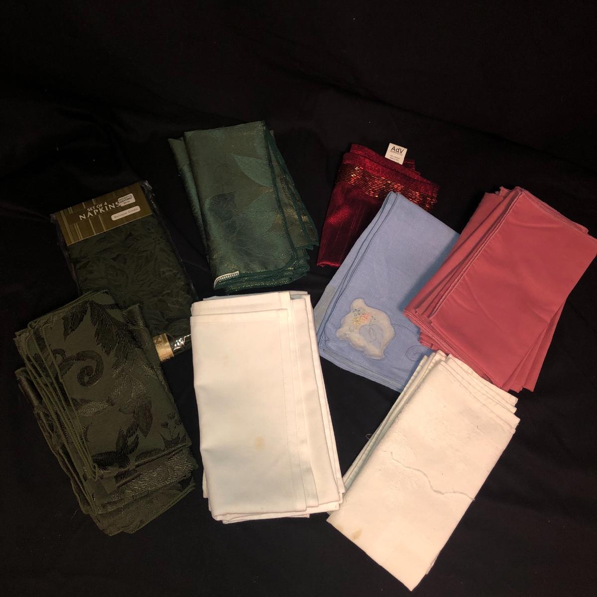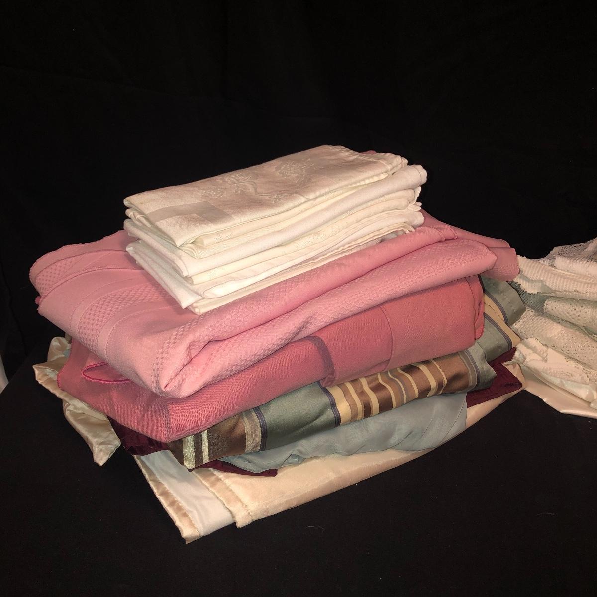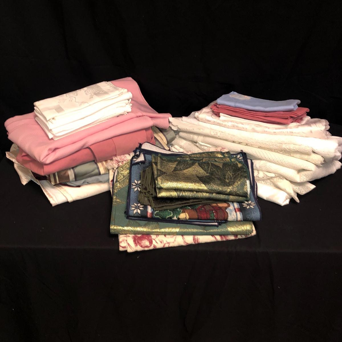 This collection of linens contains a mix of long curtains and valences. Four matching knit valences are about 61” long and 18” tall. The other valence set has two 22” tall valences, one is 67” long and the other is double about 135”long. Full curtains include a beautiful cream colored with the pleated top measuring about 48” and about a 70” length. The striped curtain is about 54” x 84”. The table cloths are two are shades of pink and two are elegantly designed white. Lot also contains six sets of cloth napkins, six sets of place mats, and curtain hooks. Varieties of colors and styles.