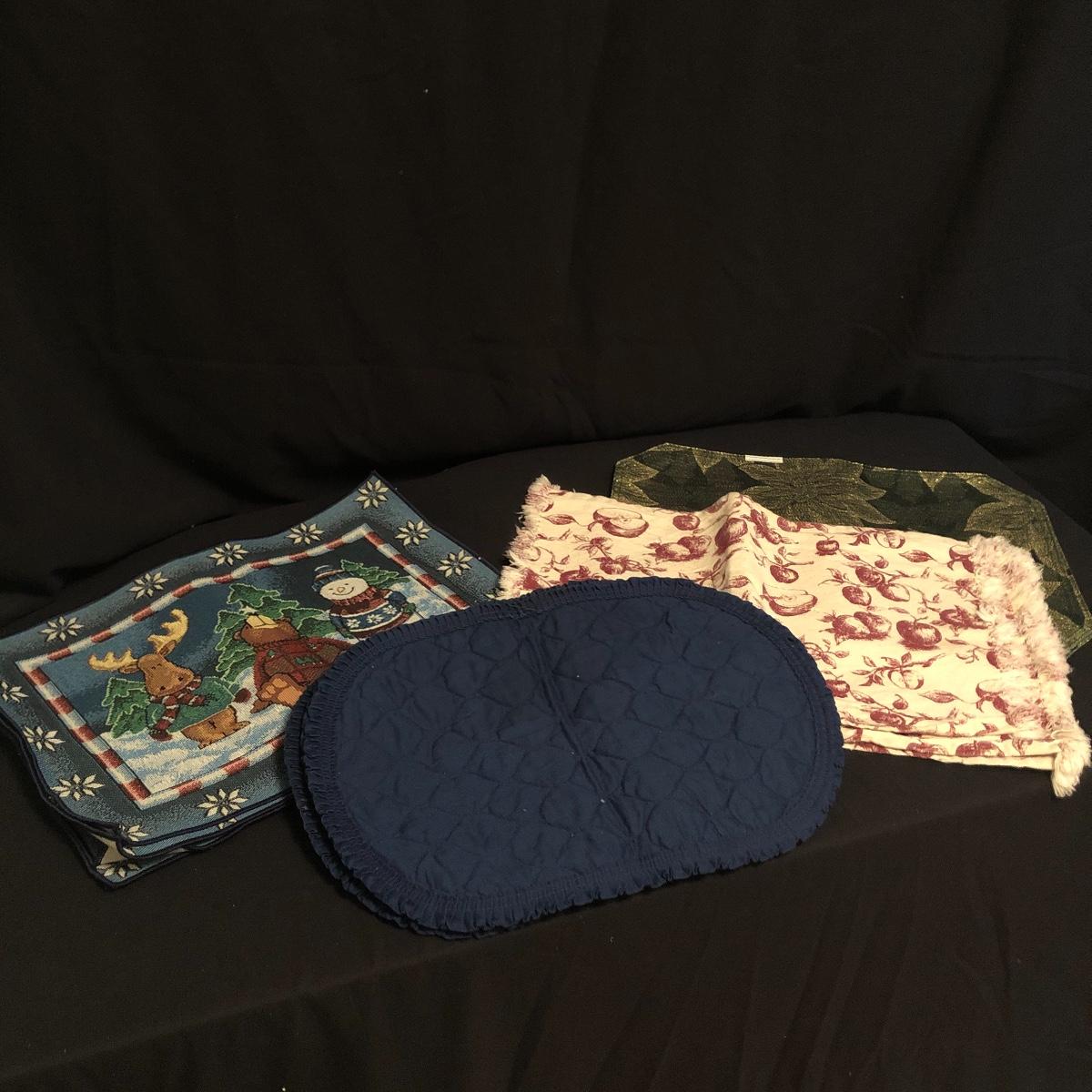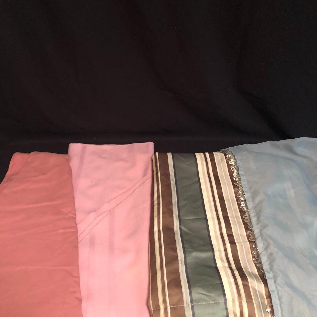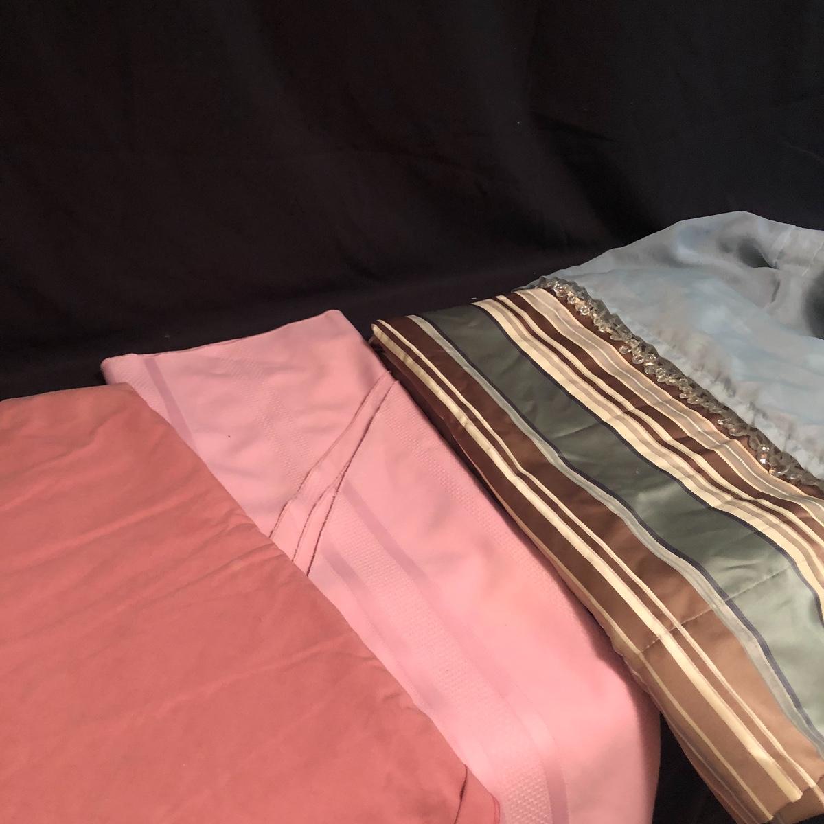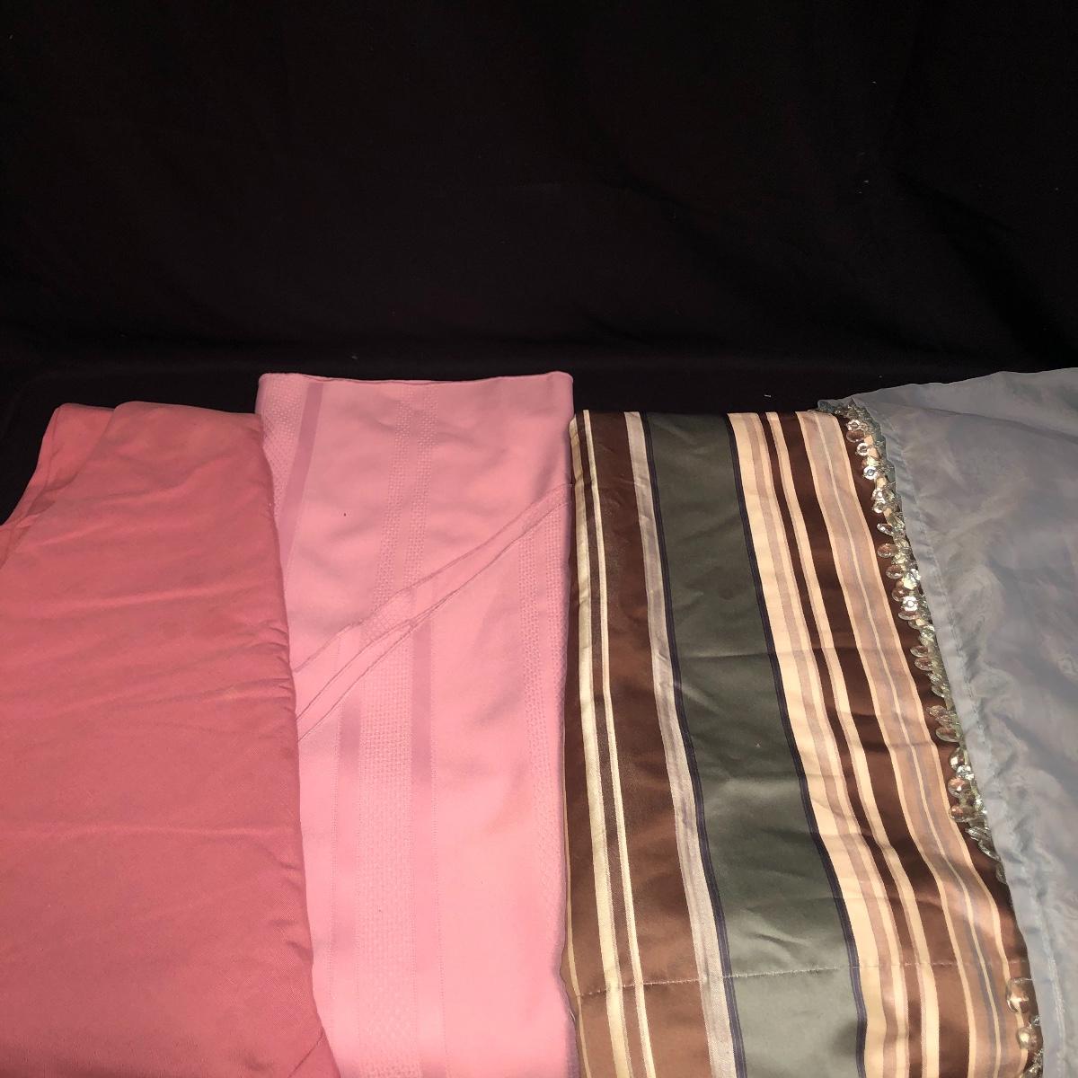 This collection of linens contains a mix of long curtains and valences. Four matching knit valences are about 61” long and 18” tall. The other valence set has two 22” tall valences, one is 67” long and the other is double about 135”long. Full curtains include a beautiful cream colored with the pleated top measuring about 48” and about a 70” length. The striped curtain is about 54” x 84”. The table cloths are two are shades of pink and two are elegantly designed white. Lot also contains six sets of cloth napkins, six sets of place mats, and curtain hooks. Varieties of colors and styles.