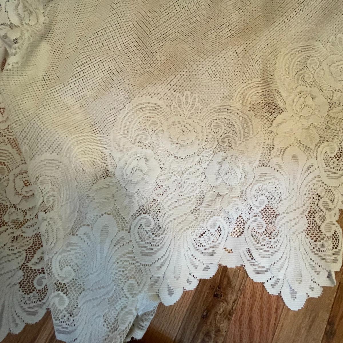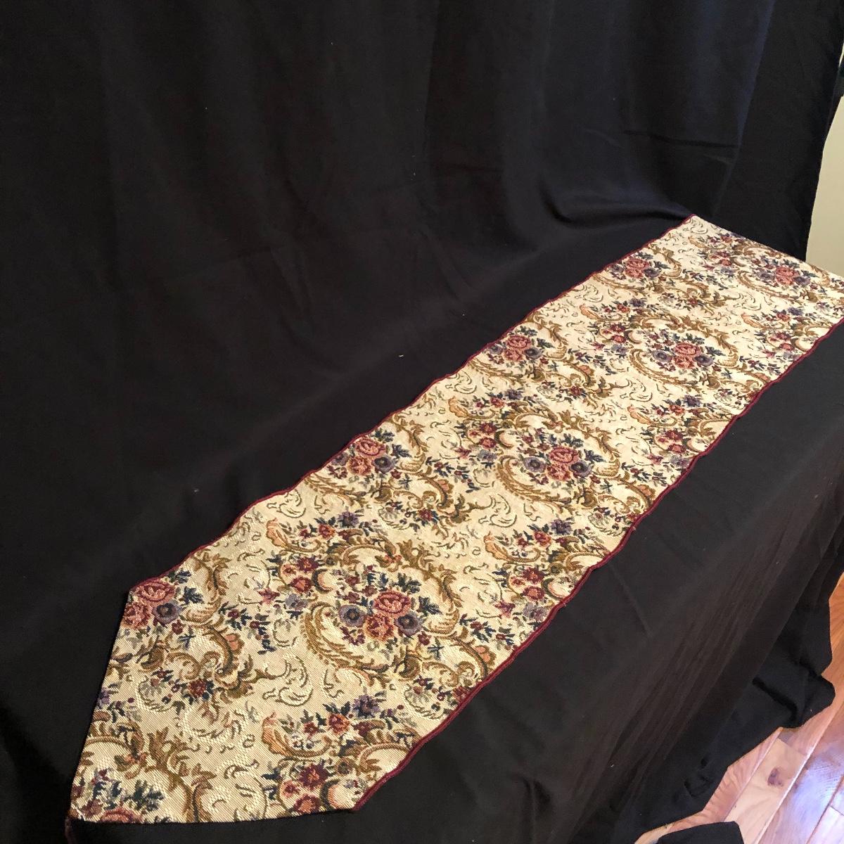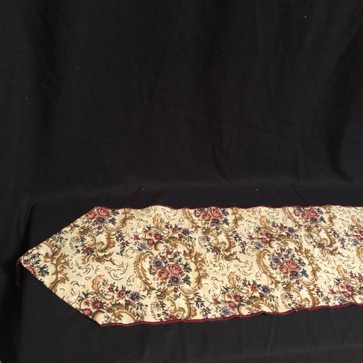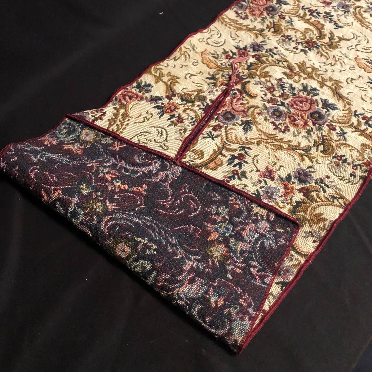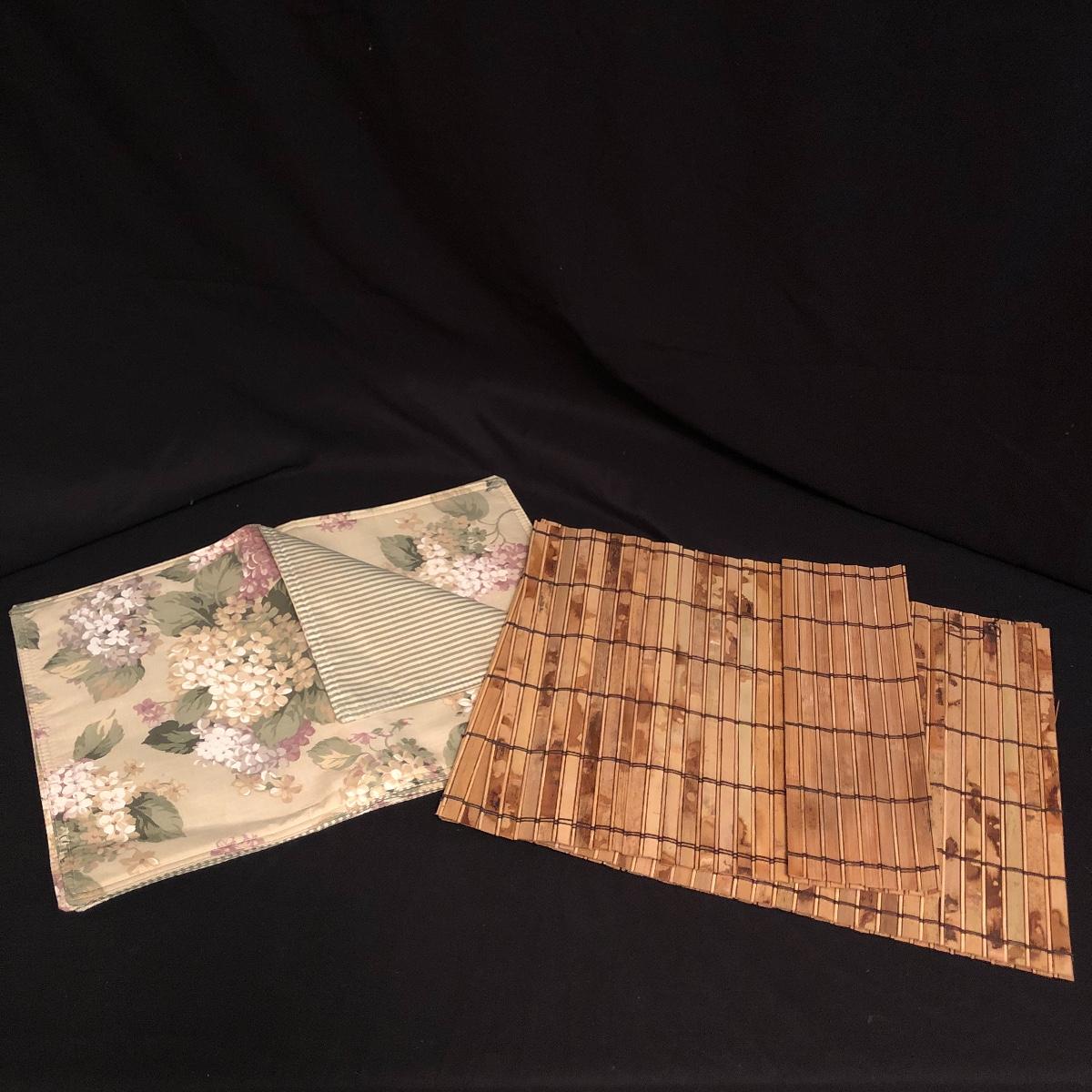 This collection of linens contains a mix of long curtains and valences. Four matching knit valences are about 61” long and 18” tall. The other valence set has two 22” tall valences, one is 67” long and the other is double about 135”long. Full curtains include a beautiful cream colored with the pleated top measuring about 48” and about a 70” length. The striped curtain is about 54” x 84”. The table cloths are two are shades of pink and two are elegantly designed white. Lot also contains six sets of cloth napkins, six sets of place mats, and curtain hooks. Varieties of colors and styles.