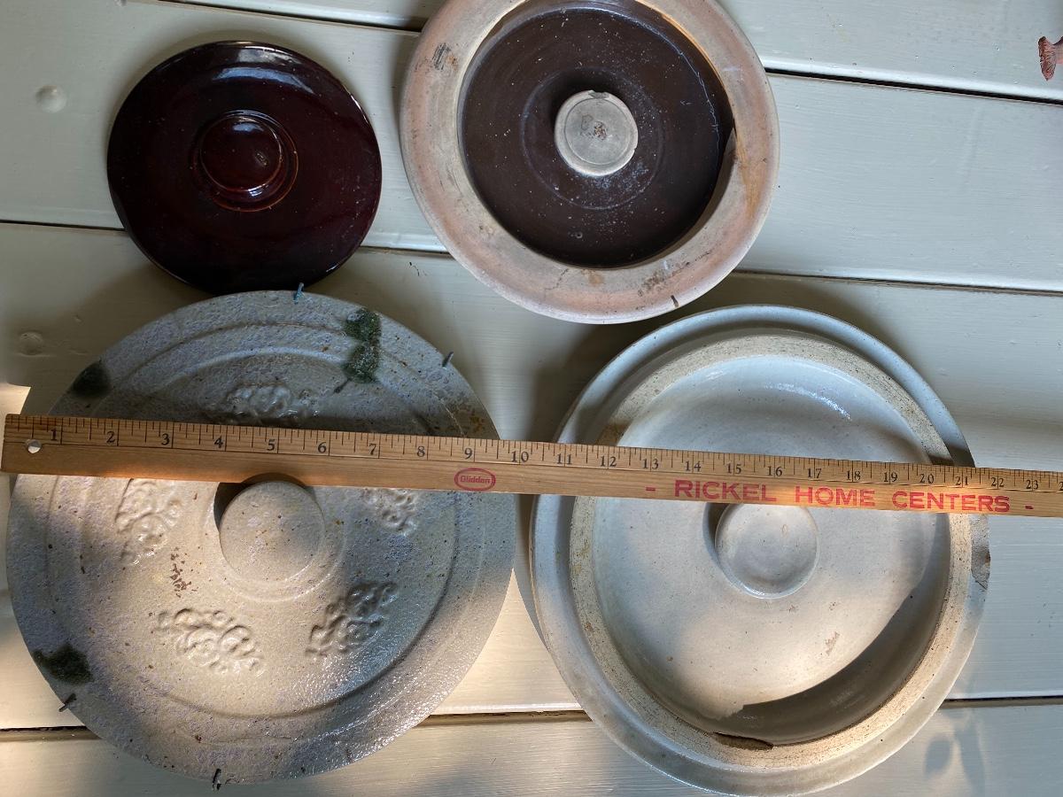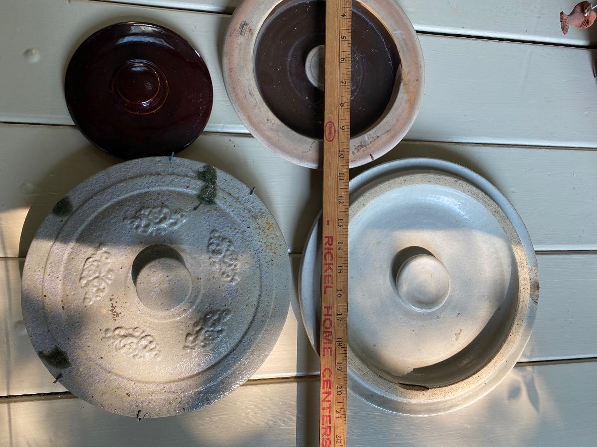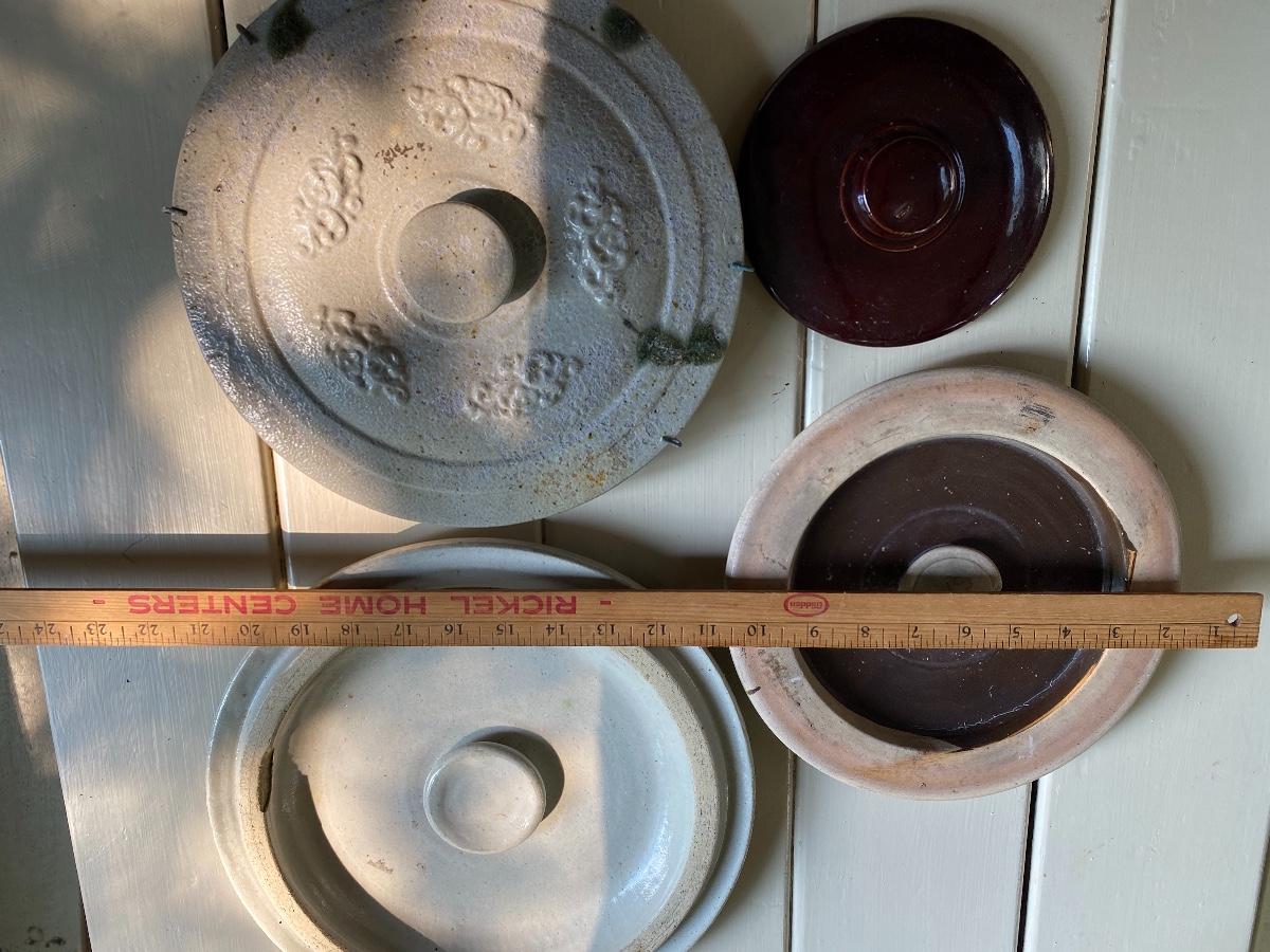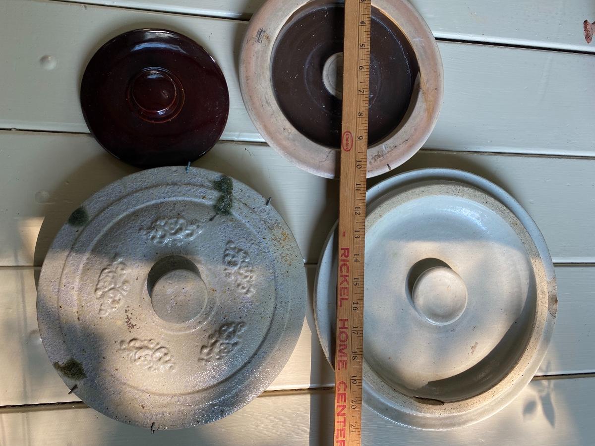 Antique Crock Lids used as wall art. Please see pictures as they are the best representation of the item, the condition of the item, and the size of the item.