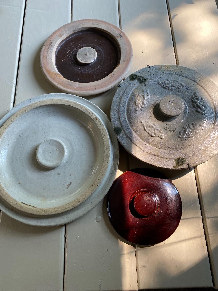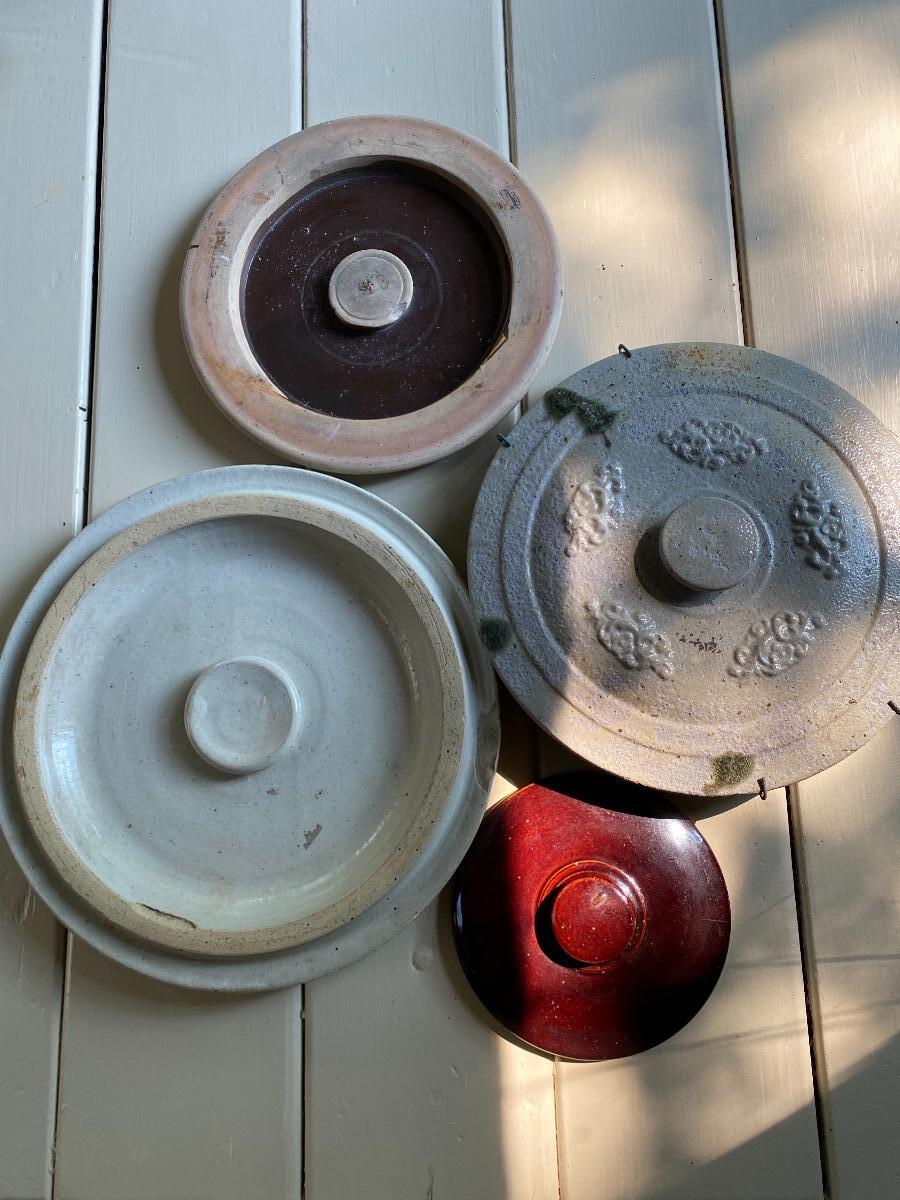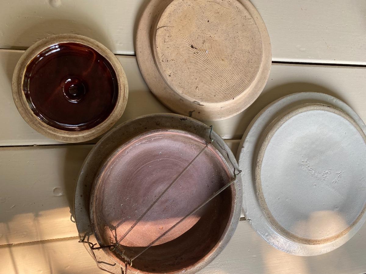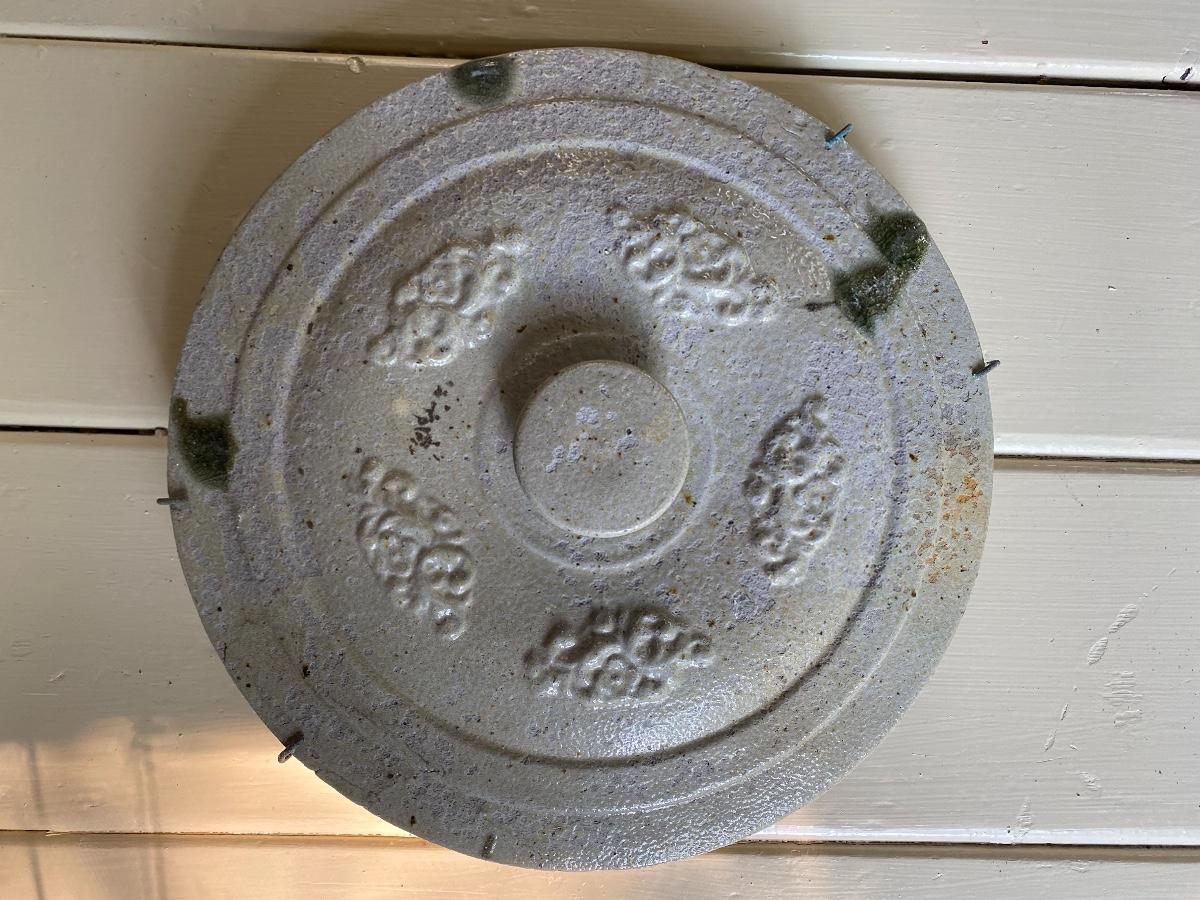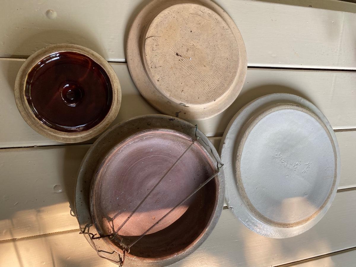 Antique Crock Lids used as wall art. Please see pictures as they are the best representation of the item, the condition of the item, and the size of the item.