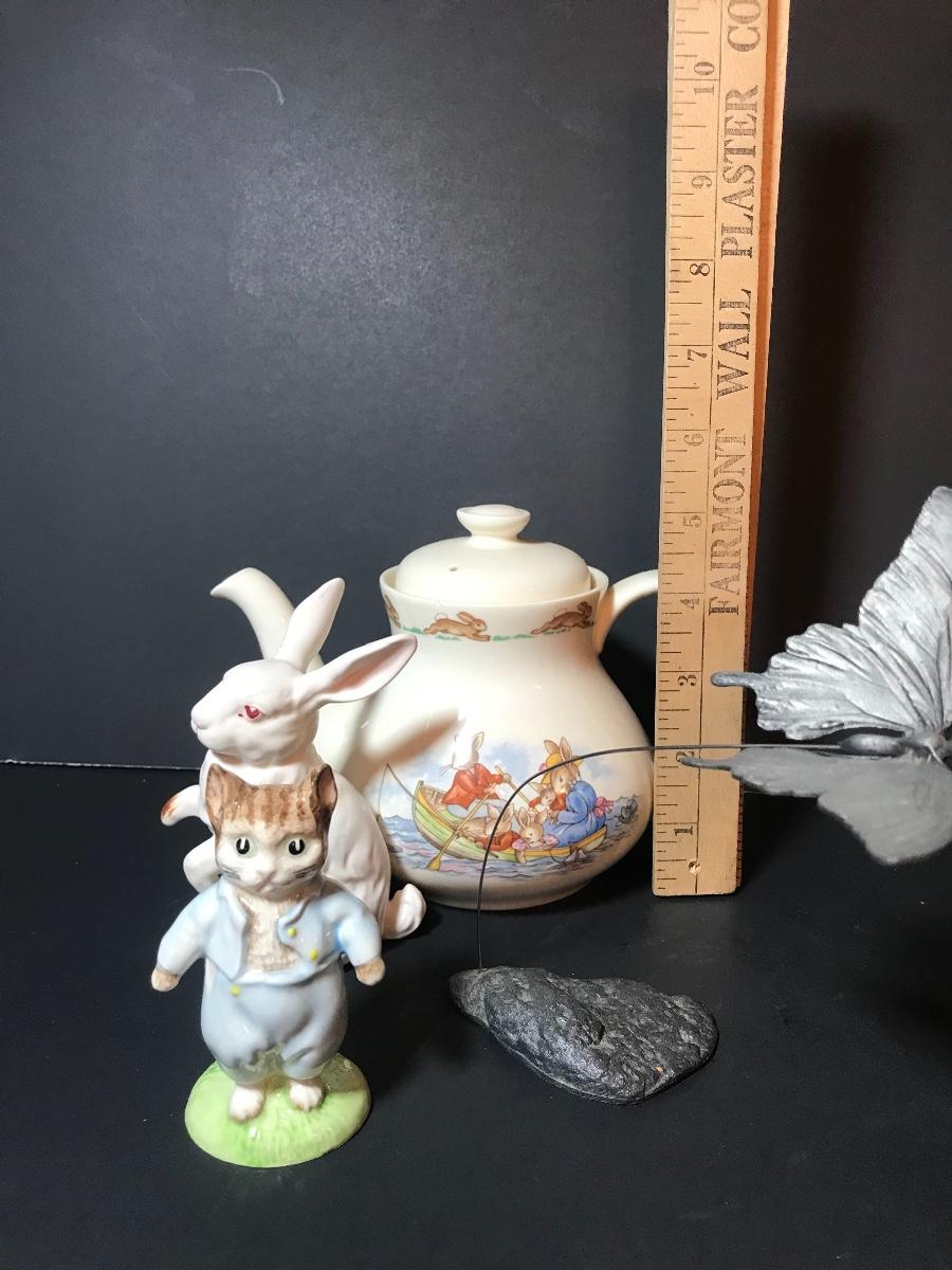 Royal Doulton, Bunnykins tea pot, Royal Albert, Beatrice Potter Tom Kitten, Lefton bunny and a Hudson Pewter butterfly. Please see all pictures as they are the best representation of the items. The pictures show condition, measurements if taken, and what is included in the lot. Due to the large amount that we photograph and the time frame, we are not always able to take measurements. All items unless noted, are pre-owned and have been used. If you purchased furniture, you must bring help. We do not allow one person to carry large furniture out on their own. Bring help, tools and a truck for the safety of our client’s homes, and your personal safety. Company policy. Thank you.