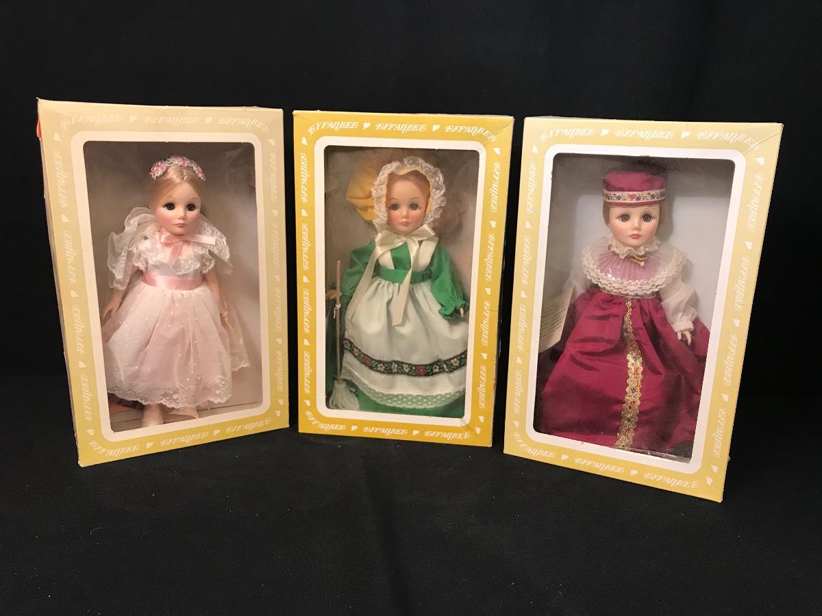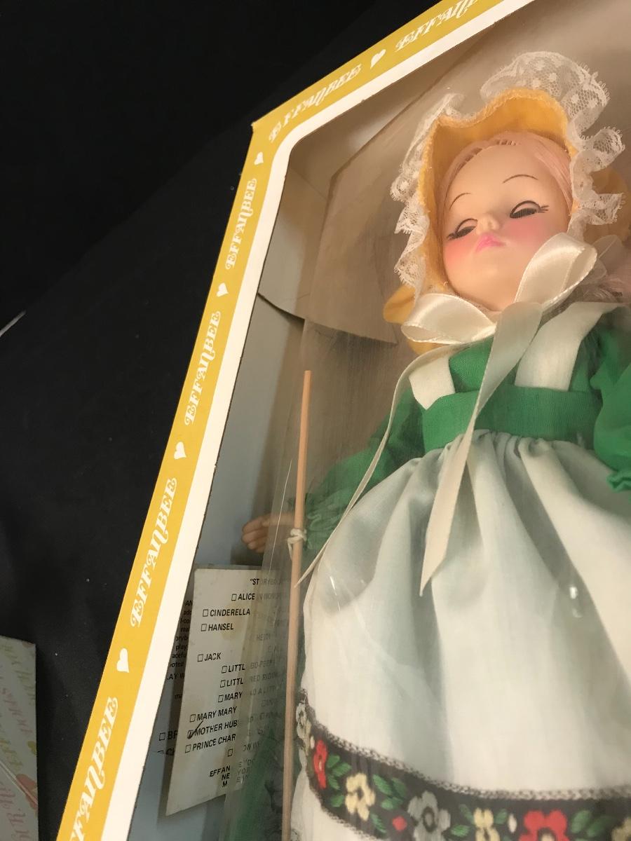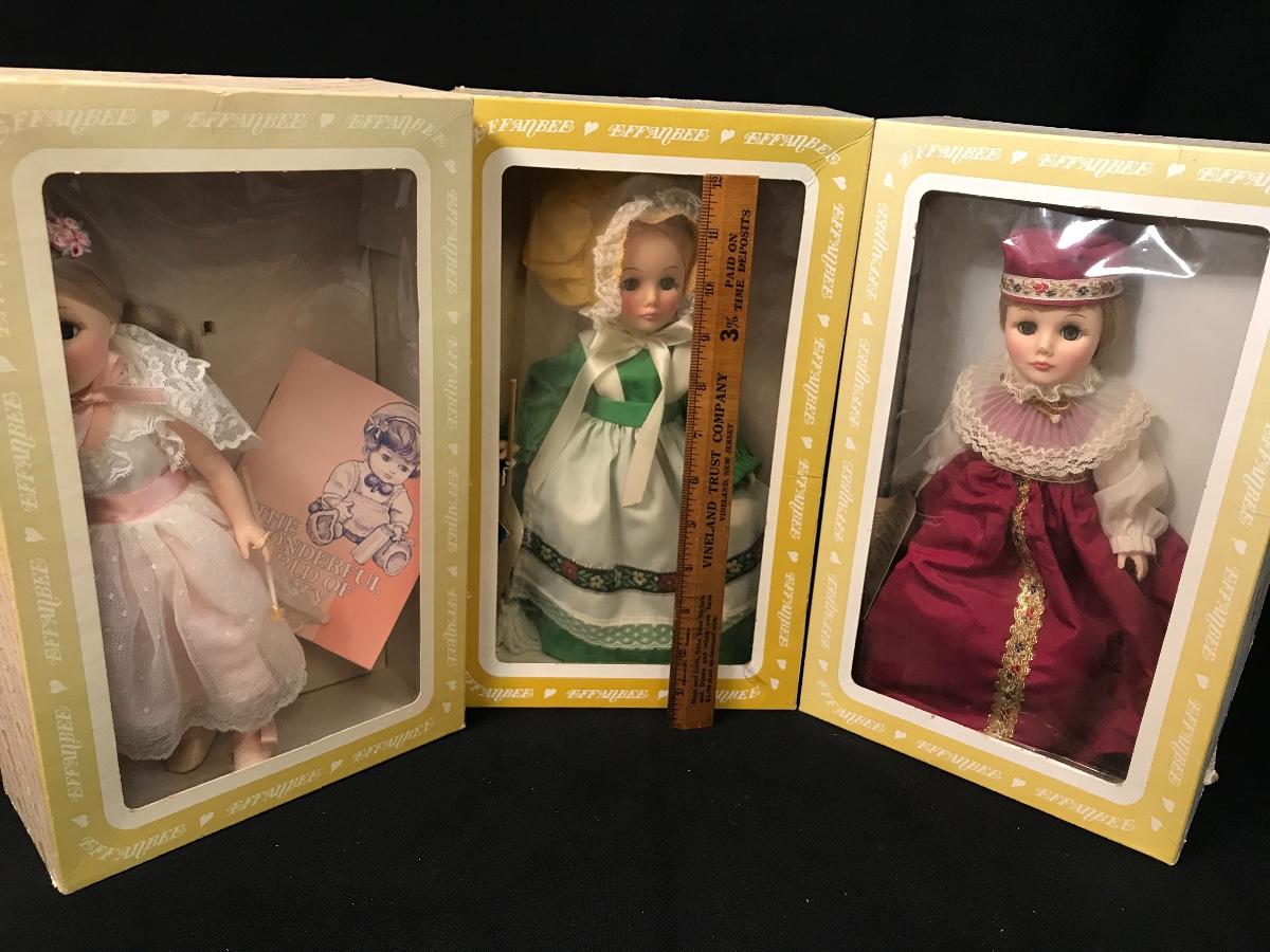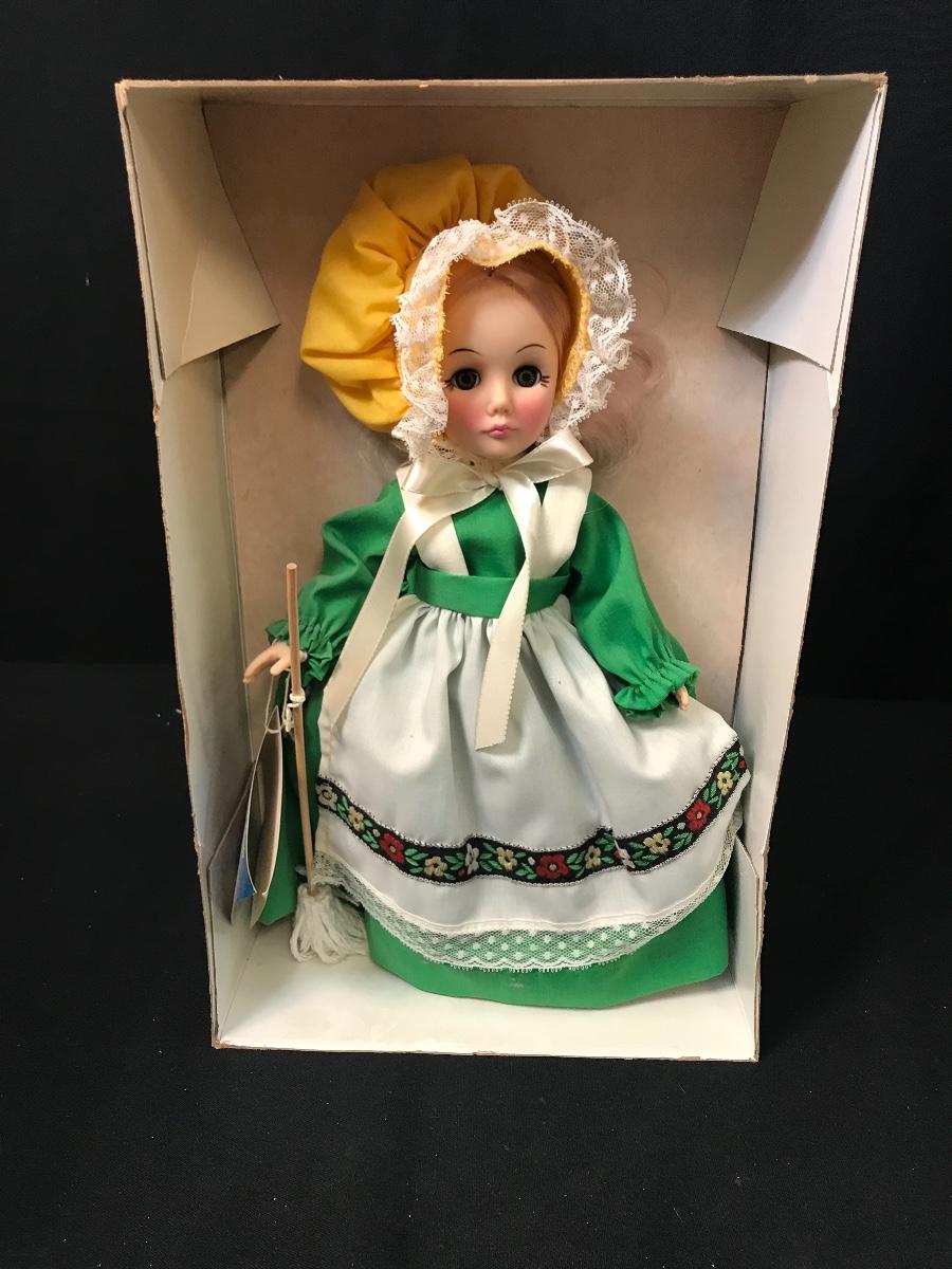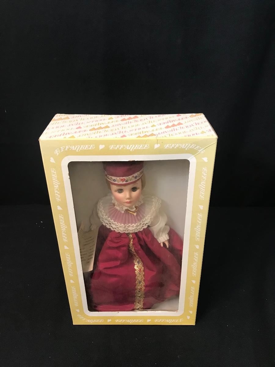 Three Effanbee Vintage Dolls - Sugar Plum Fairy, Mother Hubbard & Rapunzel. Dolls are largely in like new condition, Sugar Plum Fairy has been disconnected from packaging and one shoe is not completely on foot. Mother Hubbard and Rapunzel are still attached to internal packaging. Boxes show shelf wear and plastic film is coming away from cardboard in some places. Please see all pictures as they are the best representation of the items. The pictures show condition, measurements if taken, and what is included in the lot. Due to the large amount that we photograph and the time frame, we are not always able to take measurements. All items unless noted, are pre-owned and have been used. If you purchased furniture, you must bring help. We do not allow one person to carry large furniture out on their own. Bring help, tools and a truck for the safety of our client’s homes, and your personal safety. Company policy. Thank you.