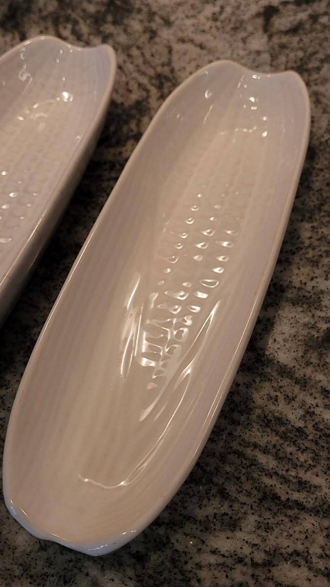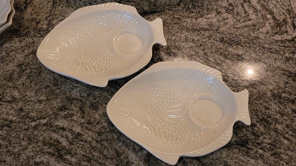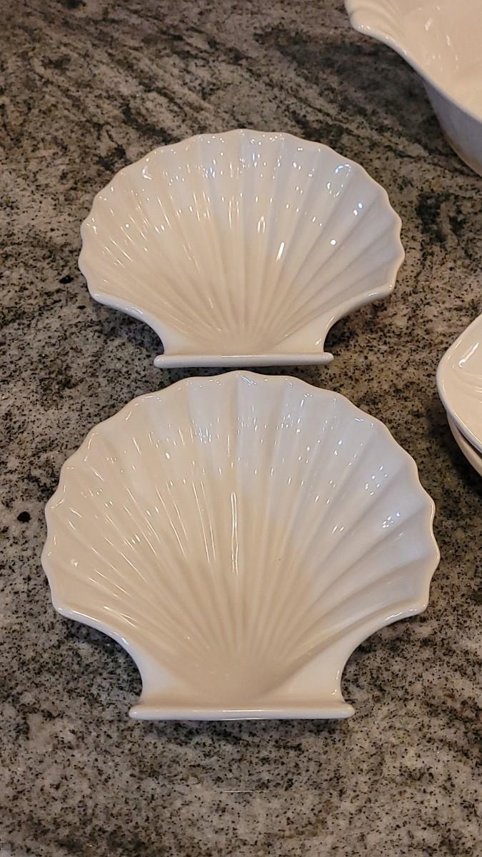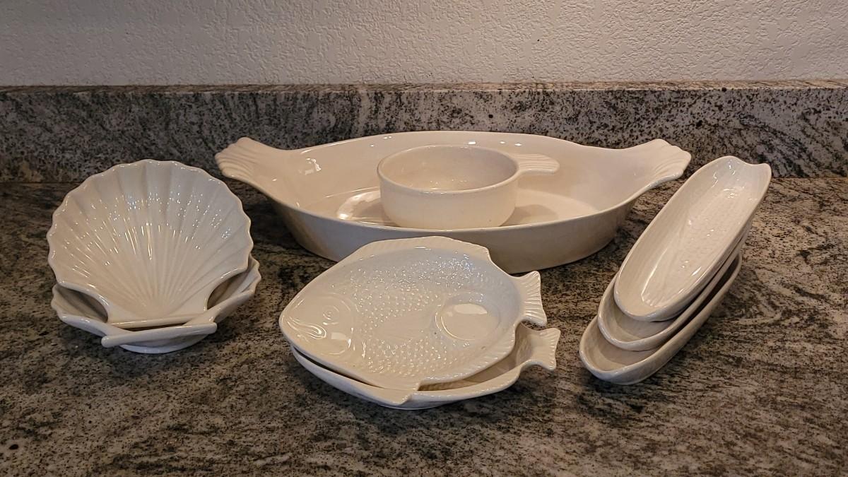 Casserole Dish (marked), Bowl, (2) Fish Plates (marked), (3) Corn Plates, (2) Shell Dishes. All matching glazes.