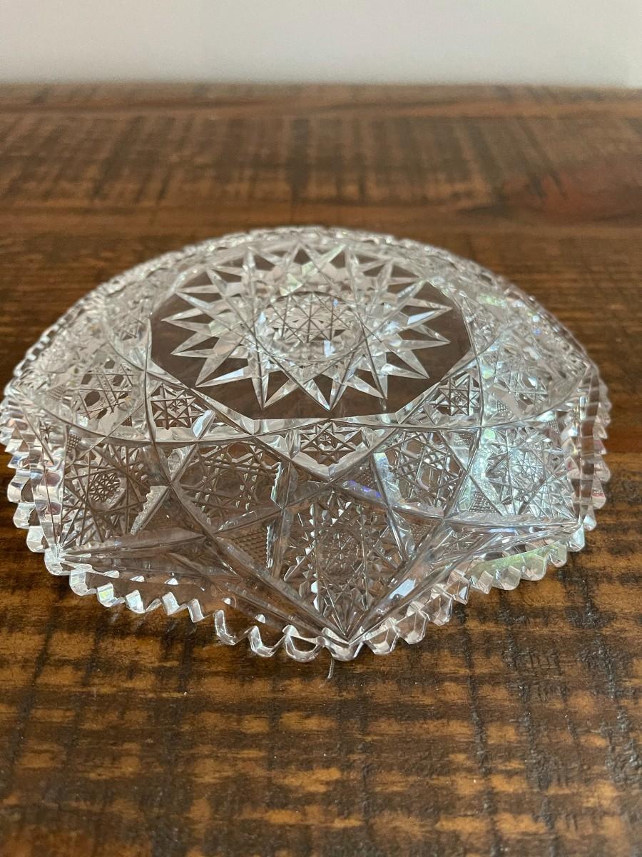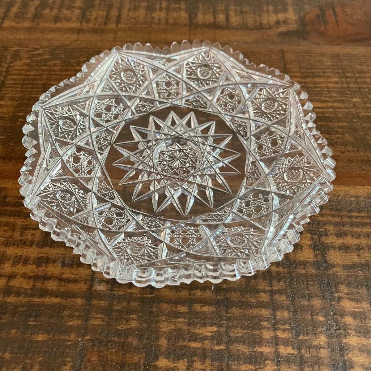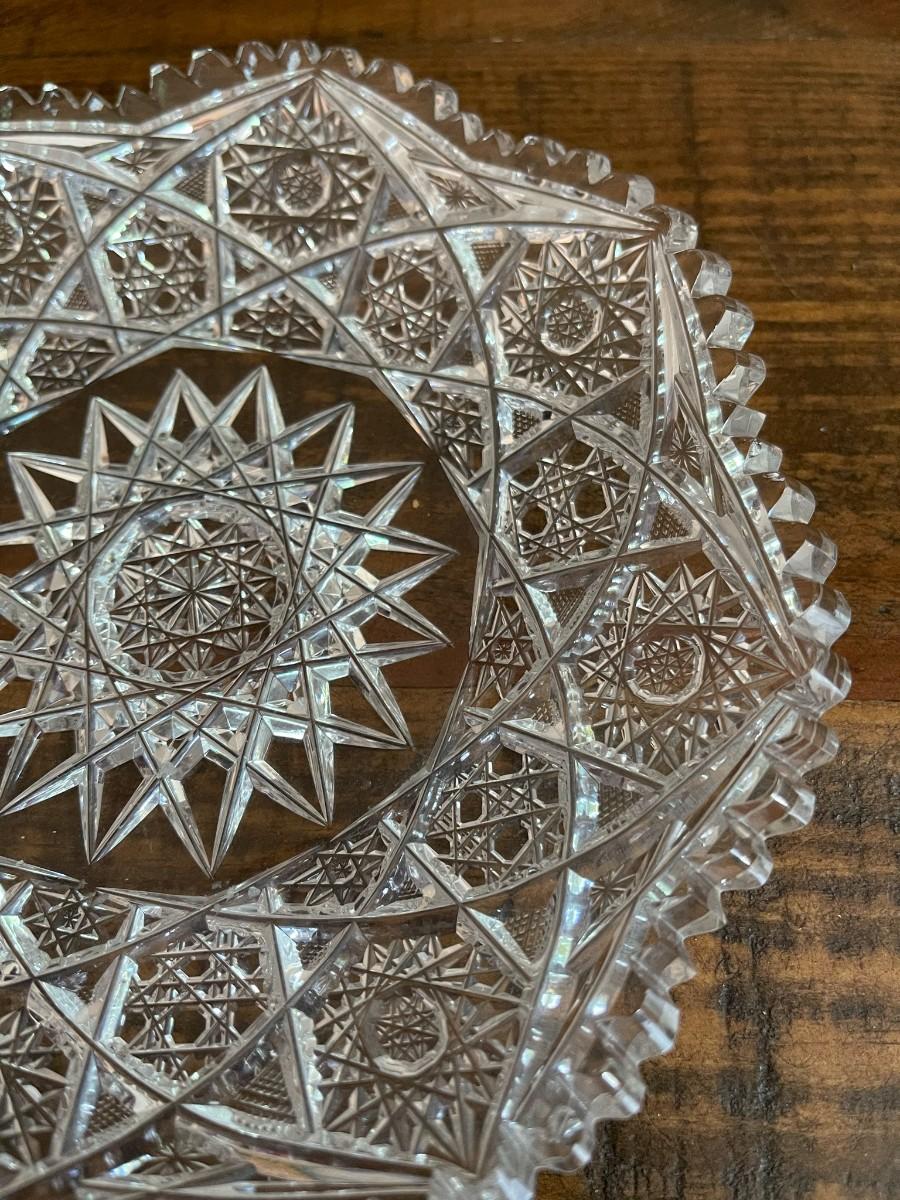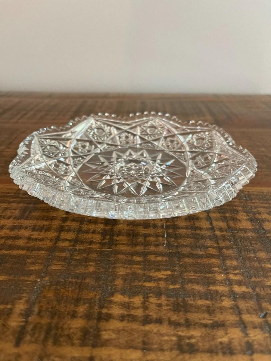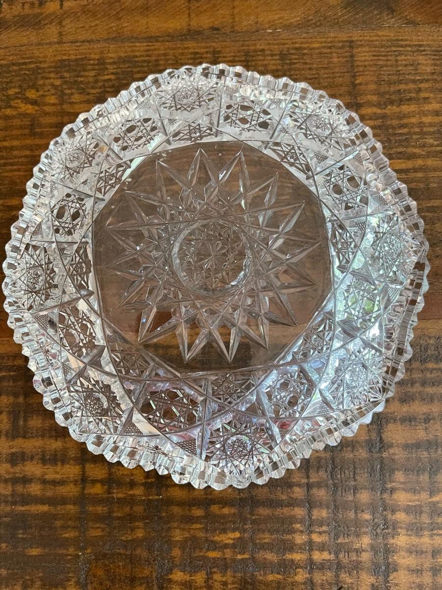 American Cut Glass Plate perfect for desserts or display. Great condition. Cut geometric pattern, scalloped edges/rim.