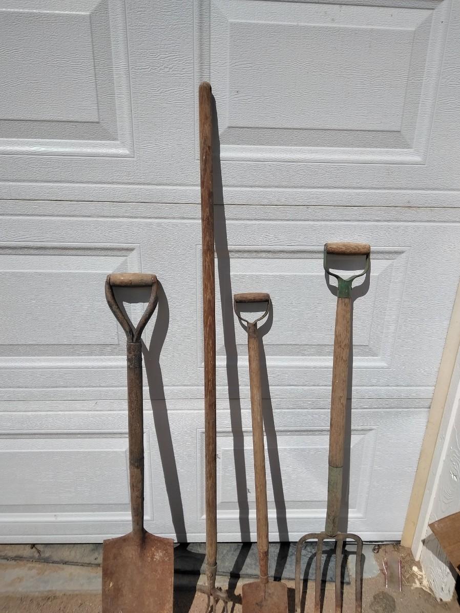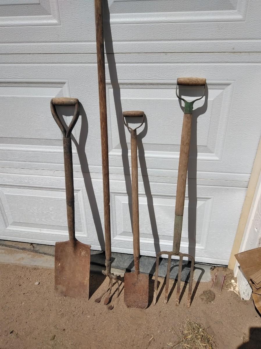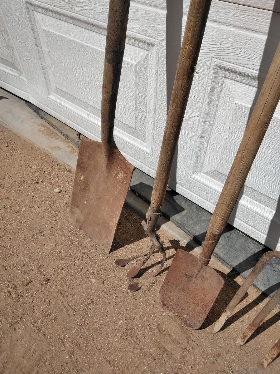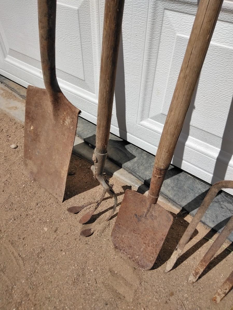 ANTIQUE FARM HAND TOOLS INCLUDING A NEAT LITTLE OLD SHOVEL, A SQUARE SHOVEL, PITCHFORK, AND GARDEN HOE.