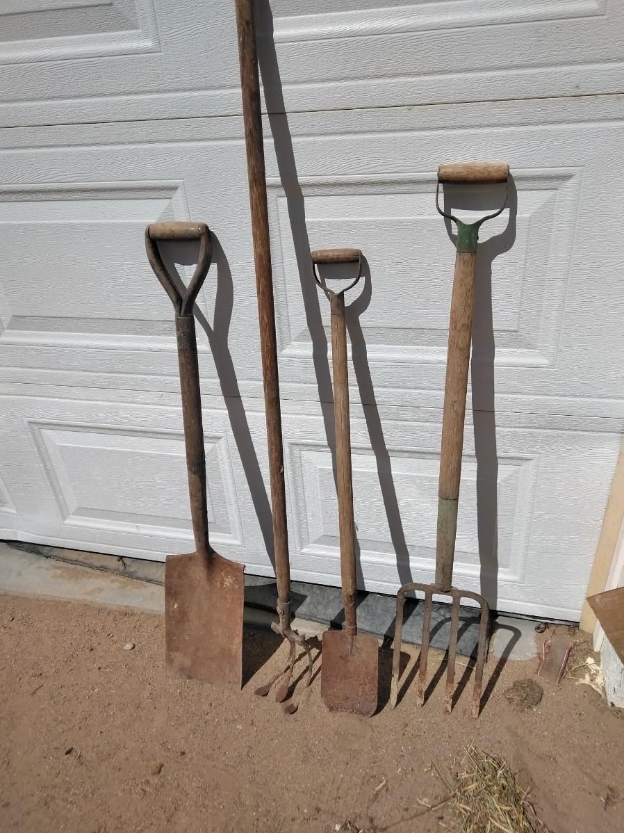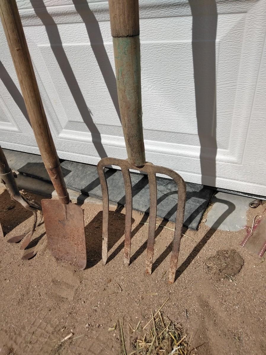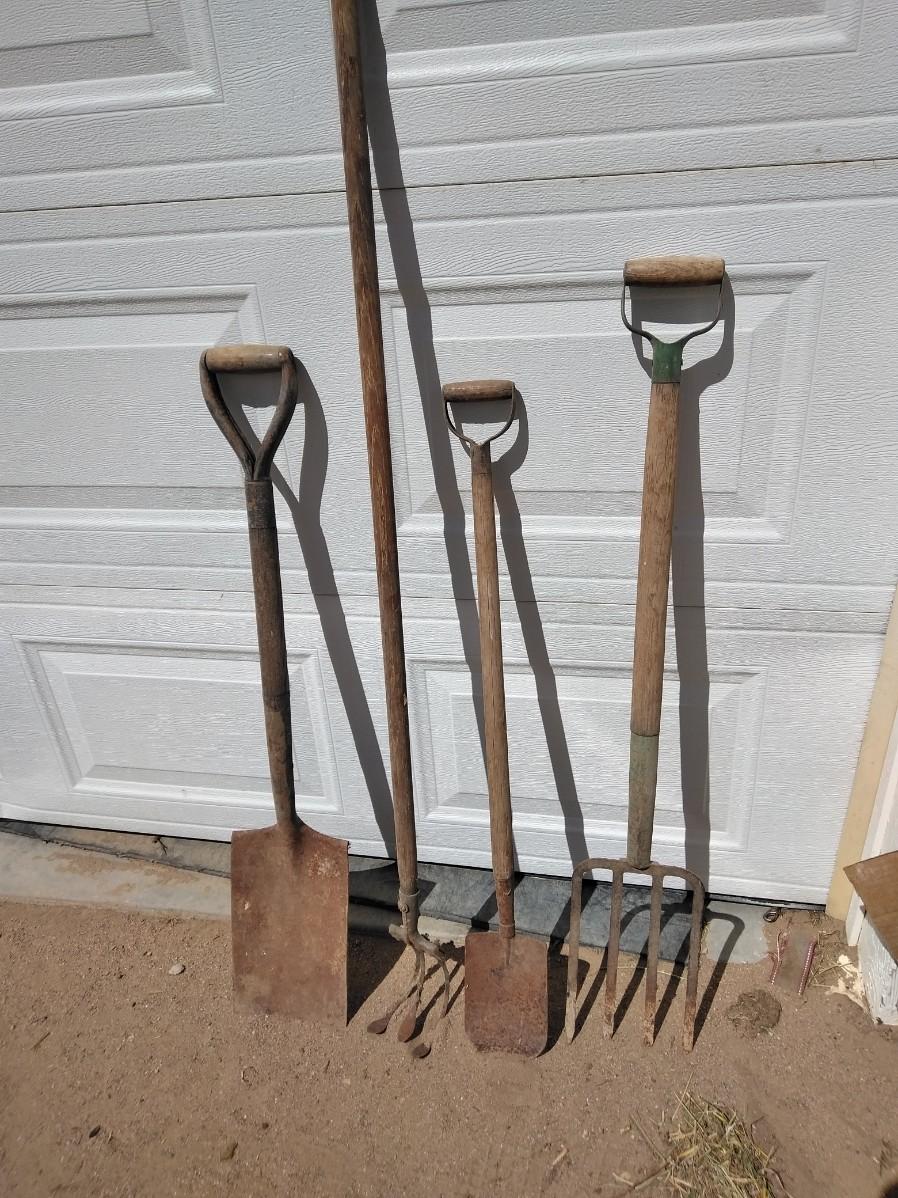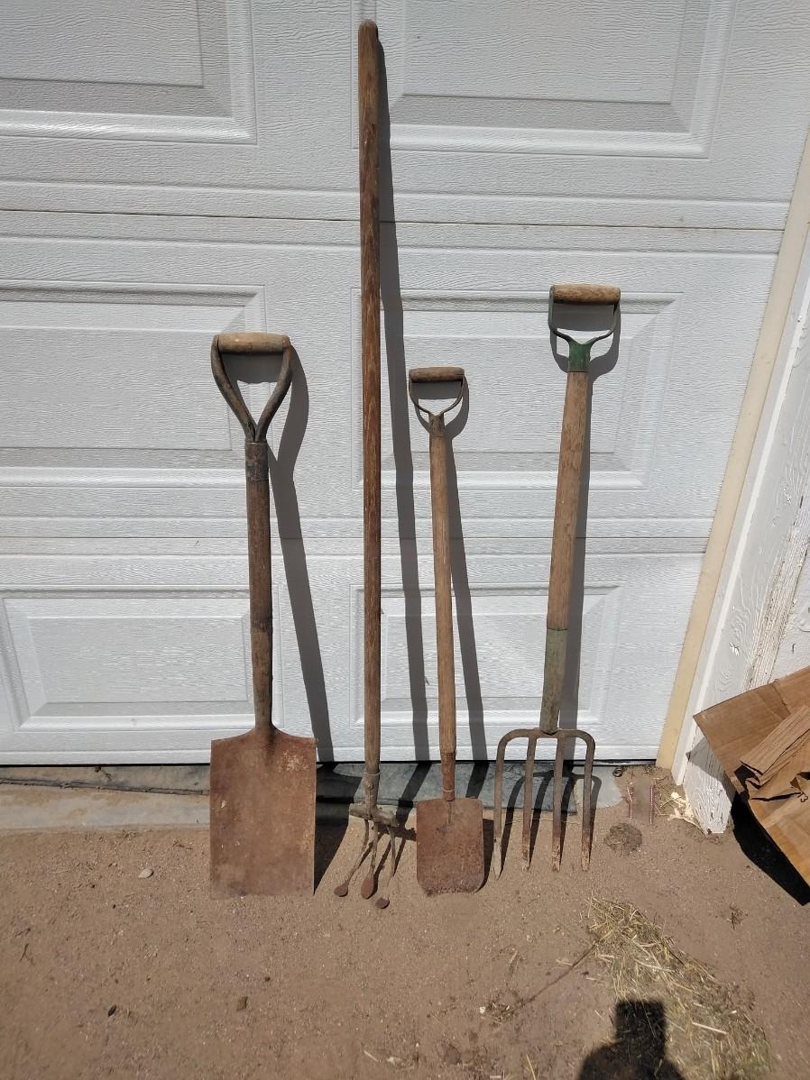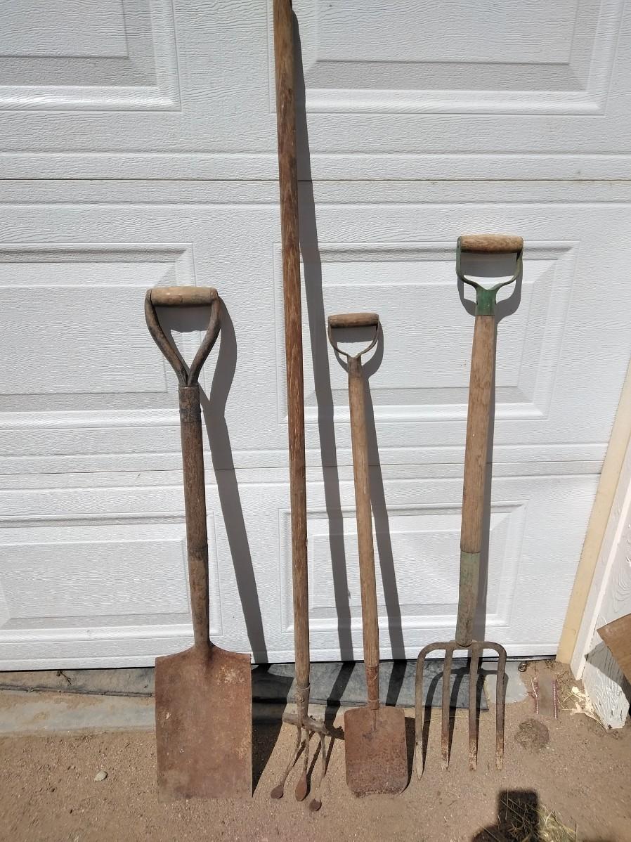 ANTIQUE FARM HAND TOOLS INCLUDING A NEAT LITTLE OLD SHOVEL, A SQUARE SHOVEL, PITCHFORK, AND GARDEN HOE.