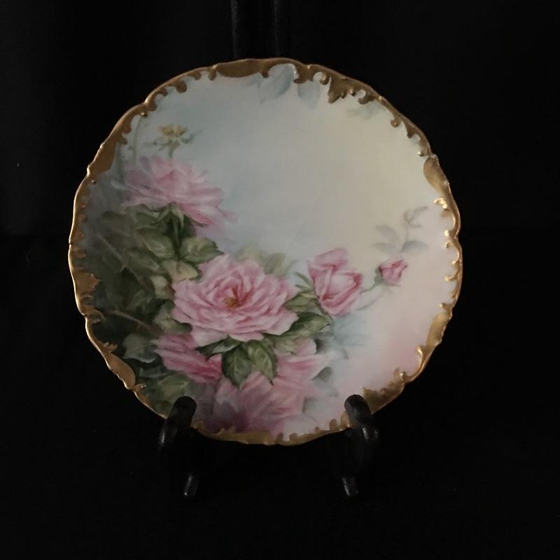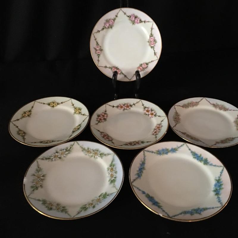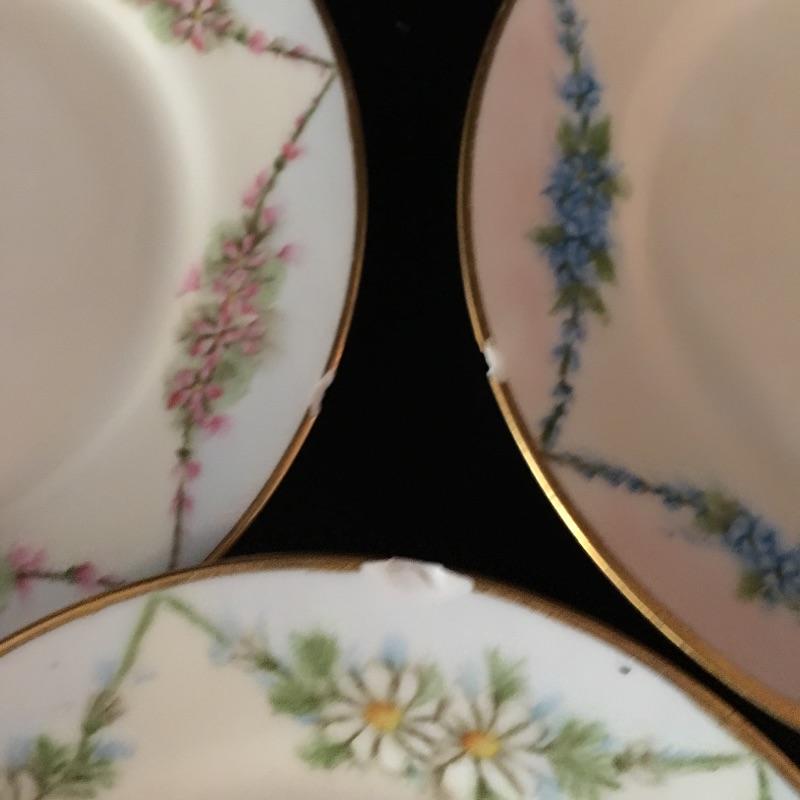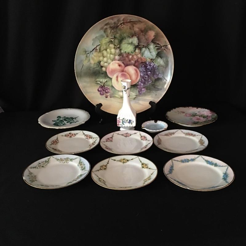 A lovely assortment of china, some French and English pieces here. Included in this lot is a small Ansley vase, Limoges plate, Bavarian plate, six Nippon hand painted plates, Shelley ash tray and unmarked large plate. Three small plates have chips, see pictures. Largest plate measures 13.5”D.
