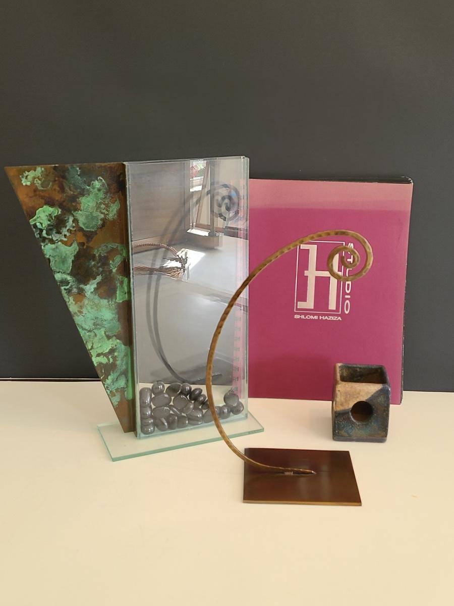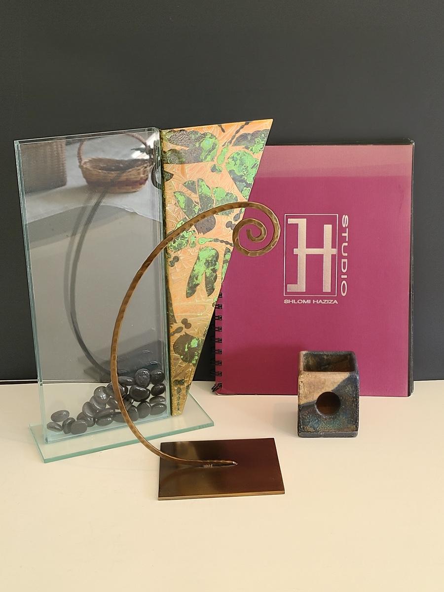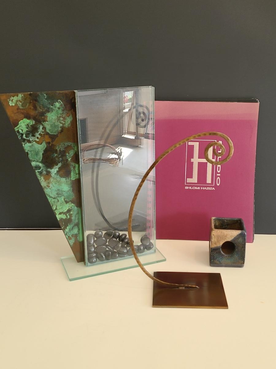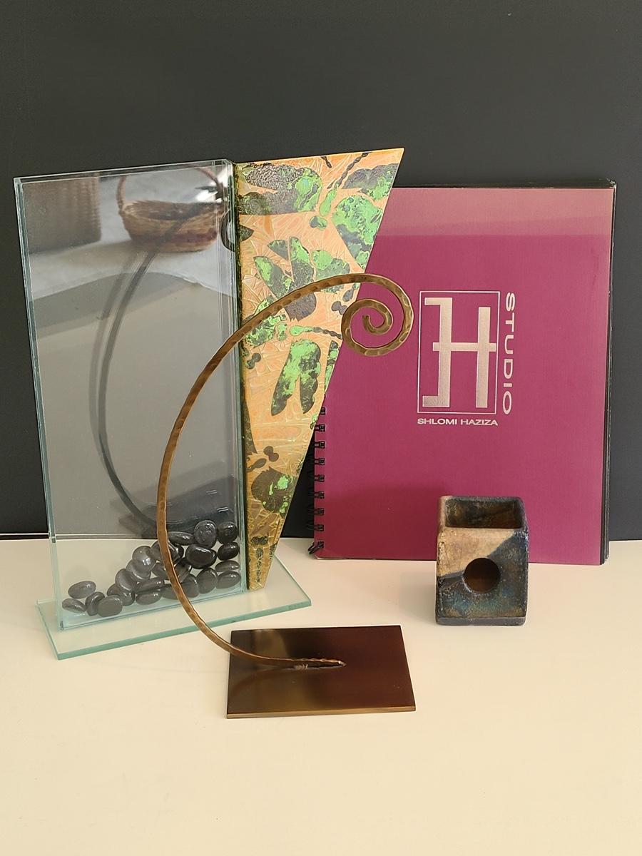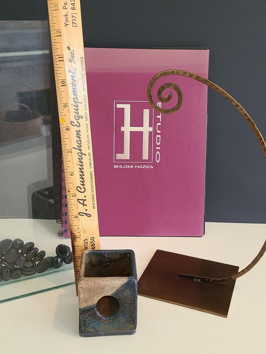 Sharp, unique lines on a stunning glass vase. This unique angled vase is made of metal and glass. The back of the metal does show some wear. Also included is a studio book for artist Shlomi Haziza, and artist made metal hook for ornament hanging, and small pottery tea light holder with peep window. Fun collection of artists works. Please see all pictures for content of the lot, condition of the lot, and measurements if taken. Pictures are the best representation of the items listed and items are untested unless indicated in description. Thank you for looking and have fun bidding![