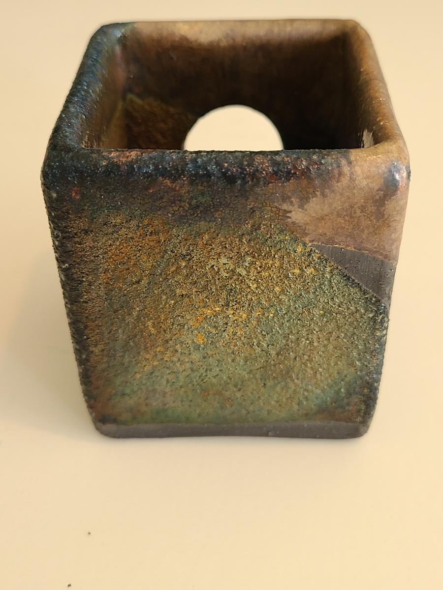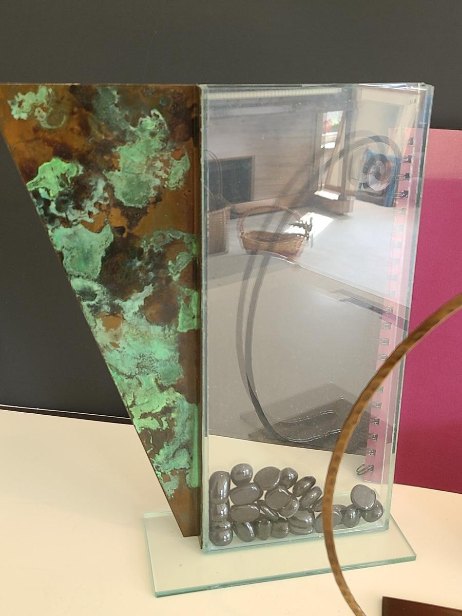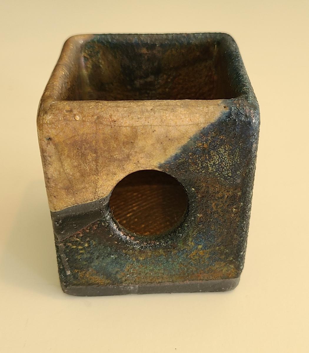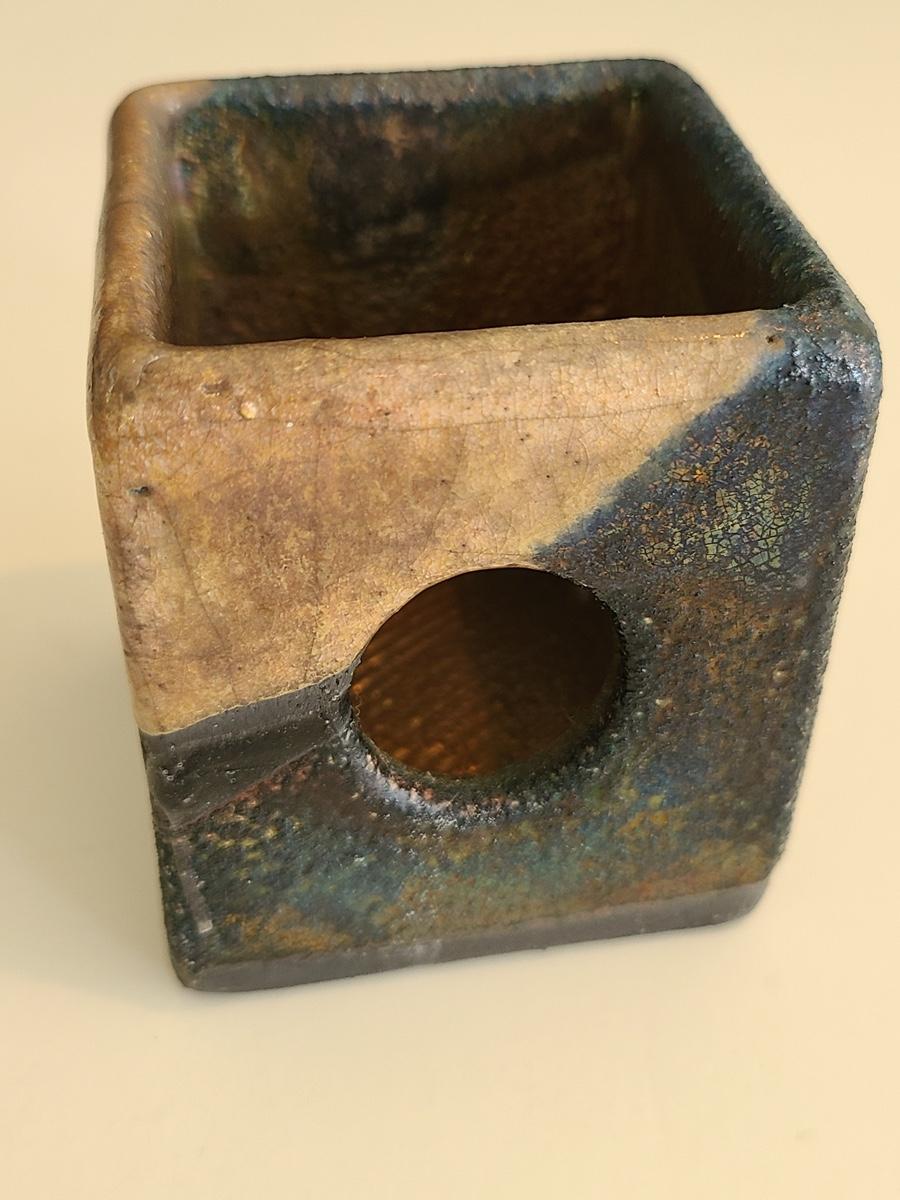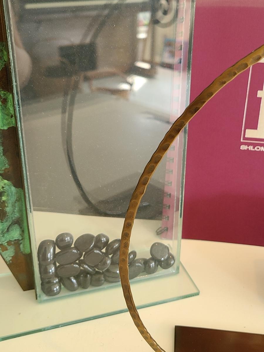 Sharp, unique lines on a stunning glass vase. This unique angled vase is made of metal and glass. The back of the metal does show some wear. Also included is a studio book for artist Shlomi Haziza, and artist made metal hook for ornament hanging, and small pottery tea light holder with peep window. Fun collection of artists works. Please see all pictures for content of the lot, condition of the lot, and measurements if taken. Pictures are the best representation of the items listed and items are untested unless indicated in description. Thank you for looking and have fun bidding![