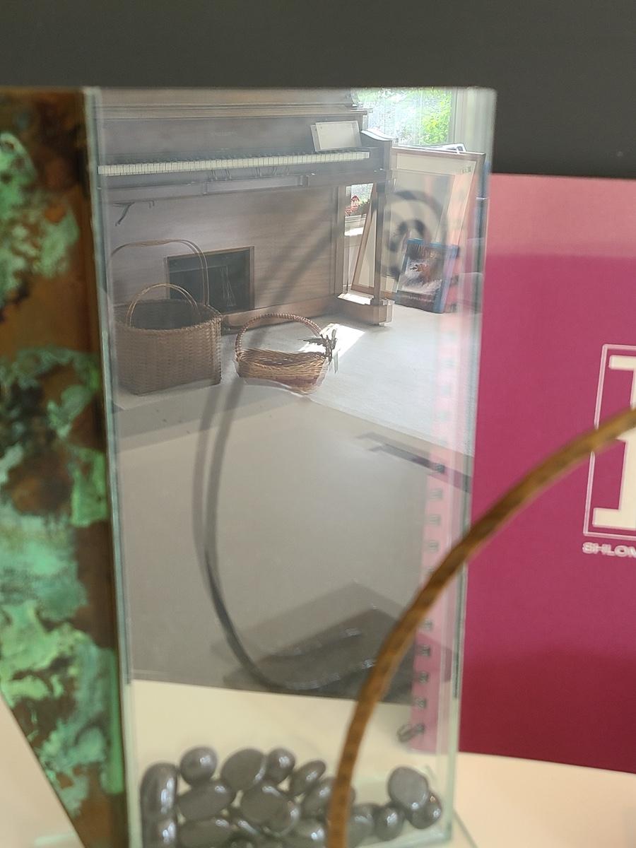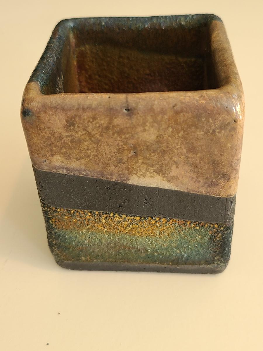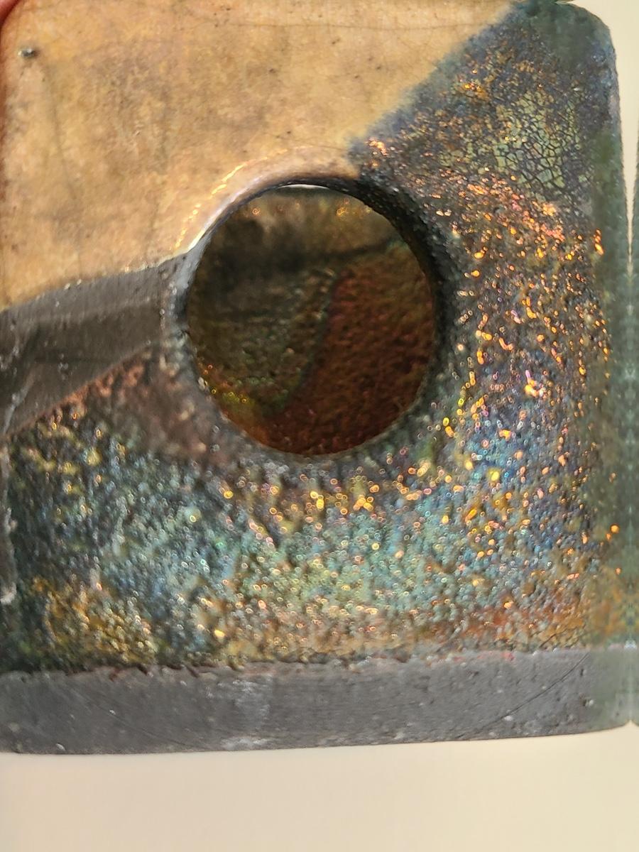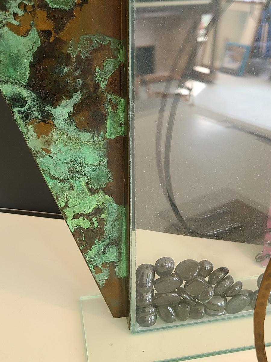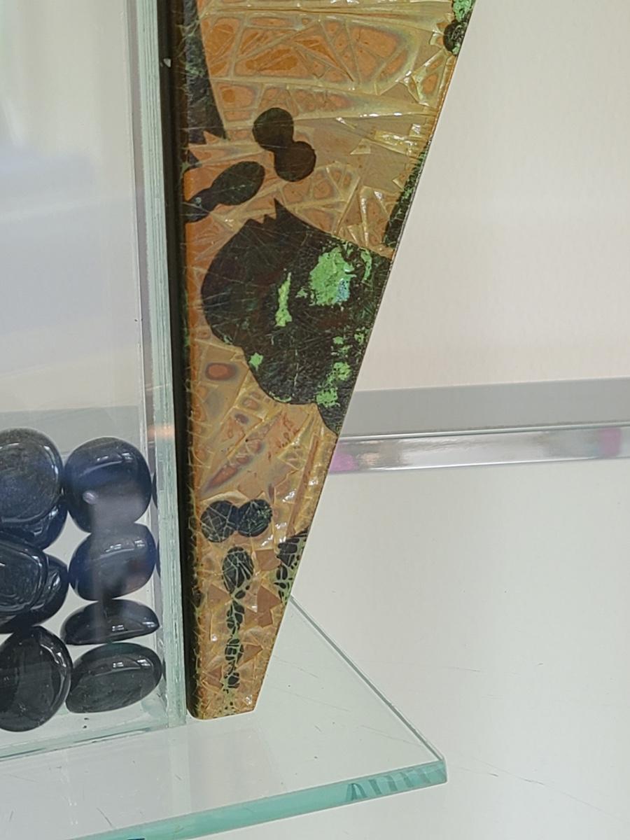 Sharp, unique lines on a stunning glass vase. This unique angled vase is made of metal and glass. The back of the metal does show some wear. Also included is a studio book for artist Shlomi Haziza, and artist made metal hook for ornament hanging, and small pottery tea light holder with peep window. Fun collection of artists works. Please see all pictures for content of the lot, condition of the lot, and measurements if taken. Pictures are the best representation of the items listed and items are untested unless indicated in description. Thank you for looking and have fun bidding![