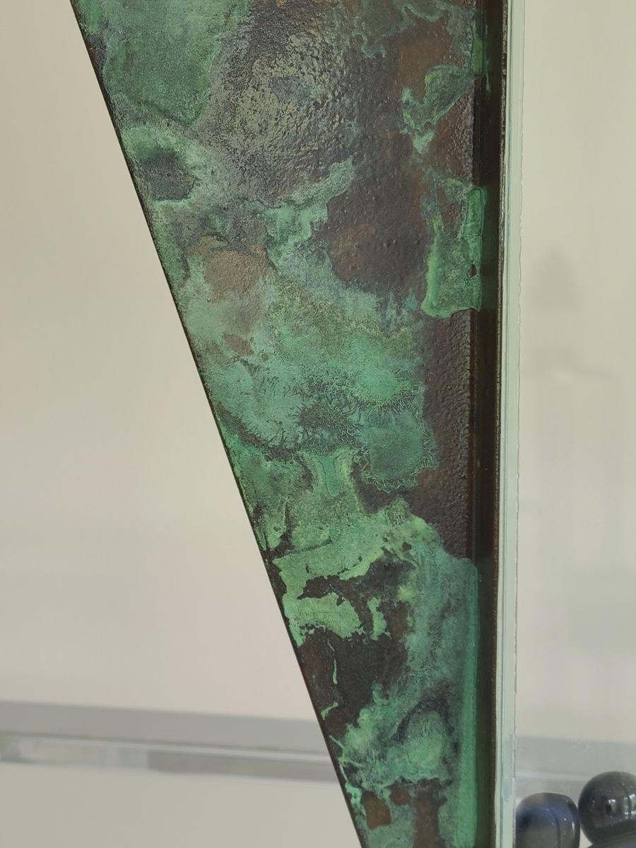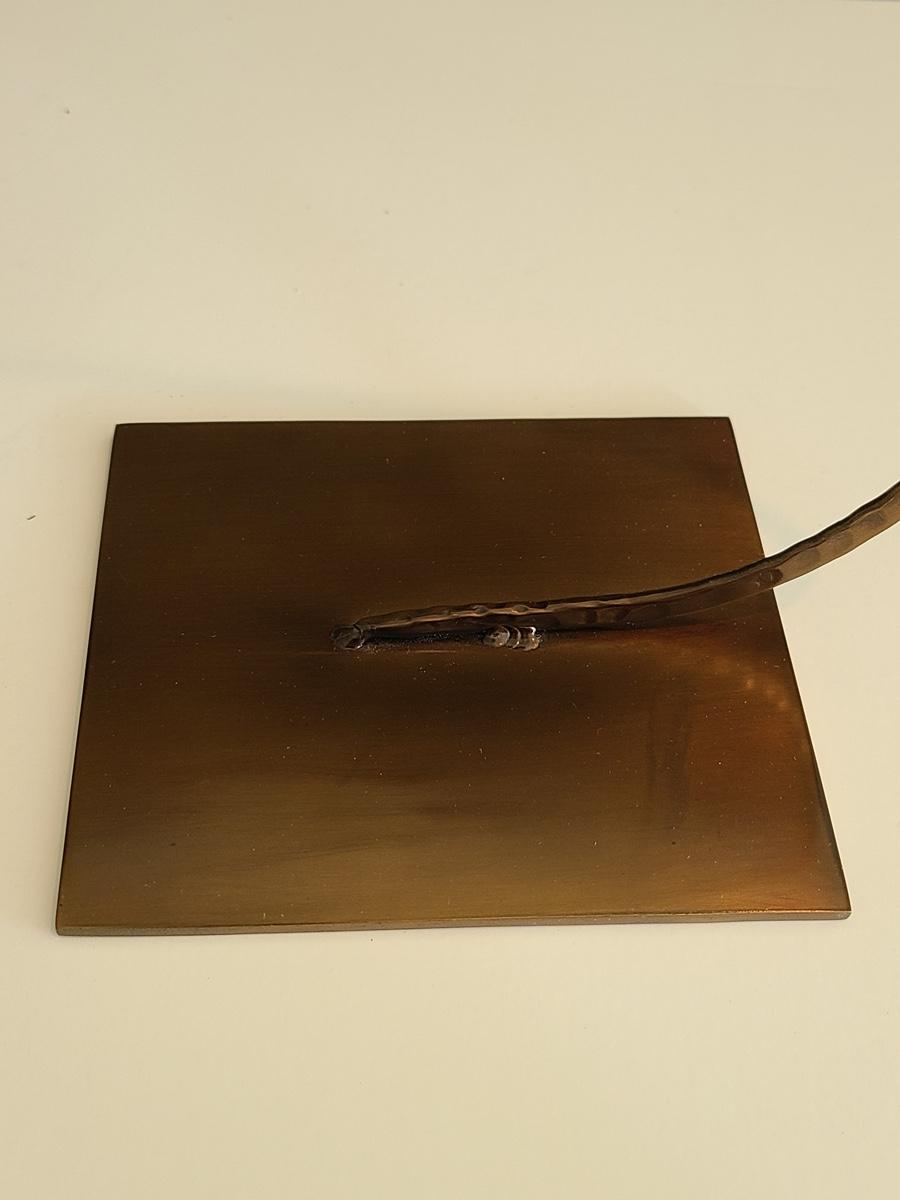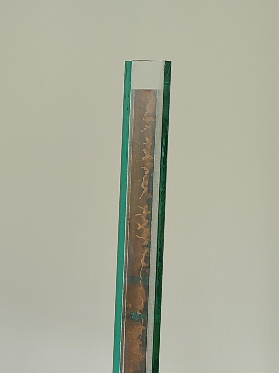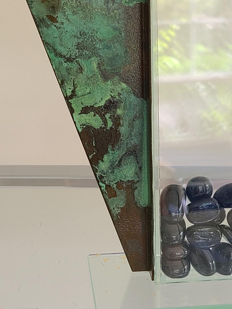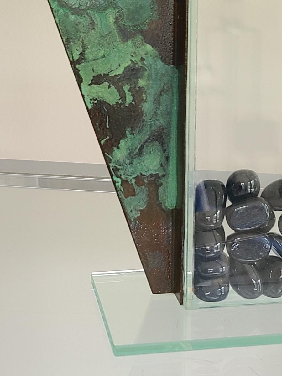 Sharp, unique lines on a stunning glass vase. This unique angled vase is made of metal and glass. The back of the metal does show some wear. Also included is a studio book for artist Shlomi Haziza, and artist made metal hook for ornament hanging, and small pottery tea light holder with peep window. Fun collection of artists works. Please see all pictures for content of the lot, condition of the lot, and measurements if taken. Pictures are the best representation of the items listed and items are untested unless indicated in description. Thank you for looking and have fun bidding![