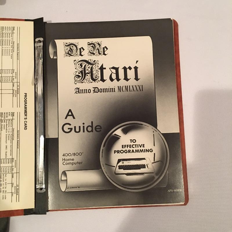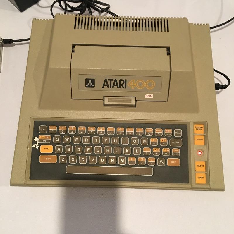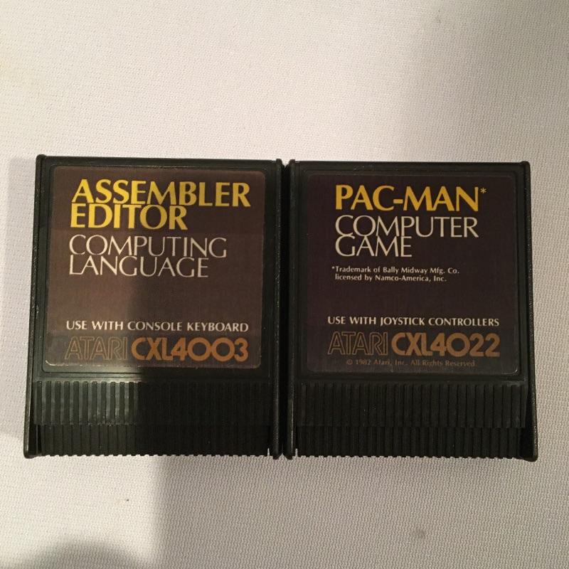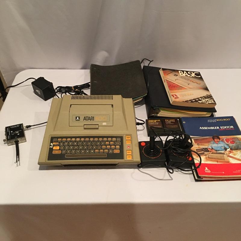 Atari 400 computer game console with two controllers, PacMan game, basic computing language cartridge, assembler editor cartridge, switch box, operating manual and more books on Atari. Unit powers on but was not tested. Get ready for some old school gaming and programming with this classic.