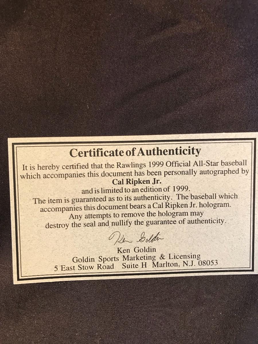 Autographed Baseball Cal Ripken Jr. All-Star COA Baltimore Orioles. The pictures show condition, measurements if taken, and what is included in the lot. Due to the large amount that we photograph and the time frame, we are not always able to take measurements. All items unless noted, are pre-owned and have been used. If you purchased furniture, you must bring help. We do not allow one person to carry large furniture out on their own. Bring help, tools and a truck for the safety of our client’s homes, and your personal safety. Company policy. Thank you.