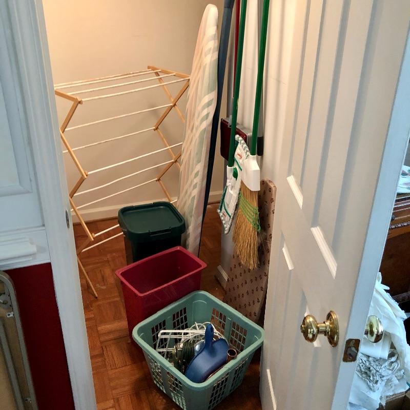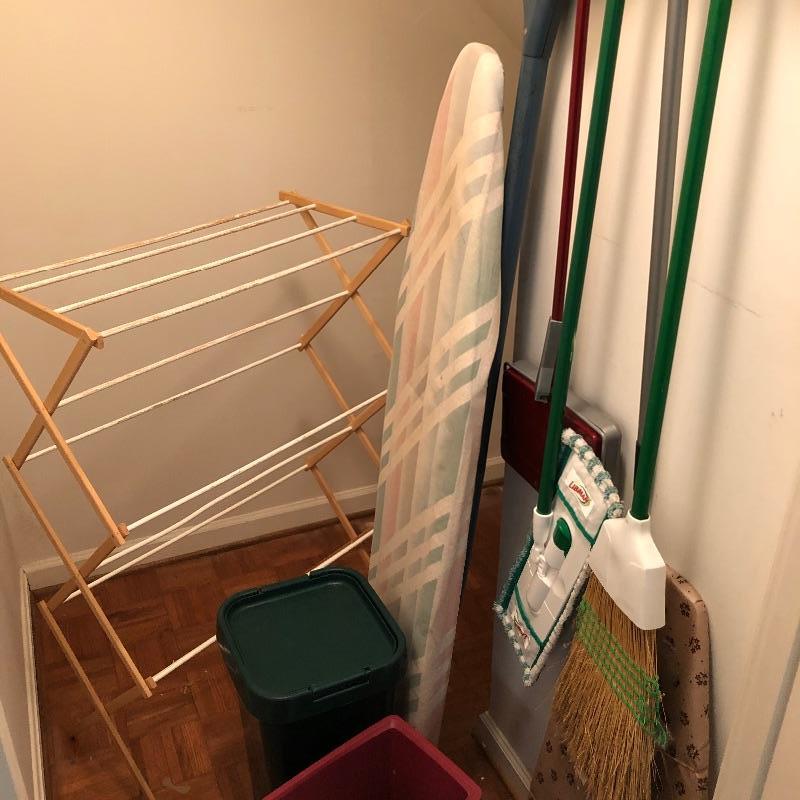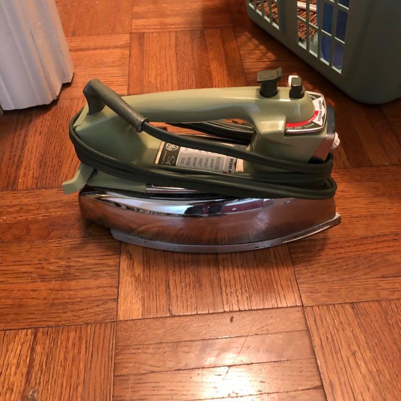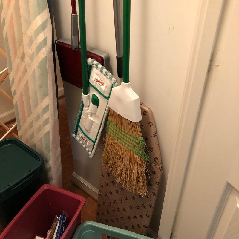 Plenty of useful items for your home here. Lot Includes a retro vintage avocado green iron that still works, ironing board, mop, broom and much more, see images.