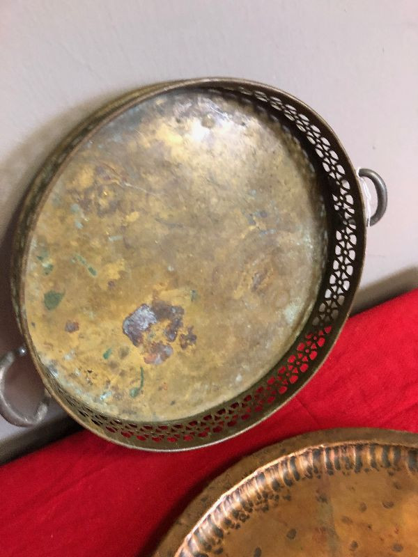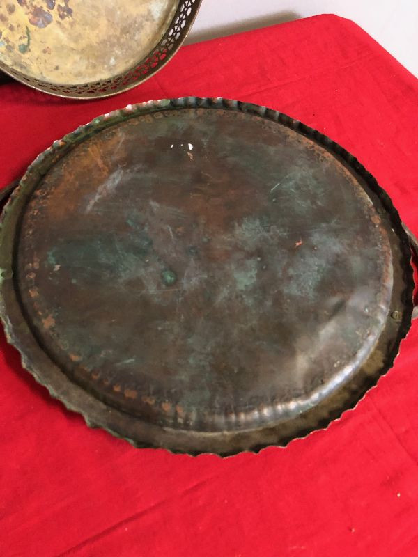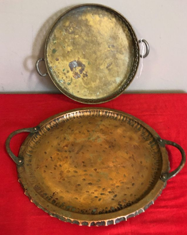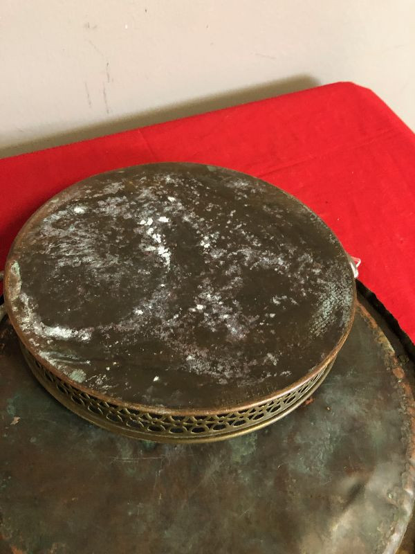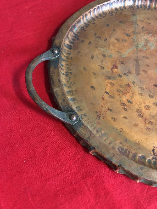 Antique - shows wear, hammered copper 13 and 10" Patina of age