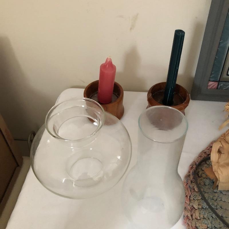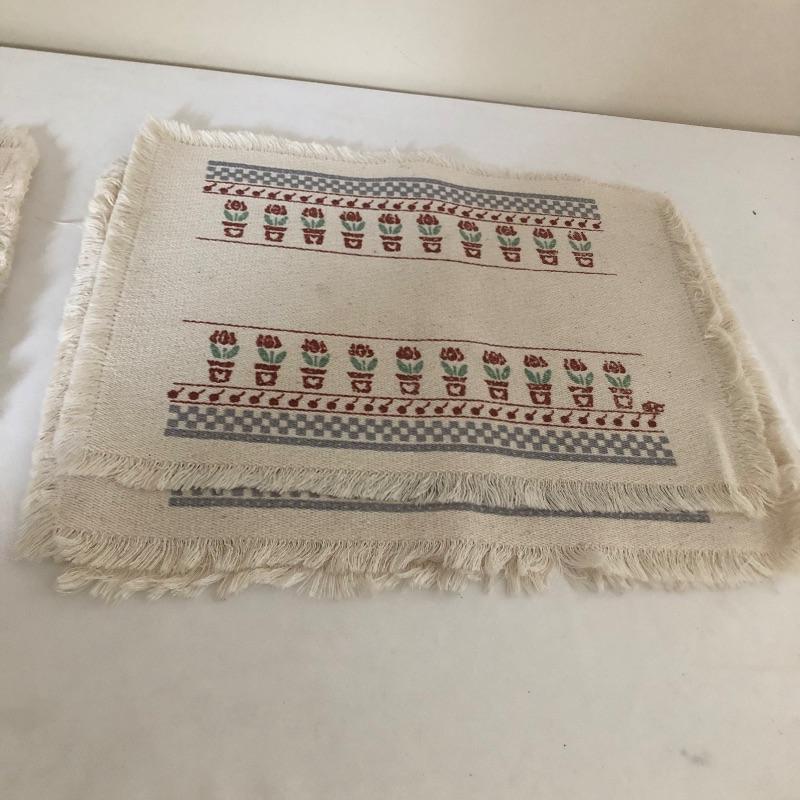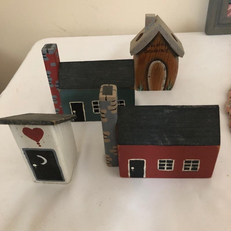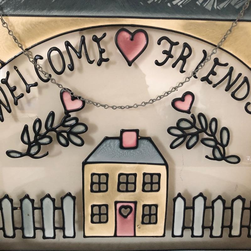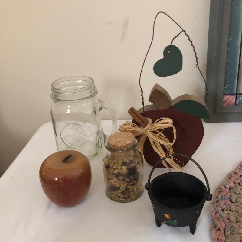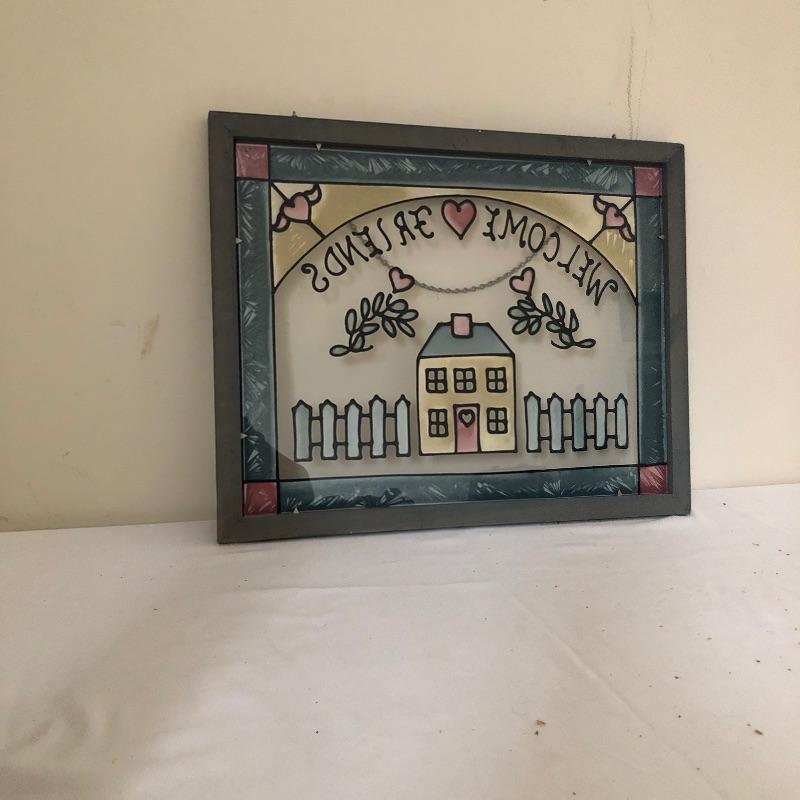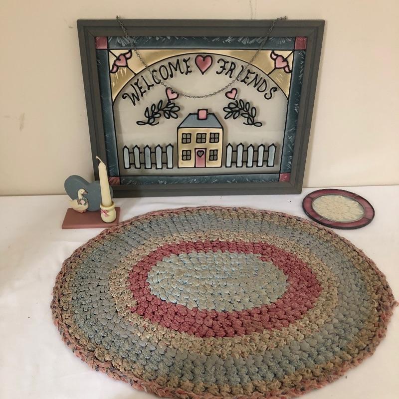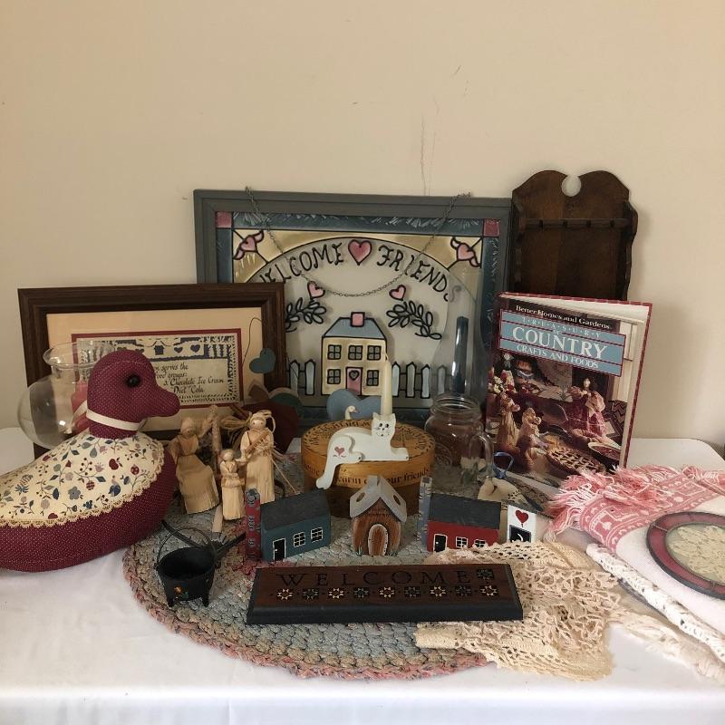 This quaint assortment of country decor will make any home feel more welcoming. See images for everything but to name but a few of the items - a framed “˜stained glass like’ Welcome Friends sign with chain to hang by your front door, a couple of candle holders with wood bases and glass globes, a duck door stop, a wood hanging spoon display rack, a pink and a lacy style table runners and much more. The place setting mats do have a few stains as shown in images.