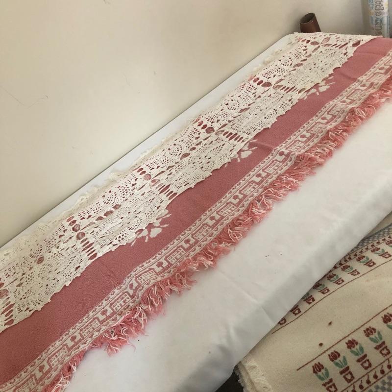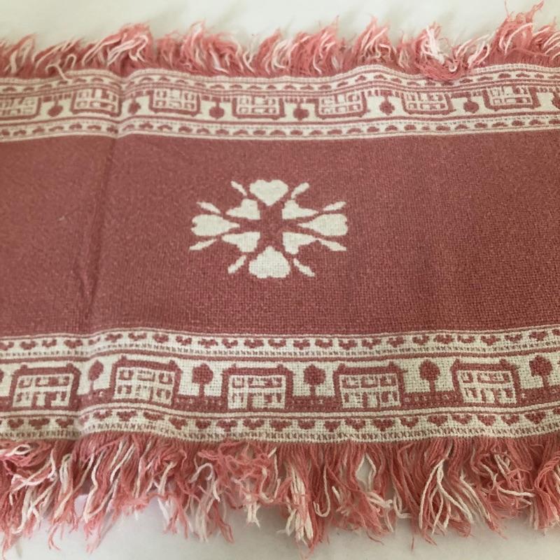 Welcome Friends sign measures 20” x 16”. Pink table runner measures 15” x 62”.