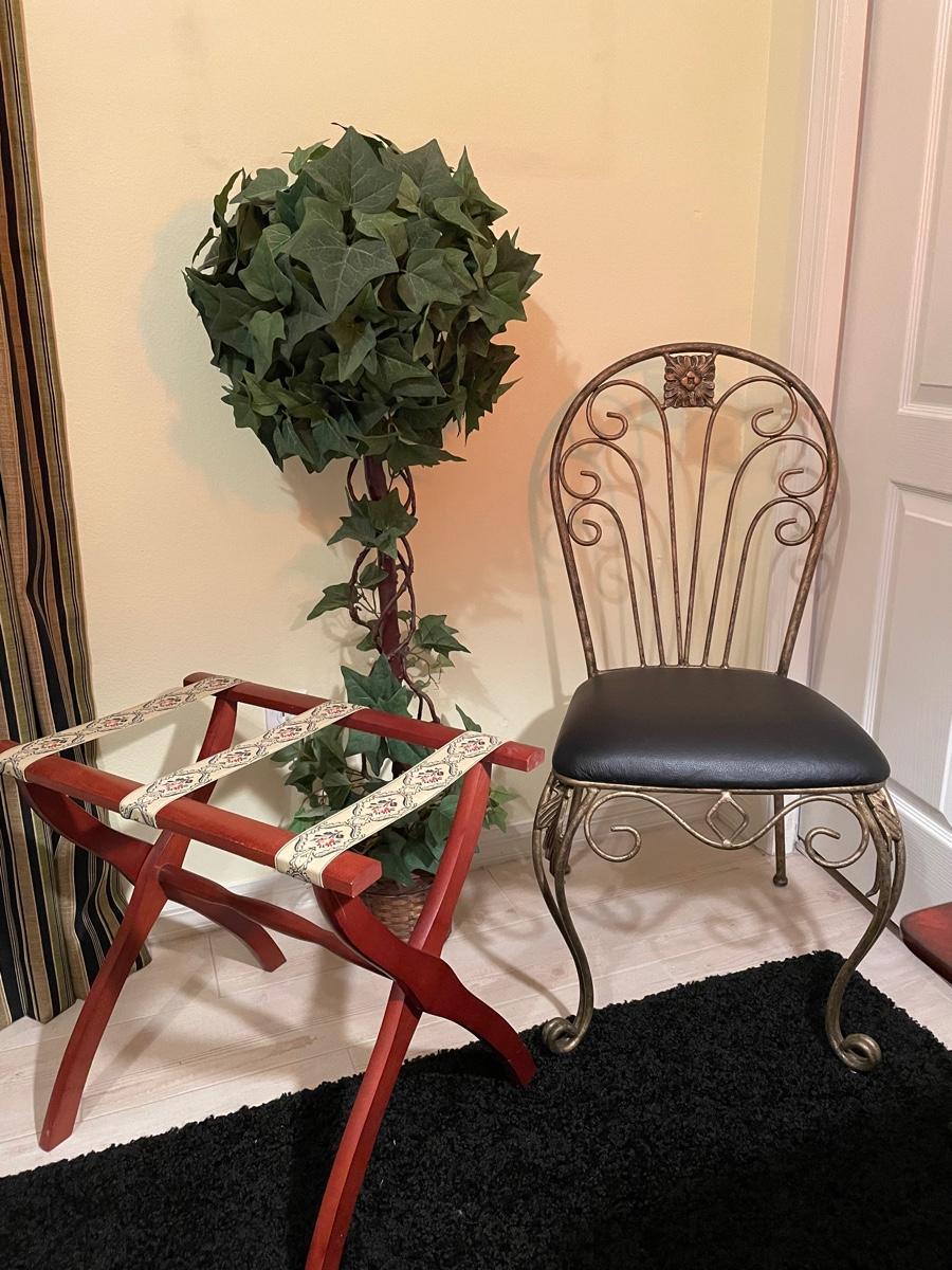 Topiary, metal chair with black vinyl seat and luggage stand, all in excellent condition