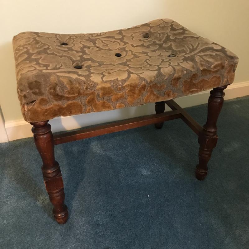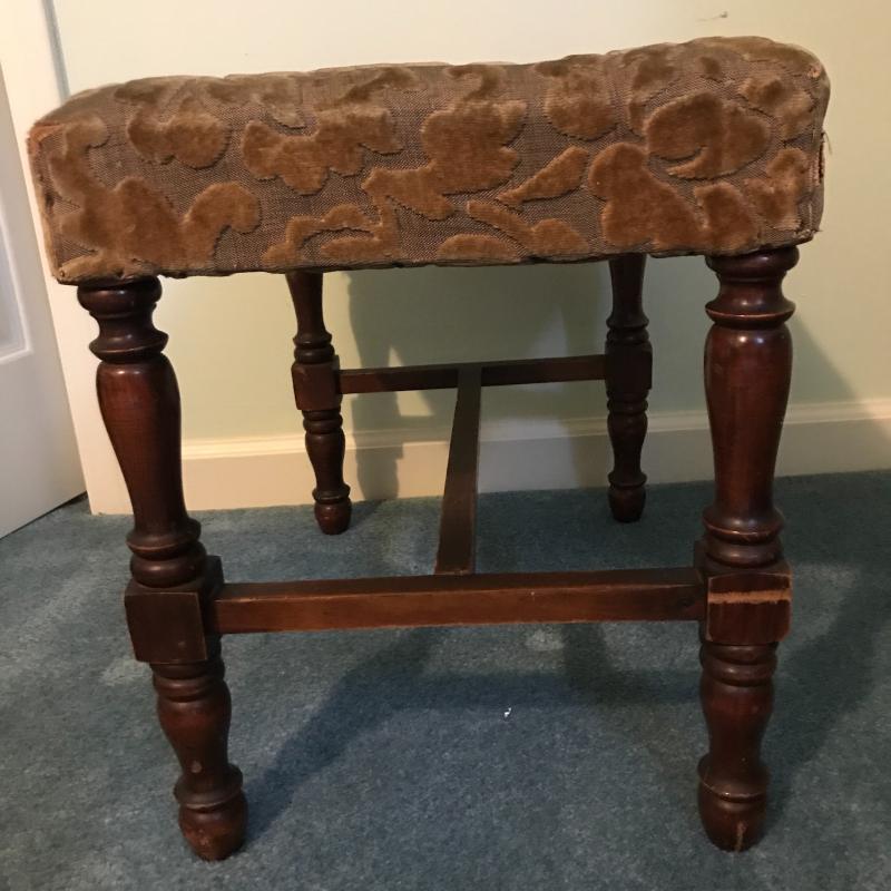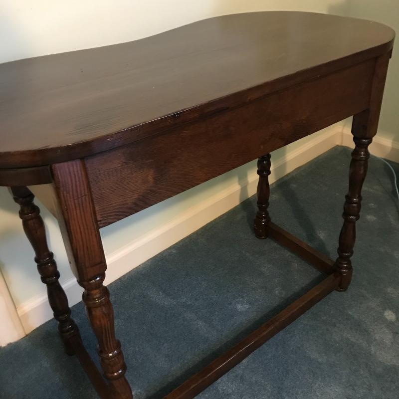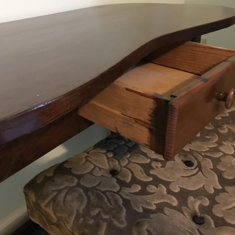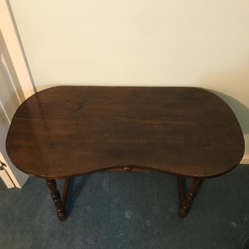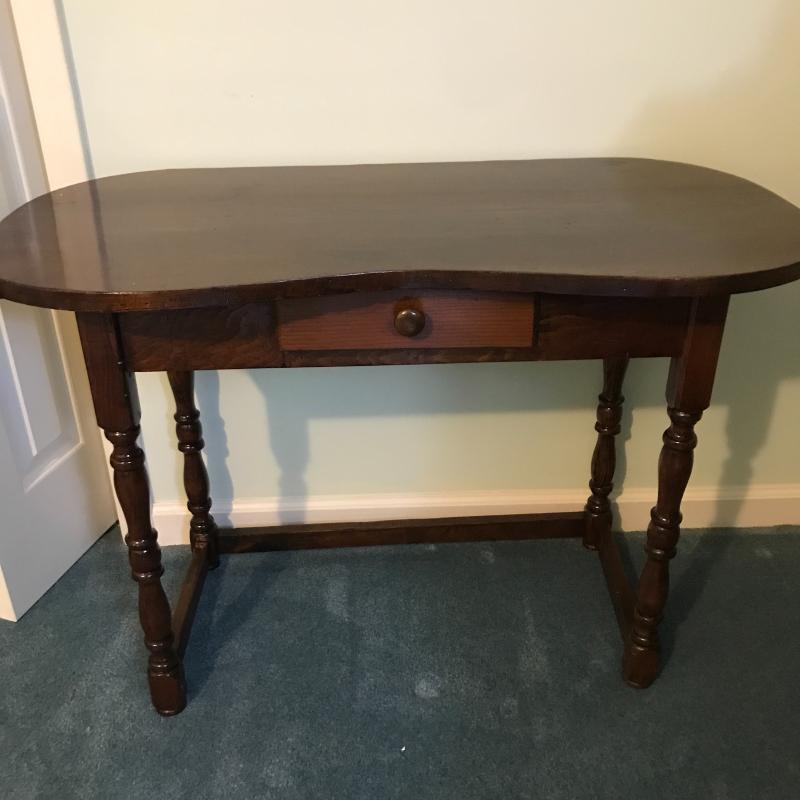Petite dressing table stained in dark wood color. Measures 36” x 18” x 26”h. Bean shape top. Branch has fabric with velvet detail. Some wear and tear. Cute set for a small space. No shipping.