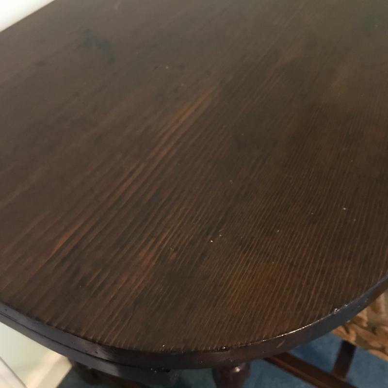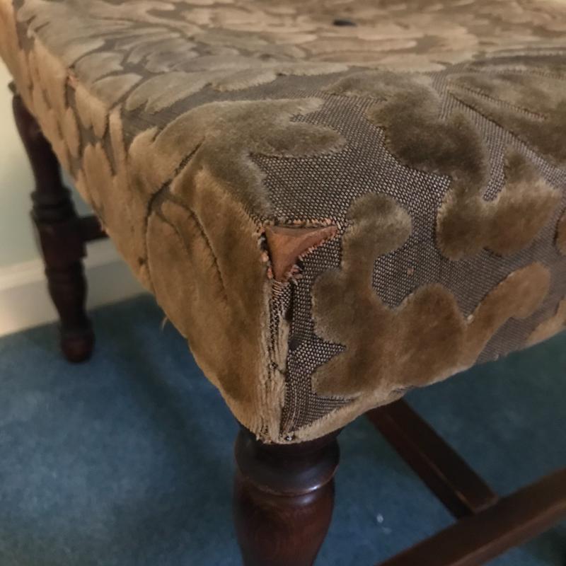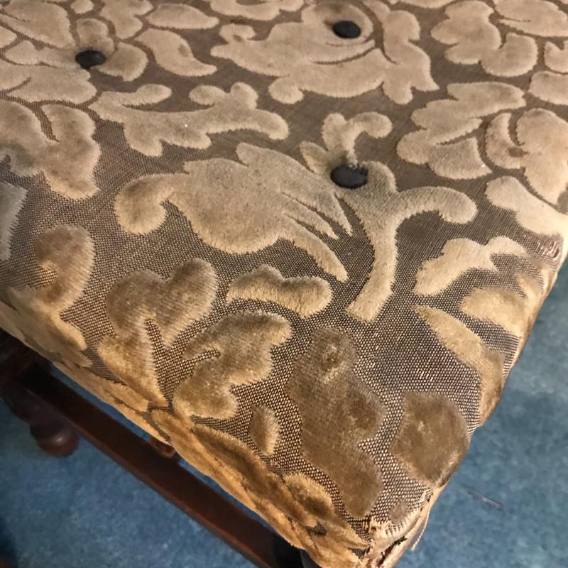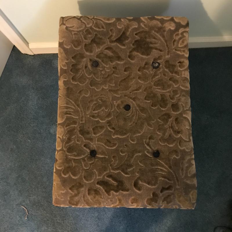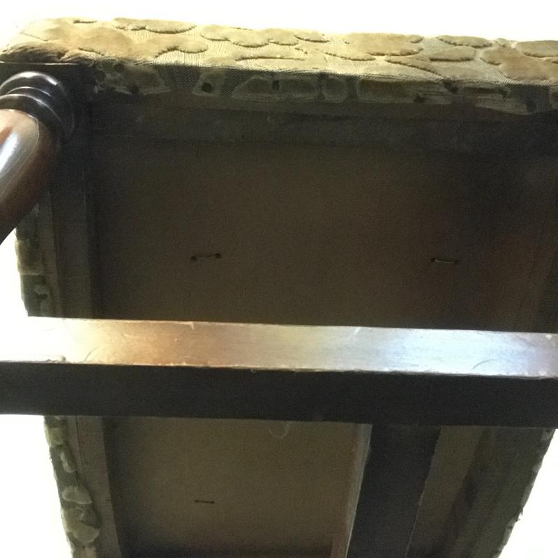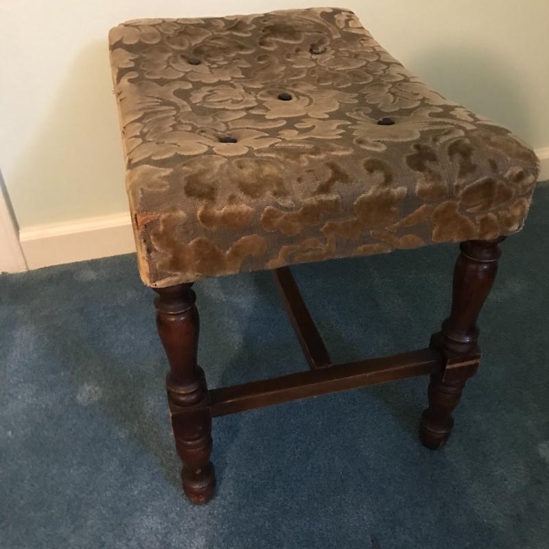 Petite dressing table stained in dark wood color. Measures 36” x 18” x 26”h. Bean shape top. Branch has fabric with velvet detail. Some wear and tear. Cute set for a small space. No shipping.