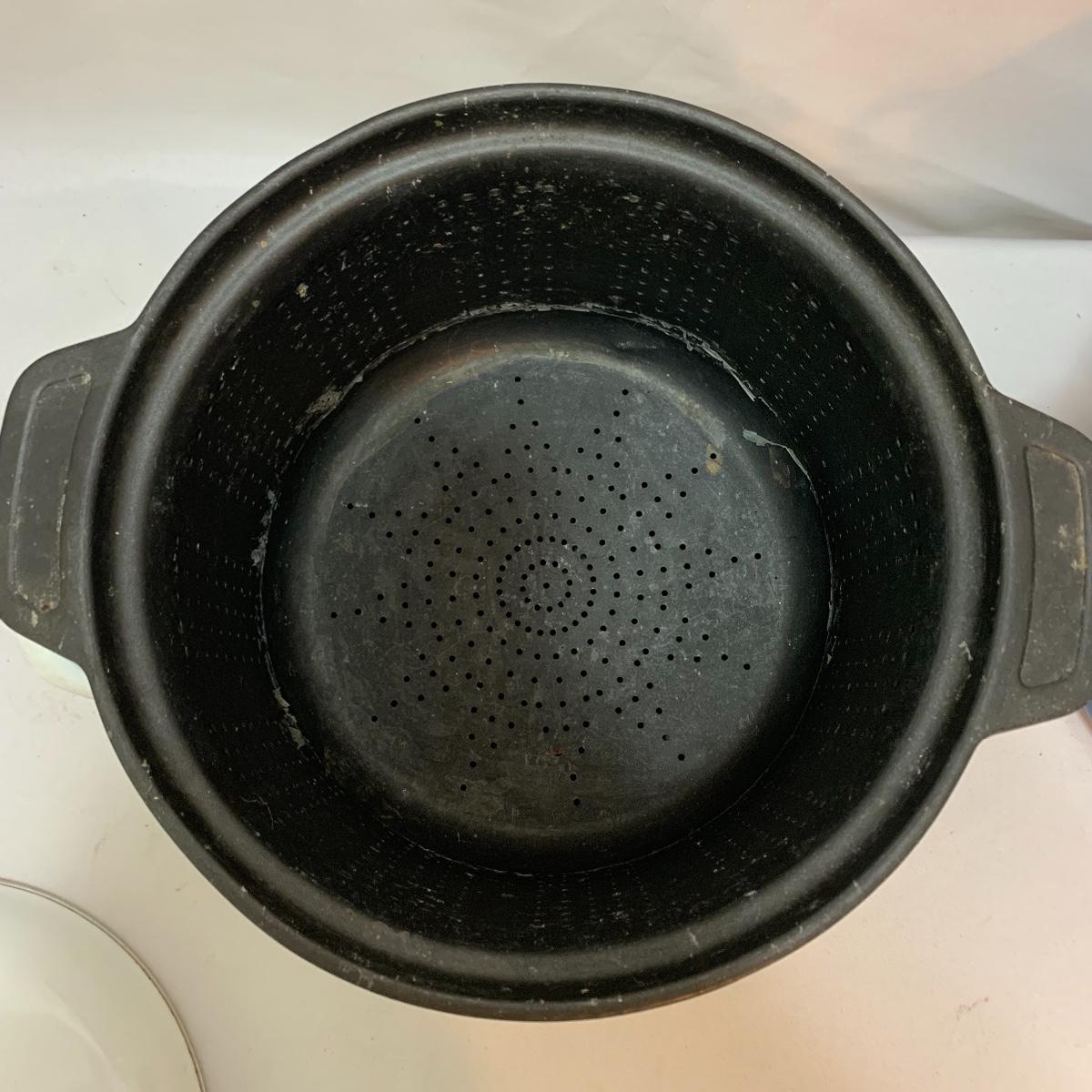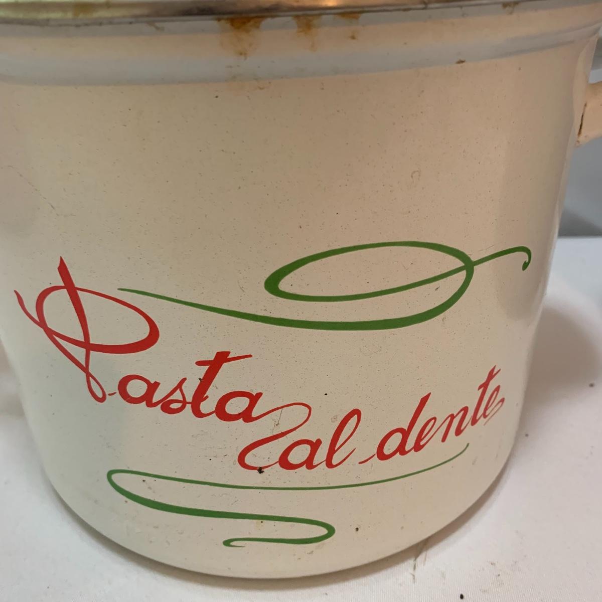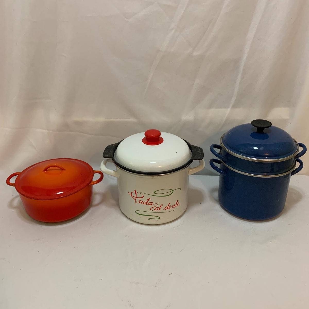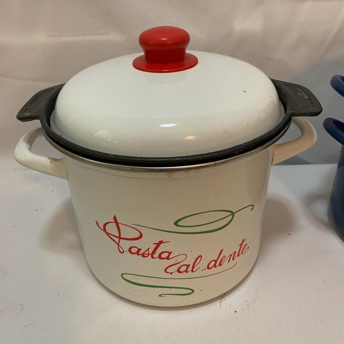 Don’t miss out on this group of crock pots. The smallest is a beautiful orange and measures 9” tall X 4” tall and has some definite wear on the bottom of the pan. The next says “Pasta al dente” on the side and measures 8” tall X 10” wide. This pan also has some wear on the bottom. The last is a gorgeous cobalt blue and measures 9” tall X 8” wide. The commander has some rust spots and the main pan has a discolored spot on the bottom. See pics to determine condition.