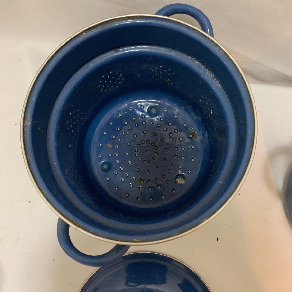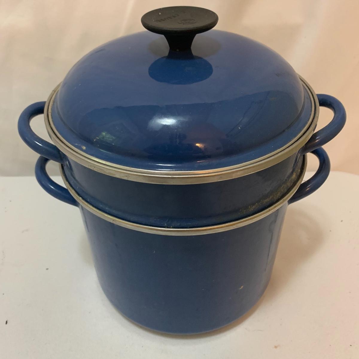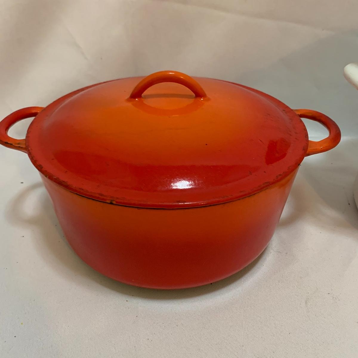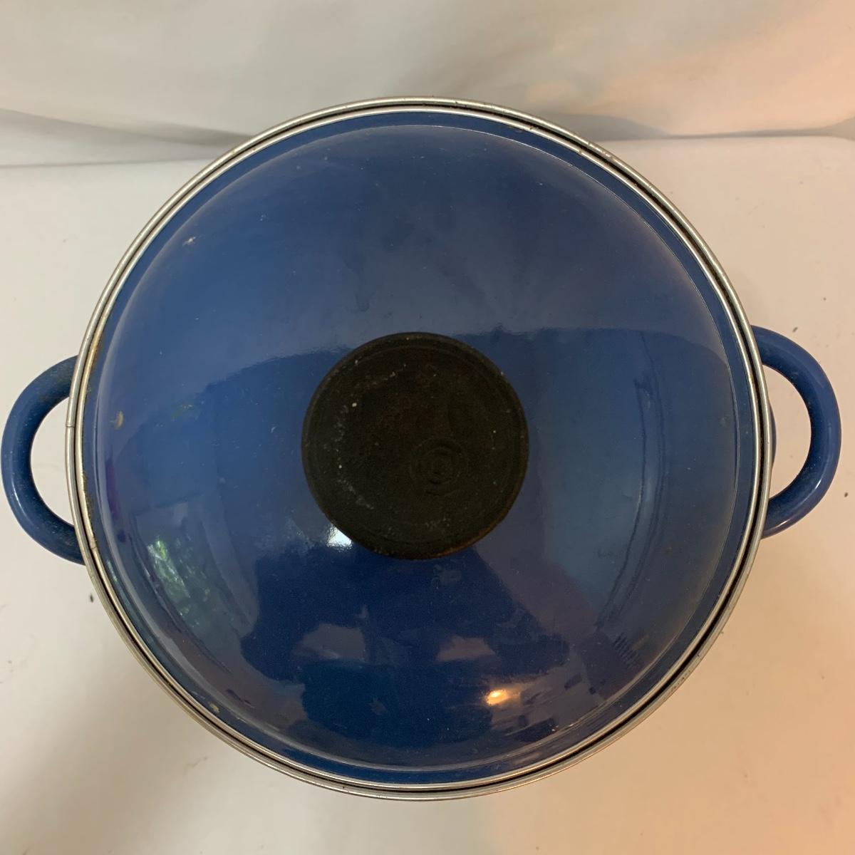 Don’t miss out on this group of crock pots. The smallest is a beautiful orange and measures 9” tall X 4” tall and has some definite wear on the bottom of the pan. The next says “Pasta al dente” on the side and measures 8” tall X 10” wide. This pan also has some wear on the bottom. The last is a gorgeous cobalt blue and measures 9” tall X 8” wide. The commander has some rust spots and the main pan has a discolored spot on the bottom. See pics to determine condition.