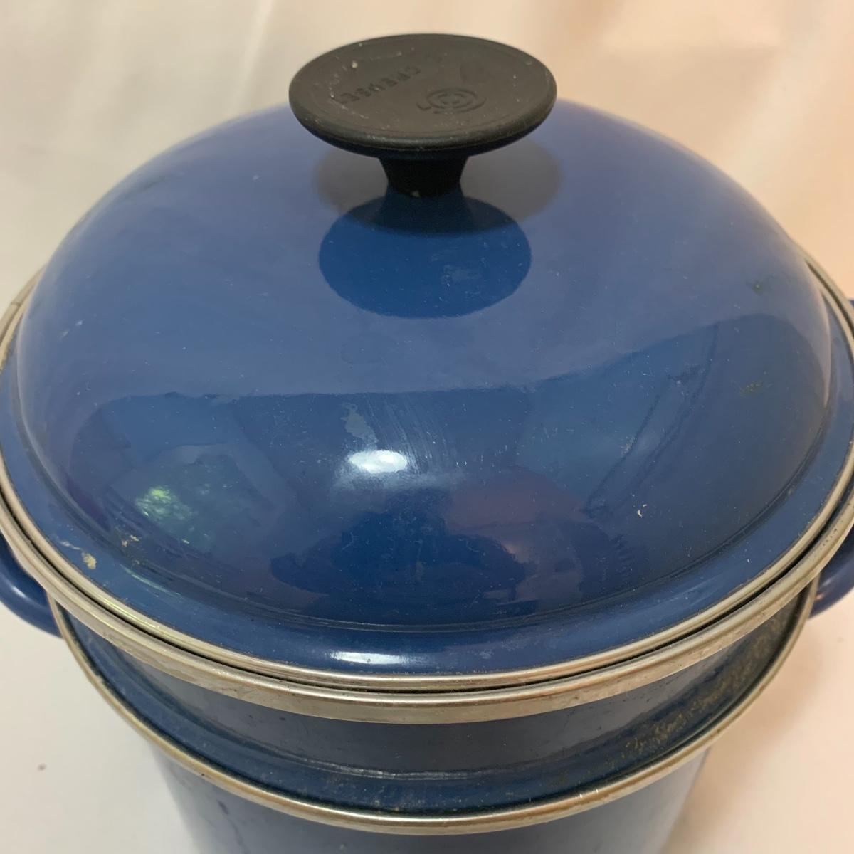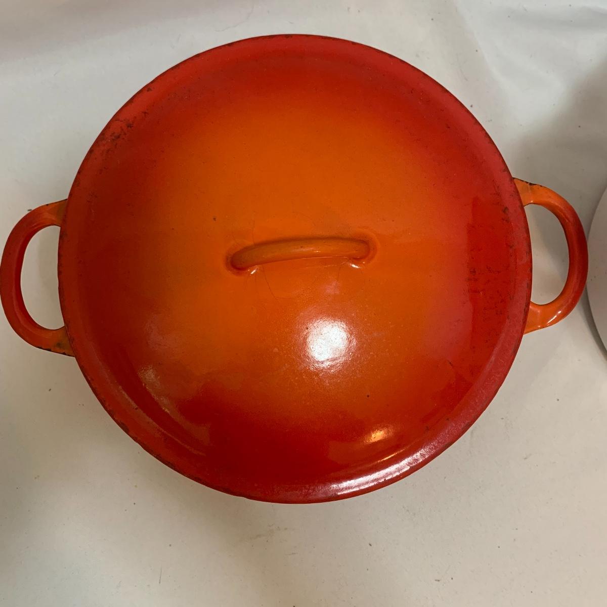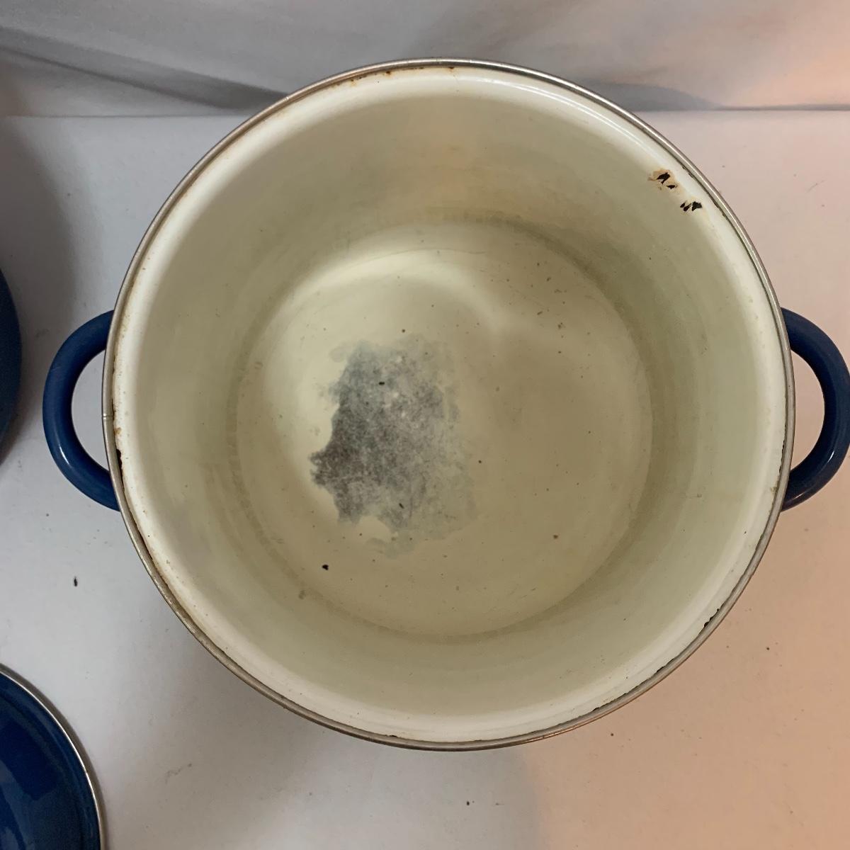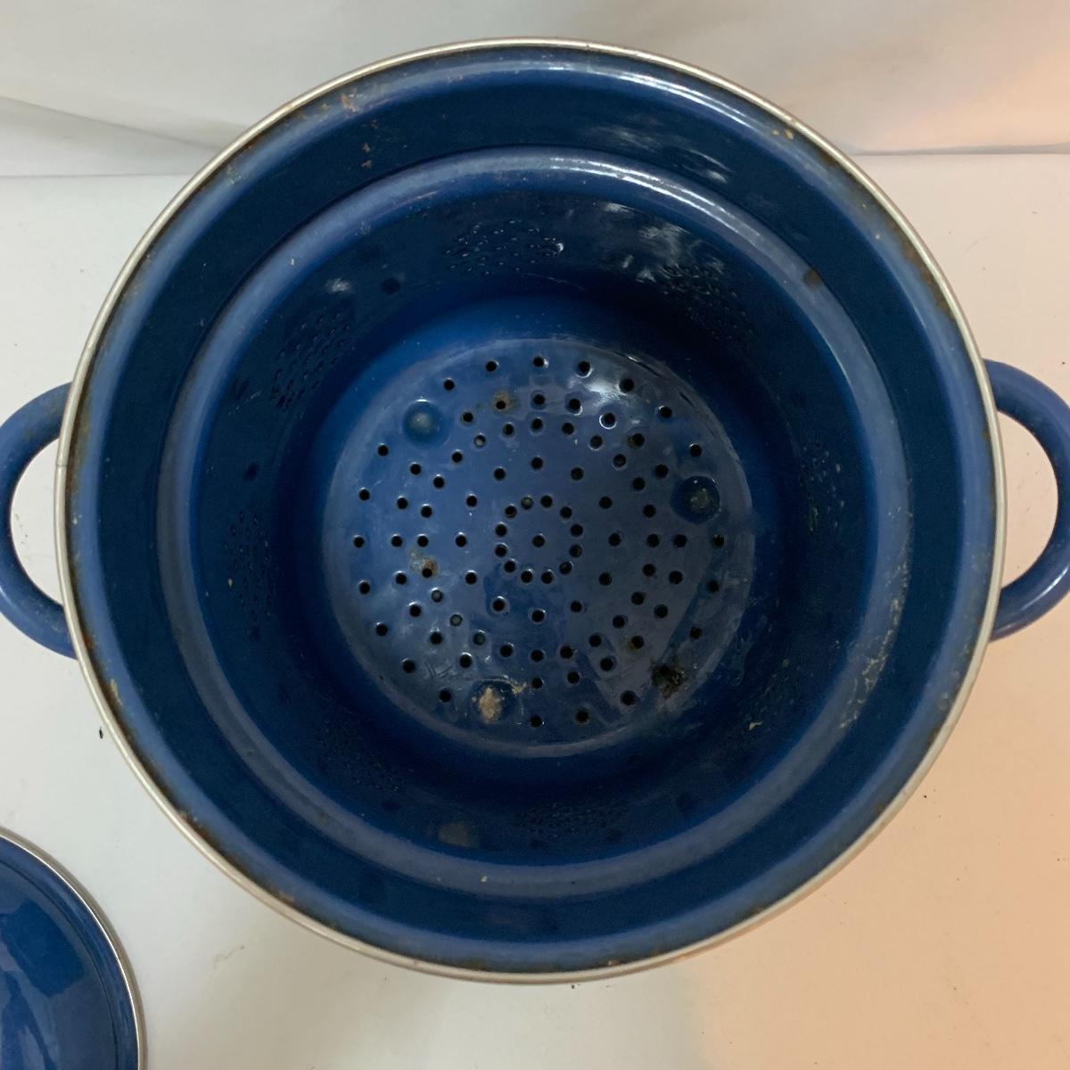 Don’t miss out on this group of crock pots. The smallest is a beautiful orange and measures 9” tall X 4” tall and has some definite wear on the bottom of the pan. The next says “Pasta al dente” on the side and measures 8” tall X 10” wide. This pan also has some wear on the bottom. The last is a gorgeous cobalt blue and measures 9” tall X 8” wide. The commander has some rust spots and the main pan has a discolored spot on the bottom. See pics to determine condition.