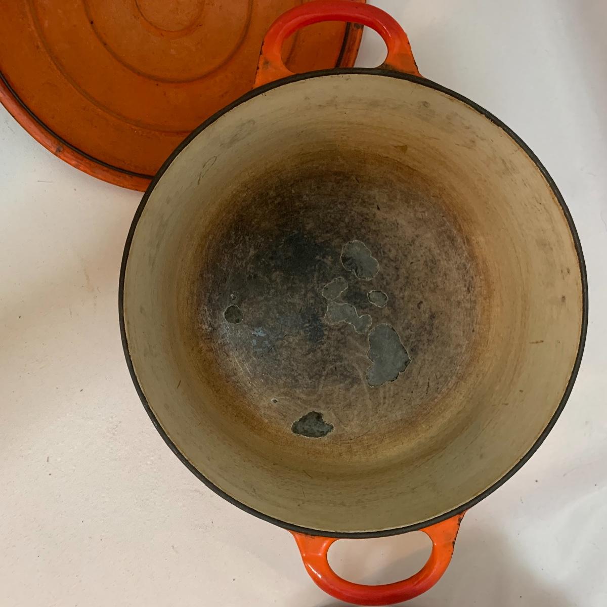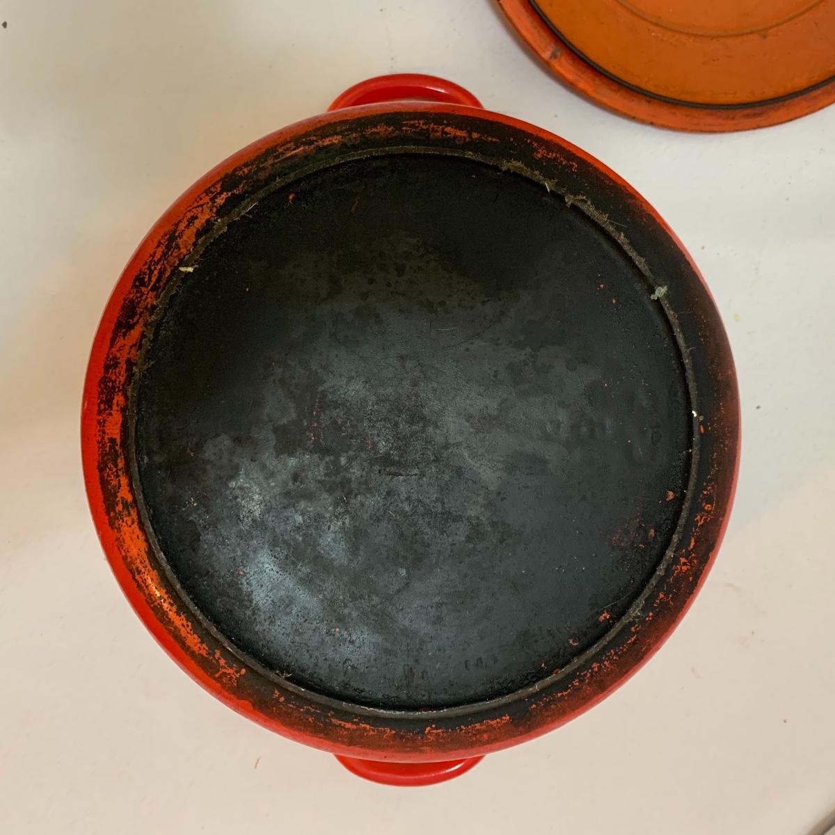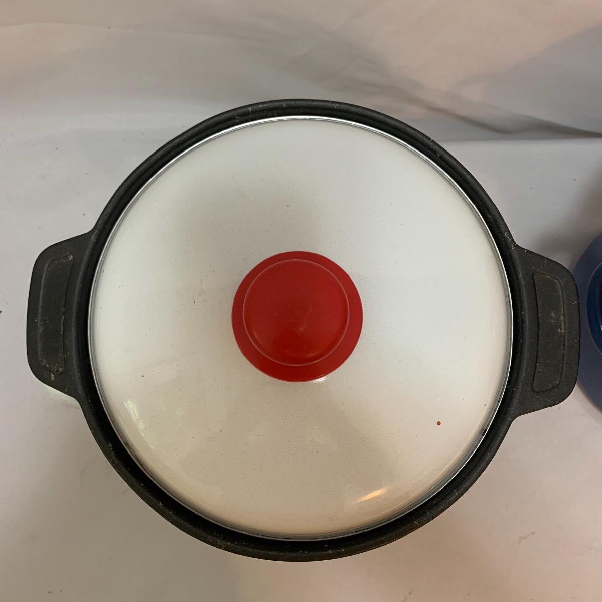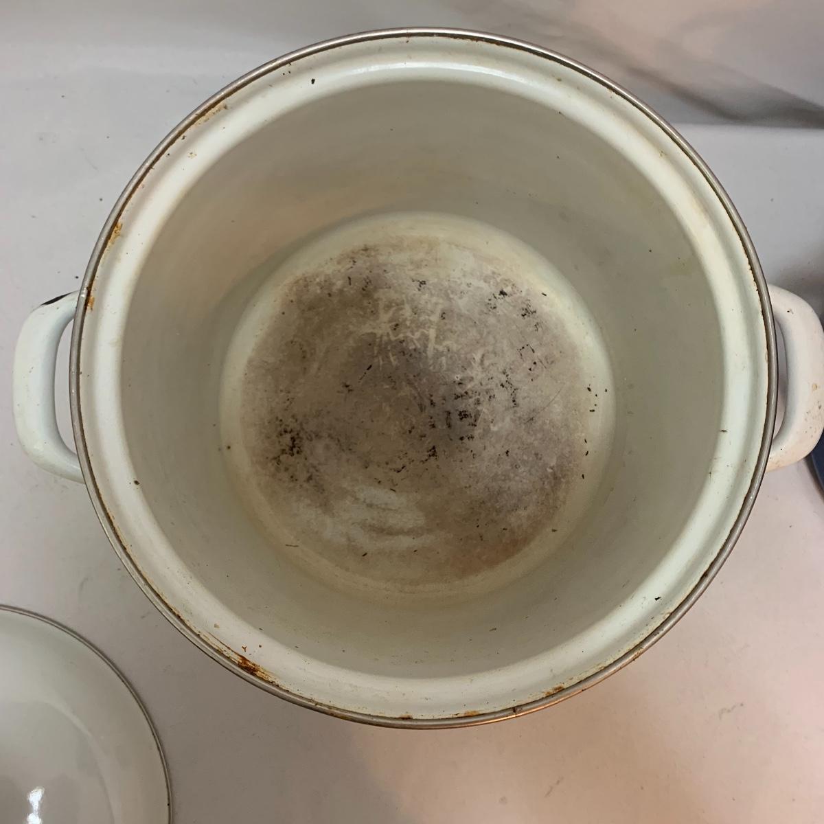 Don’t miss out on this group of crock pots. The smallest is a beautiful orange and measures 9” tall X 4” tall and has some definite wear on the bottom of the pan. The next says “Pasta al dente” on the side and measures 8” tall X 10” wide. This pan also has some wear on the bottom. The last is a gorgeous cobalt blue and measures 9” tall X 8” wide. The commander has some rust spots and the main pan has a discolored spot on the bottom. See pics to determine condition.