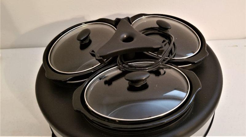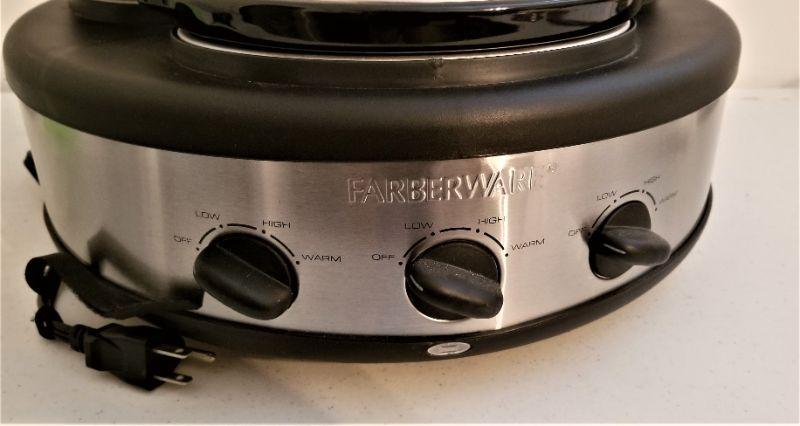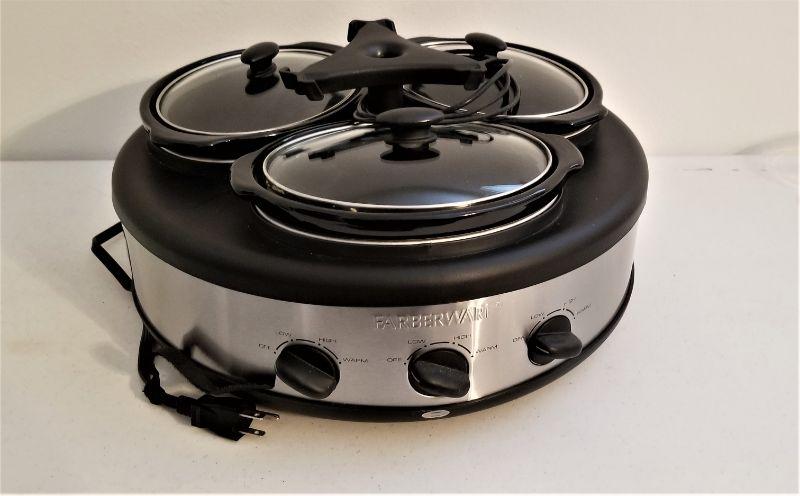 Gently used Faberware 1.5 Quart Slow Cooker with Three bays - Stainless Steel - 3 lift out crocks.