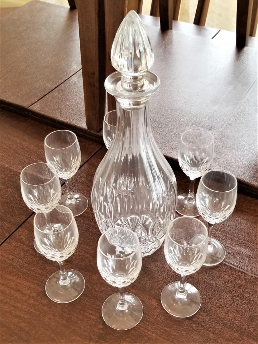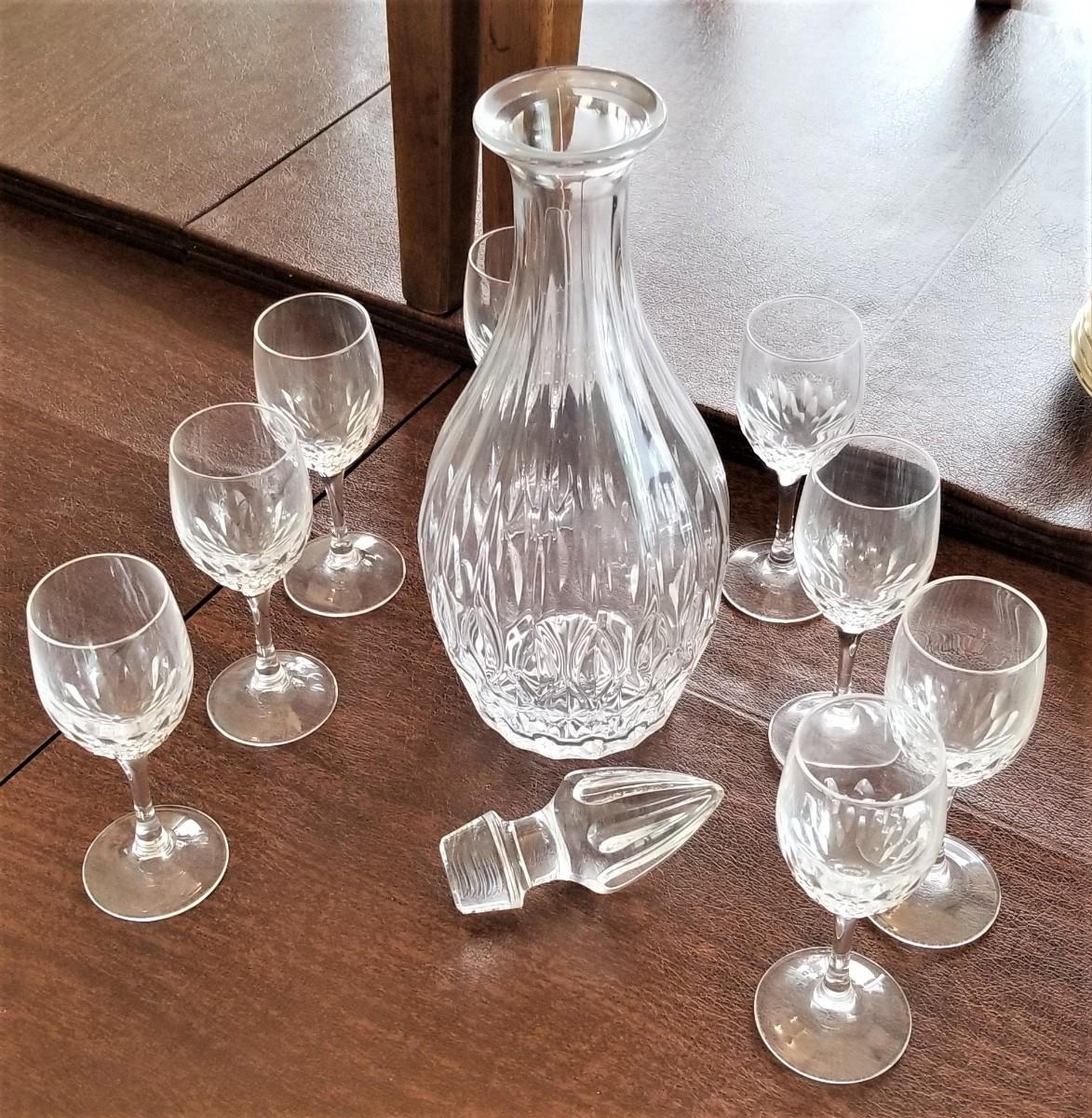 Decanter is pressed glass with glass stopper - good condition - stands 13" tall. Liqueur glasses (8) are crystal - they each stand 5" all. All in good condition.
