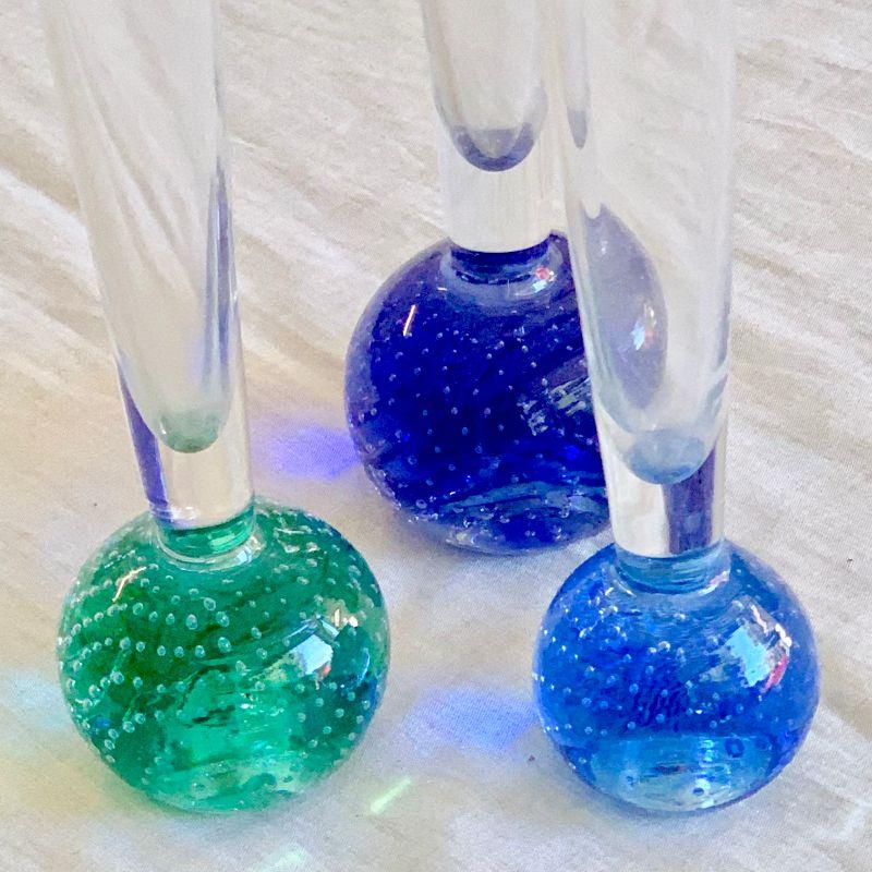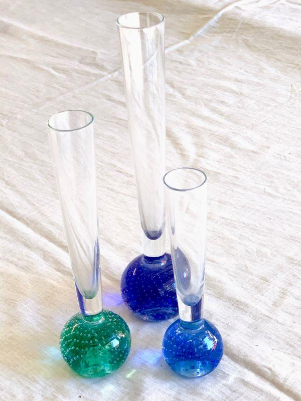 Bubbled bases in shades of blue. Graduating size bud vases. Tallest is 9"