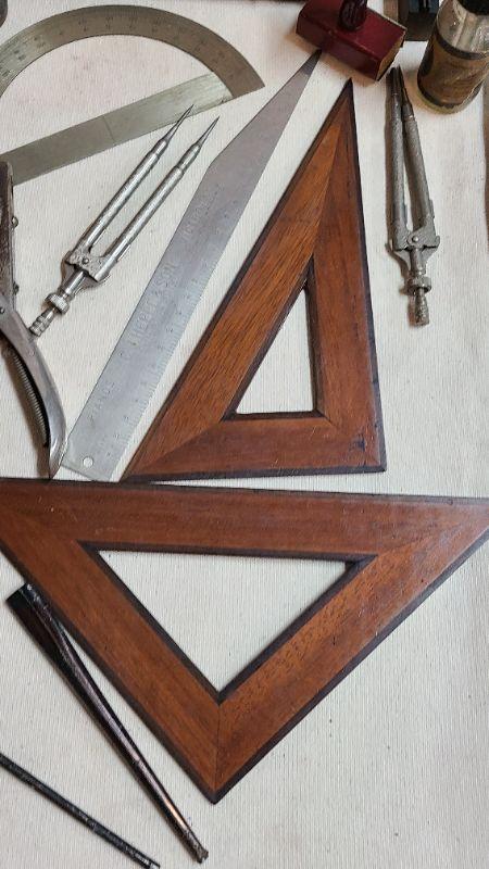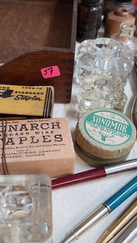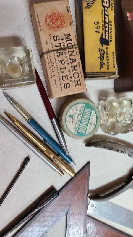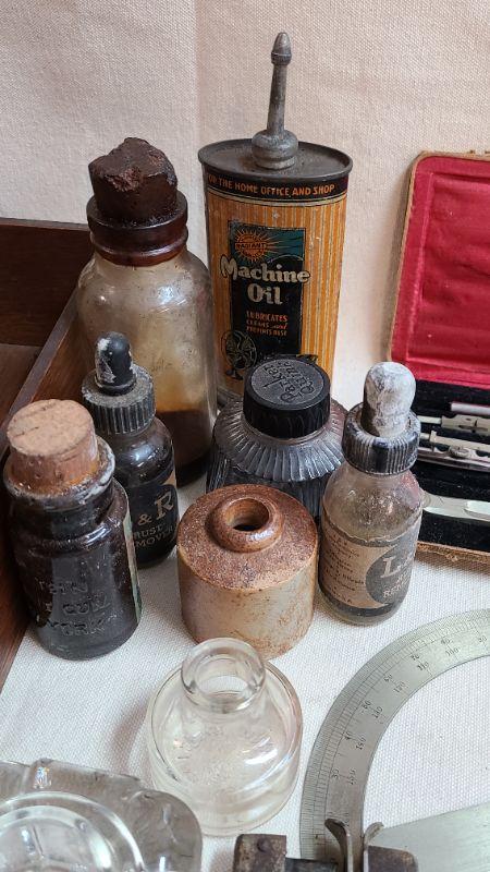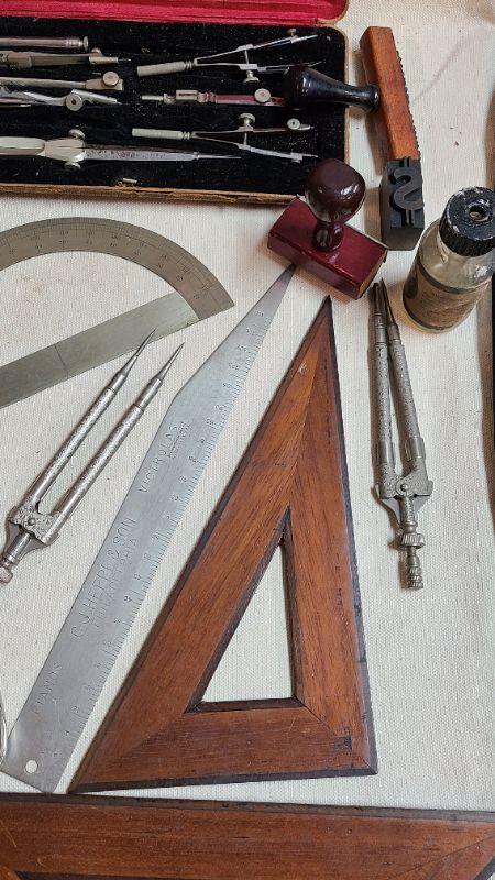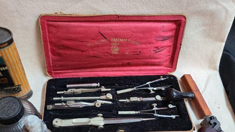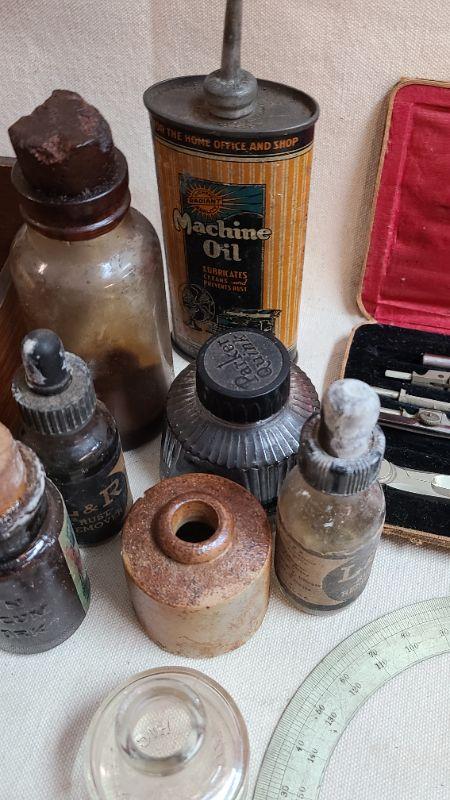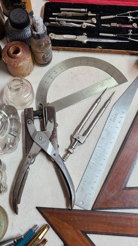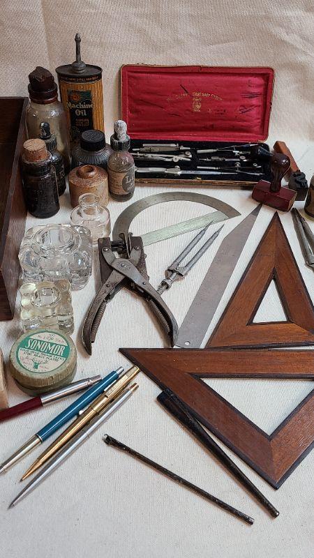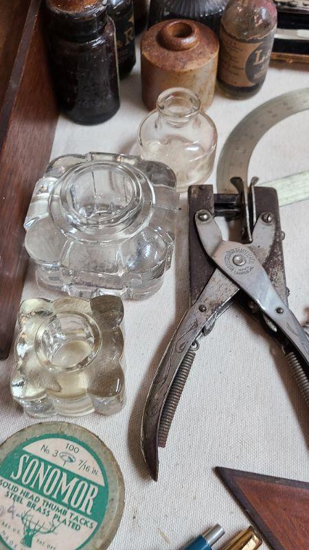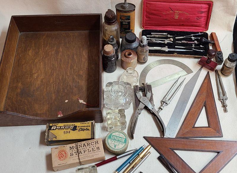 Antique lot of Office fun. Ink wells, pens, compasses, stamps and more.