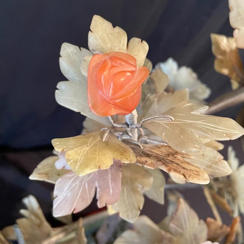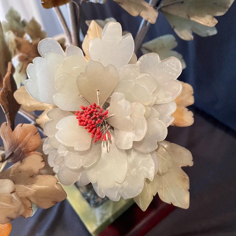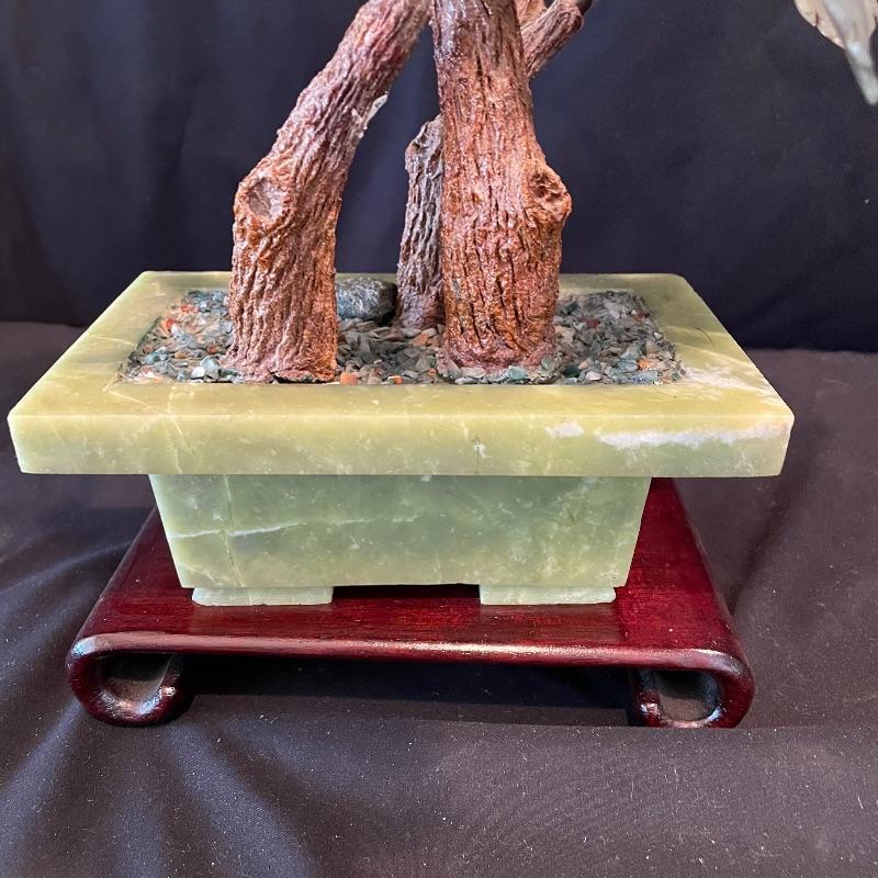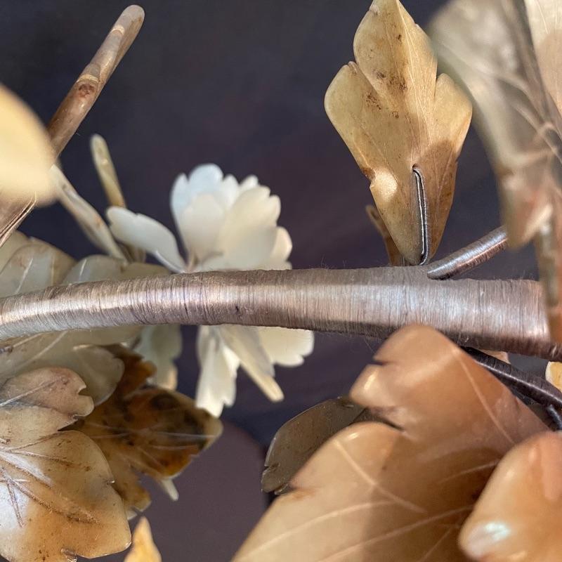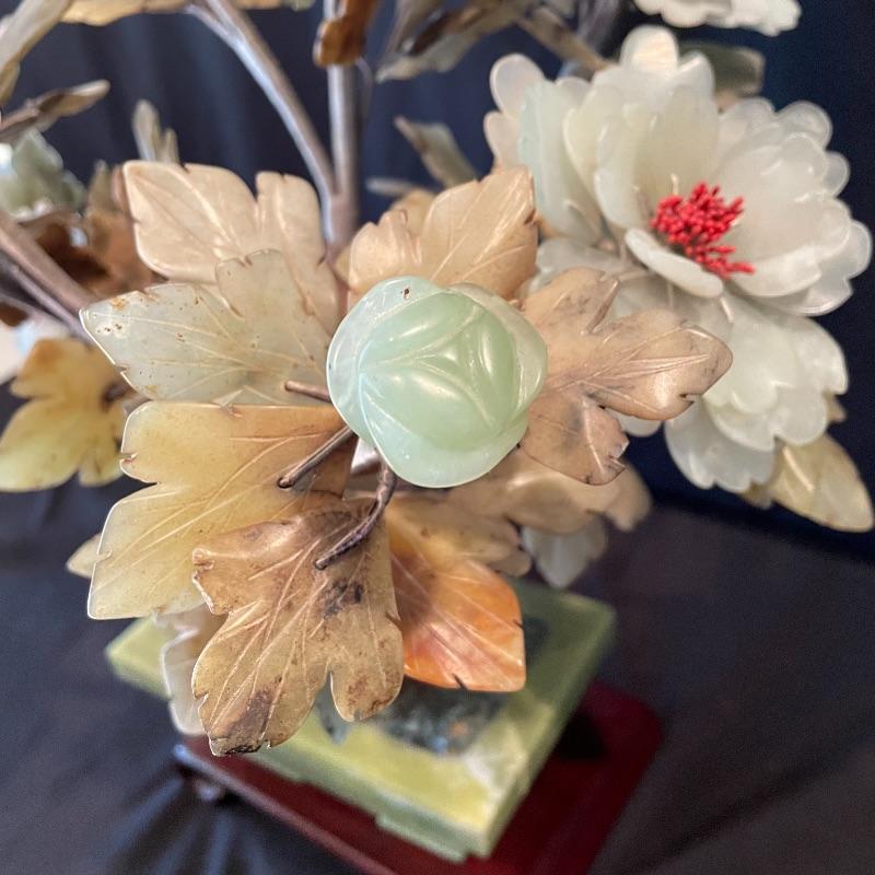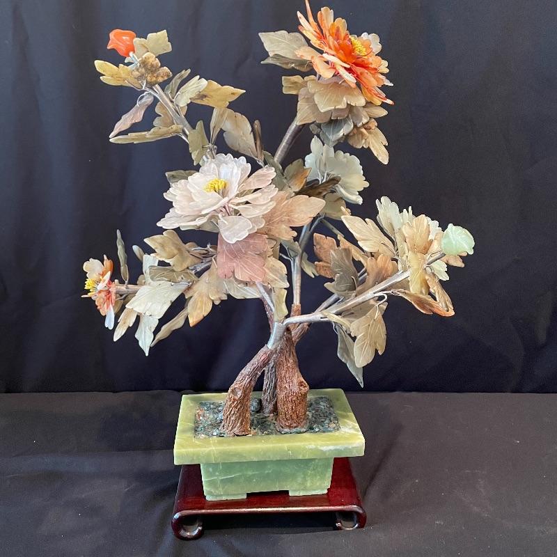 Some Eastern cultures believe Jade will bring luck, health and wealth! This very attractive mid century bonsai art appears to be made with Jade and agate throughout. This piece has colorful carved stone petals and leaves with that signature watery sheen. It looks as though art was created using thin metallic colored silky threads to bind each piece. This art stands about 19” tall and is extremely heavy for its size. Lot also contains a nice cherry colored stand. Shipping available, but understand this item is quite heavy. Please call UPS at 828-252-6930 for a quote prior to bidding.