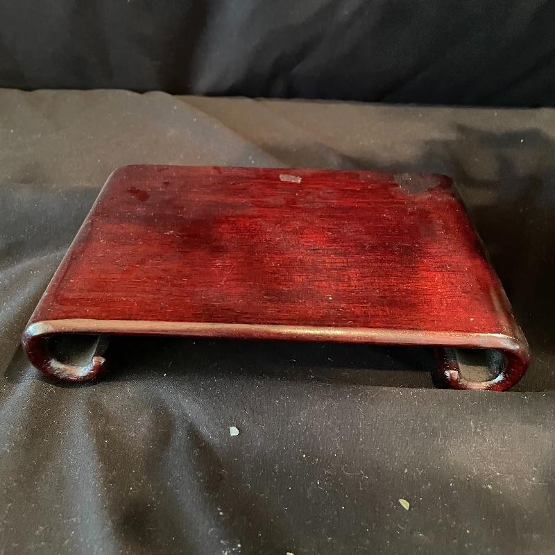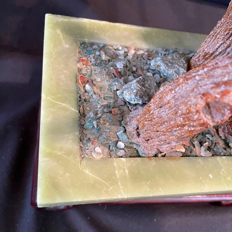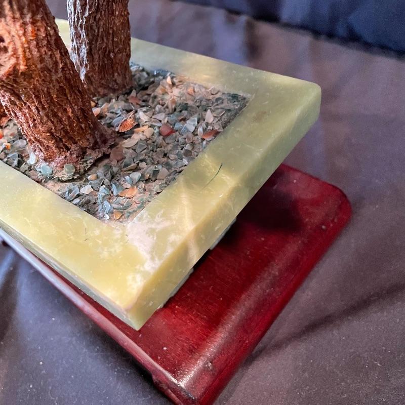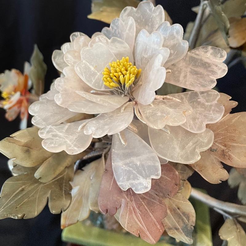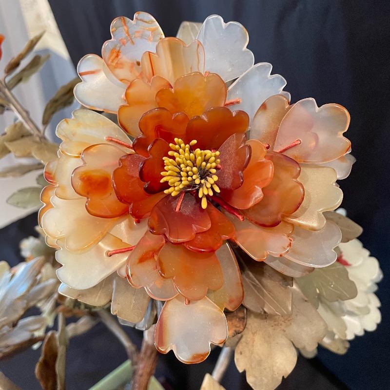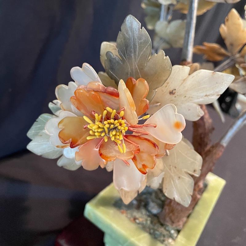 Some Eastern cultures believe Jade will bring luck, health and wealth! This very attractive mid century bonsai art appears to be made with Jade and agate throughout. This piece has colorful carved stone petals and leaves with that signature watery sheen. It looks as though art was created using thin metallic colored silky threads to bind each piece. This art stands about 19” tall and is extremely heavy for its size. Lot also contains a nice cherry colored stand. Shipping available, but understand this item is quite heavy. Please call UPS at 828-252-6930 for a quote prior to bidding.