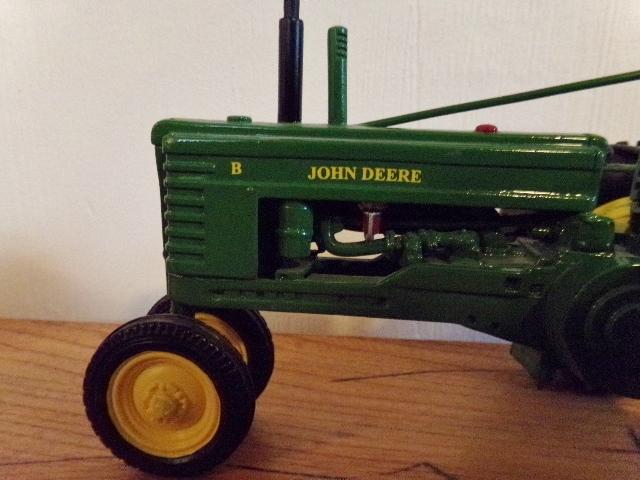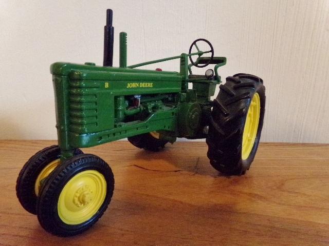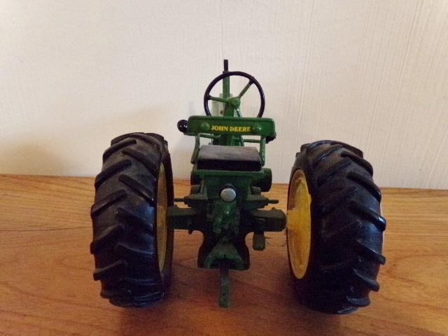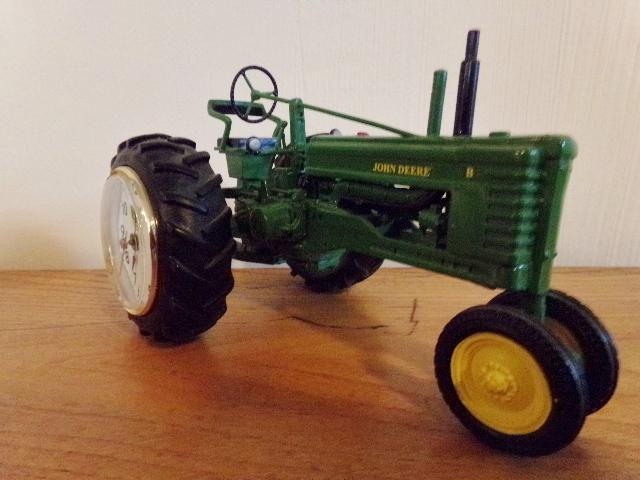 JOHN DEERE DIE-CAST MODEL TRACTOR WITH A CLOCK IN ITS WHEEL
