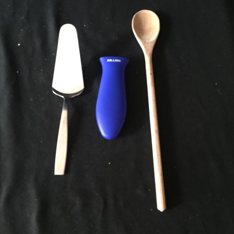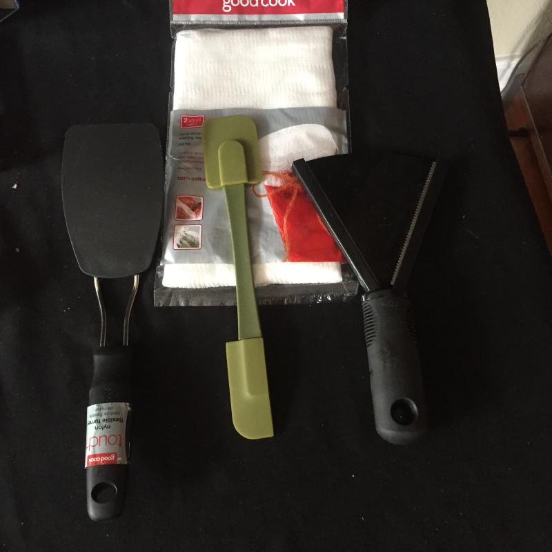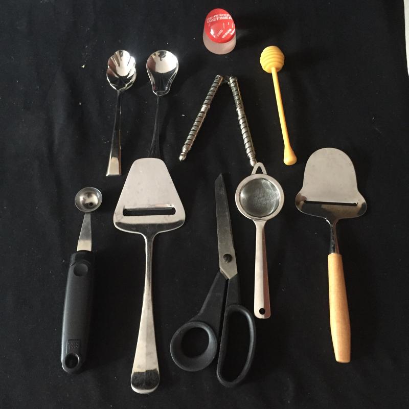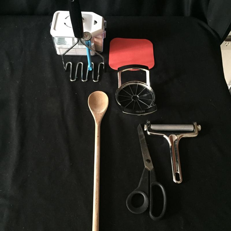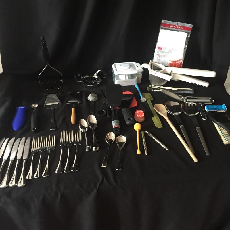 Plethora of kitchen utensils including juicer, masher, apple slicer, Cuisinart flatware (only three complete), jar opener and more. Be ready for whatever you need in the kitchen.