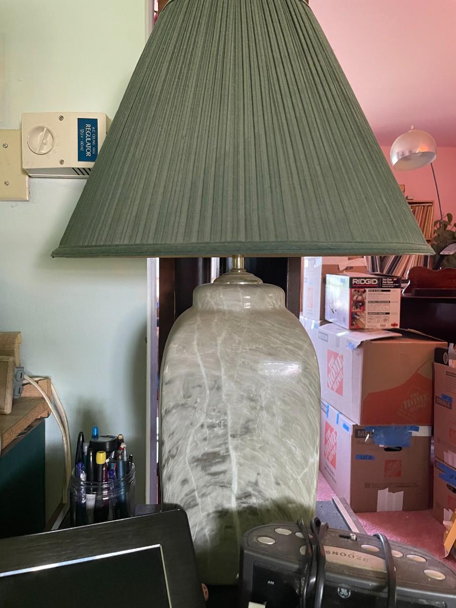 lamp, small cabinet with contents.