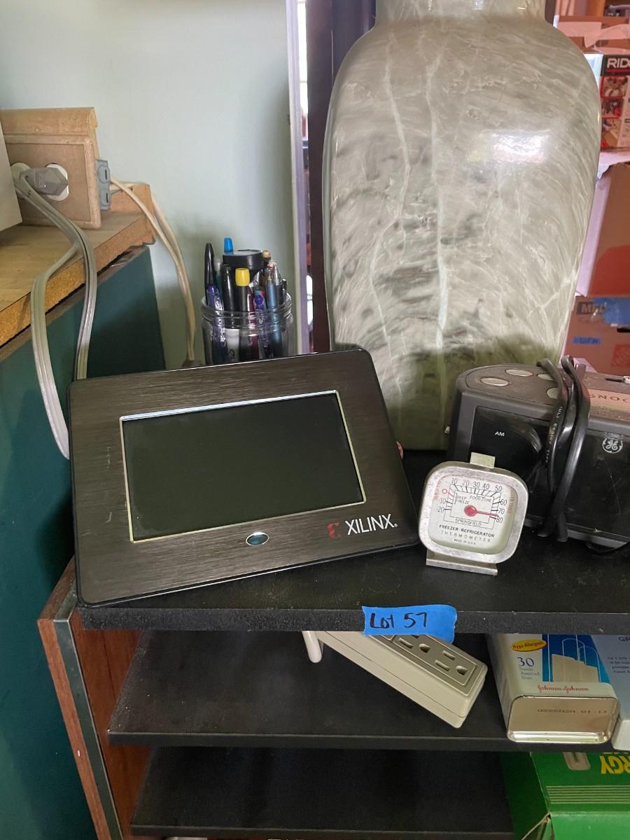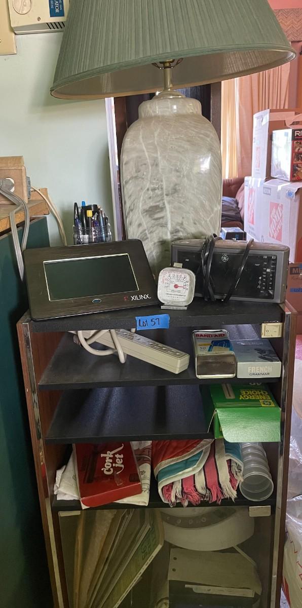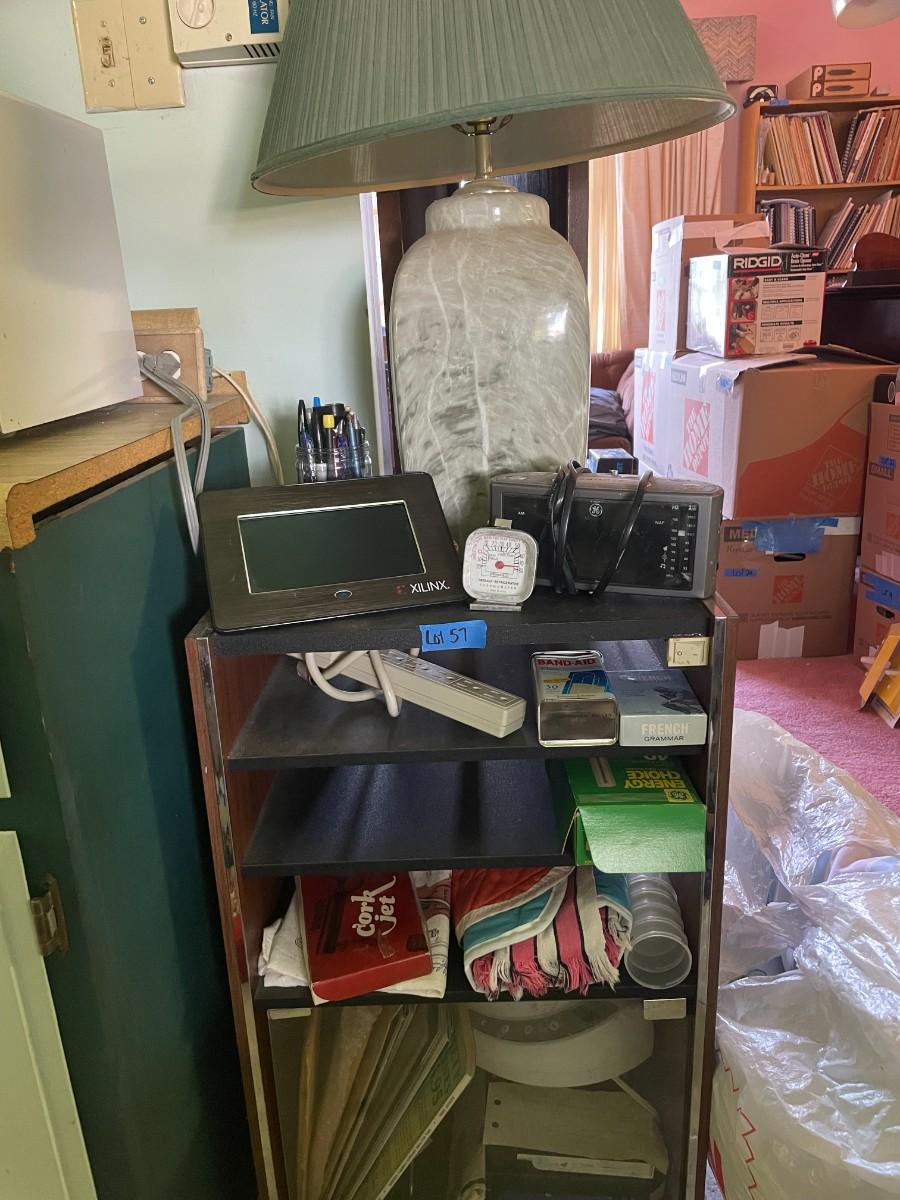 lot 57- lamp, small cabinet with contents