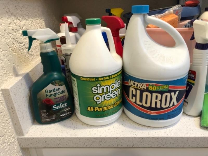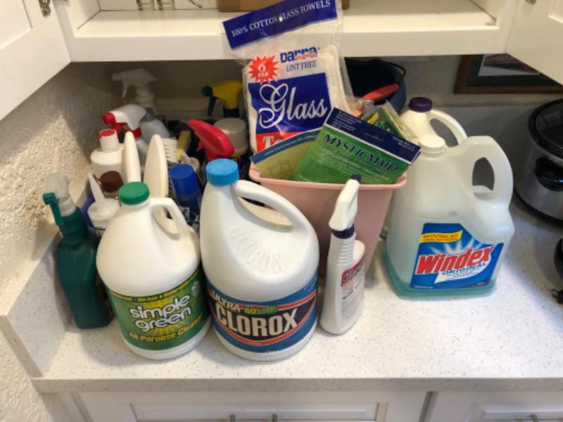 Lot 57. Large assortment of cleaning products, sponges, cloths, glasses, brushes, etc.--WAS $30““NOW $15
