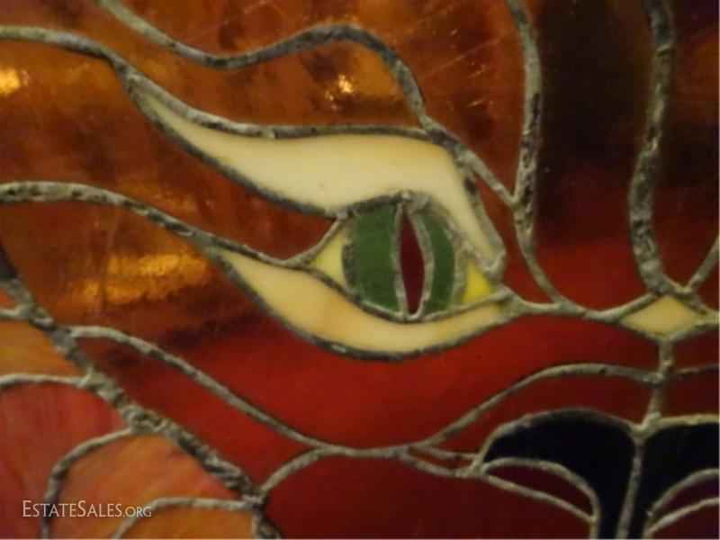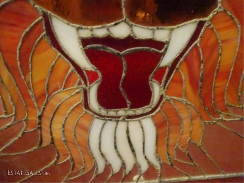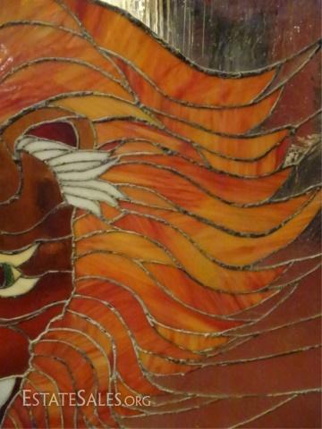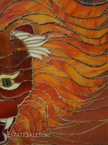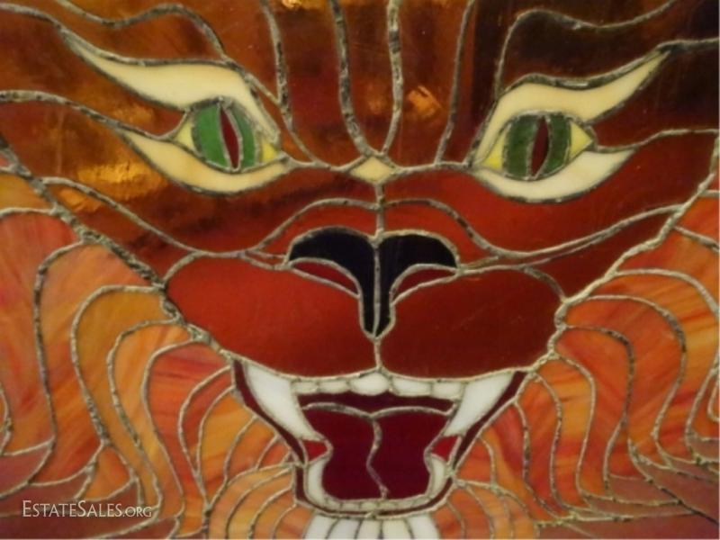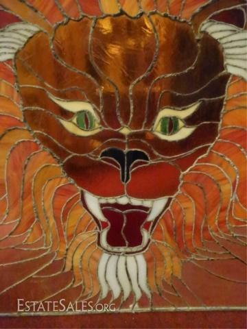 LOT 57: LARGE STAINED GLASS PANEL, LION HEAD, ON CLEAR, ONE OF A KIND HAND CRAFTED BY ARTIST, VERY GOOD CONDITION WITH A COUPLE OF SMALL CRACKS, 51"W X 38"H, SKU020.01