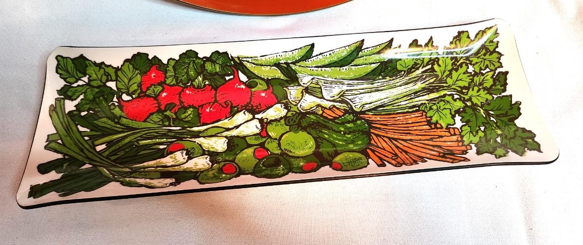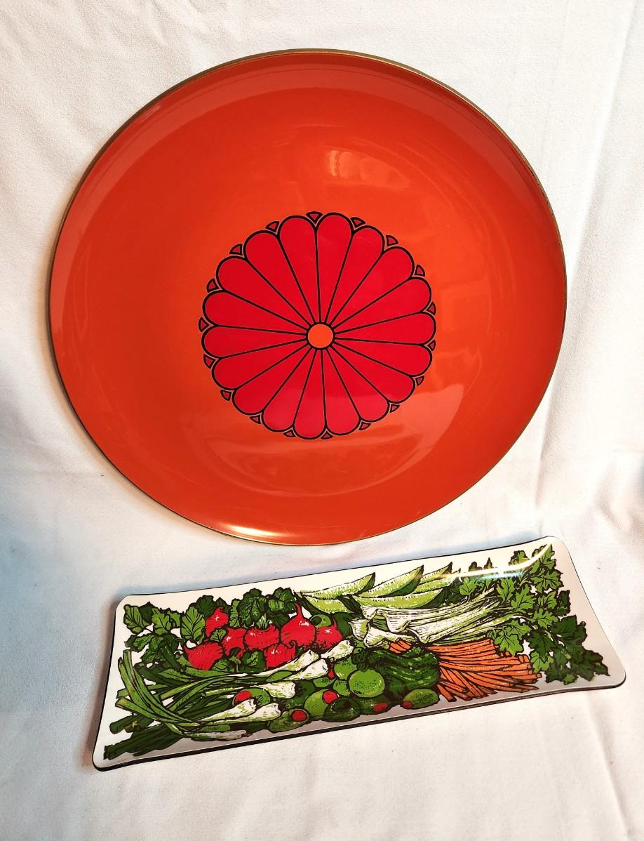 These two Mid Century Modern serving pieces have a great MCM look and are like new - large platter 16" across along with a crudite platter 15" long and 5" wide. Unmarked, heavy plastic.