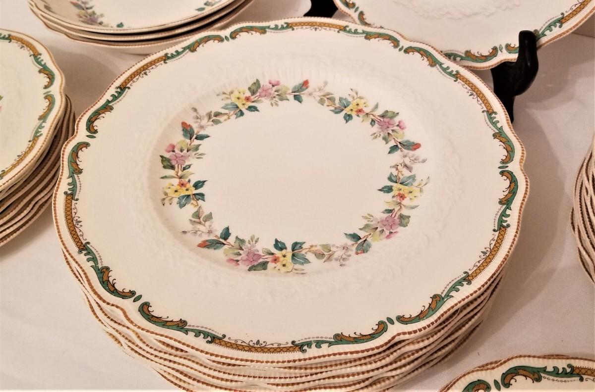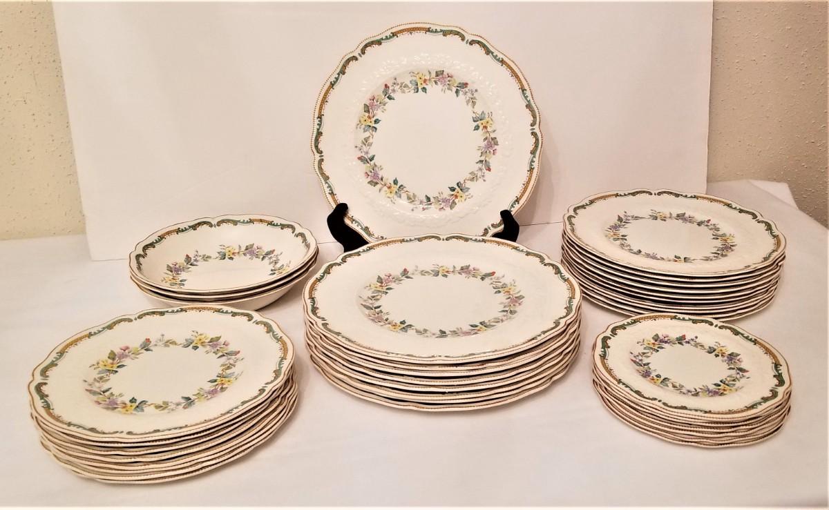 You get all you see here - lot of antique Johnson Bros. Staffordshire dinnerware in the "Moorland" pattern. 8 plates, 3 bowls, 8 dessert plates, 7 bread/butter plates, 10 Salads plates. All in vintage condition with some minor crazing.