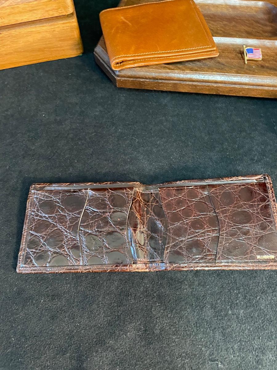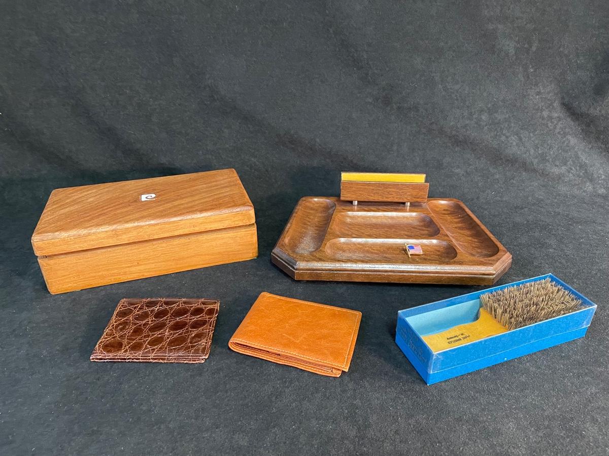 Wooden box, wooden tray, two wallets and natural bristle hair bruch