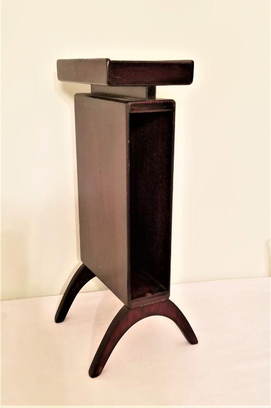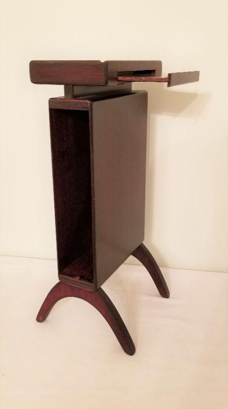 Cute mid-century modern telephone stand - put your phone book in the bottom - shelf slides out to hold your drink or ciggies/ashtray while you talk the day away. Good vintage condition - 9.5" wide at the base, 20.25" tall.