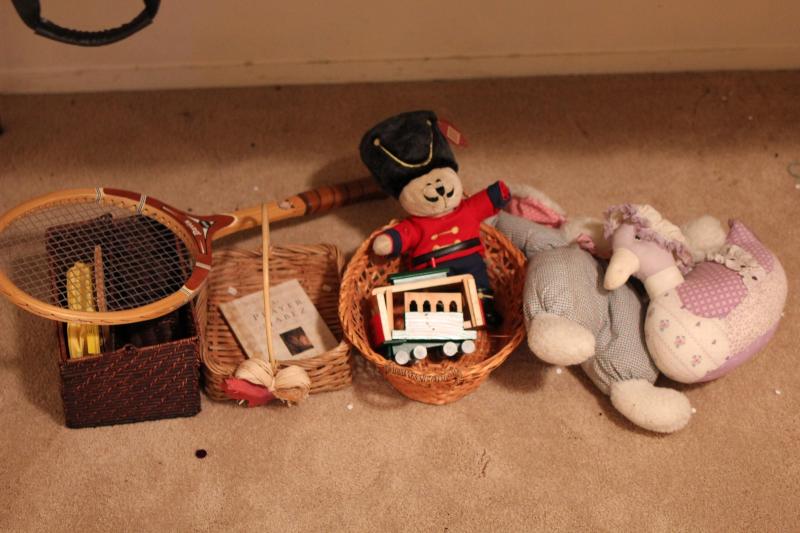 Lot 57: Misc Baskets, Stuffed Animals, Tennis Racket
