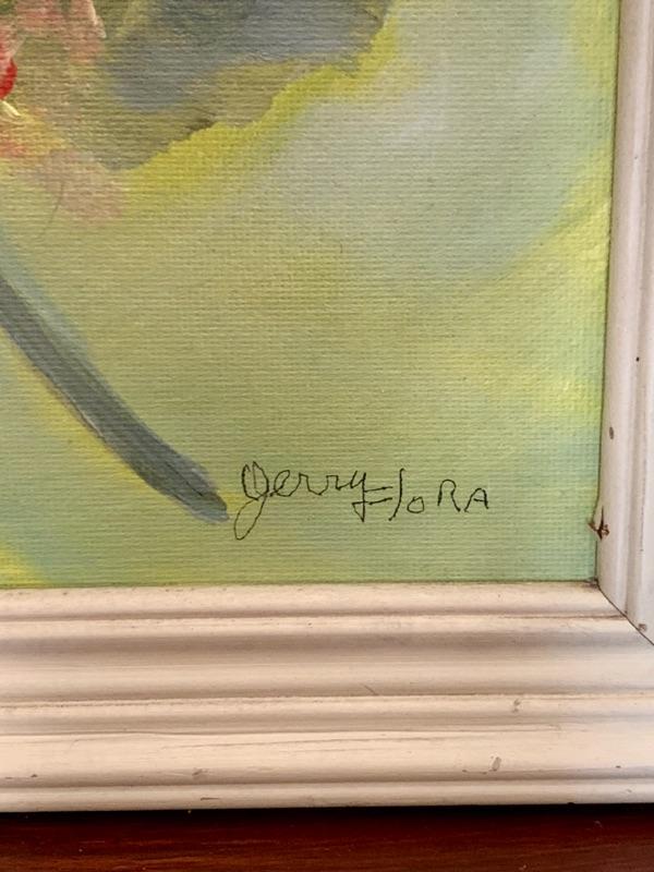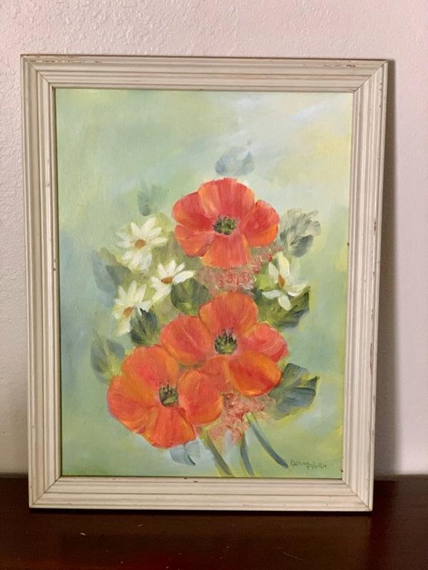 Original vintage oil painting by Jerry Flora. Orange-red poppies with white daisies in white frame. Artist signed. Measures 14" x 18 1/4." Frame shows some chippy wear. Note, this was framed by artist and not professional.