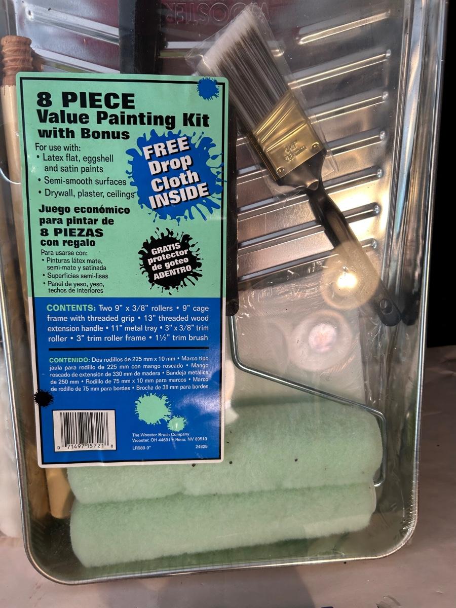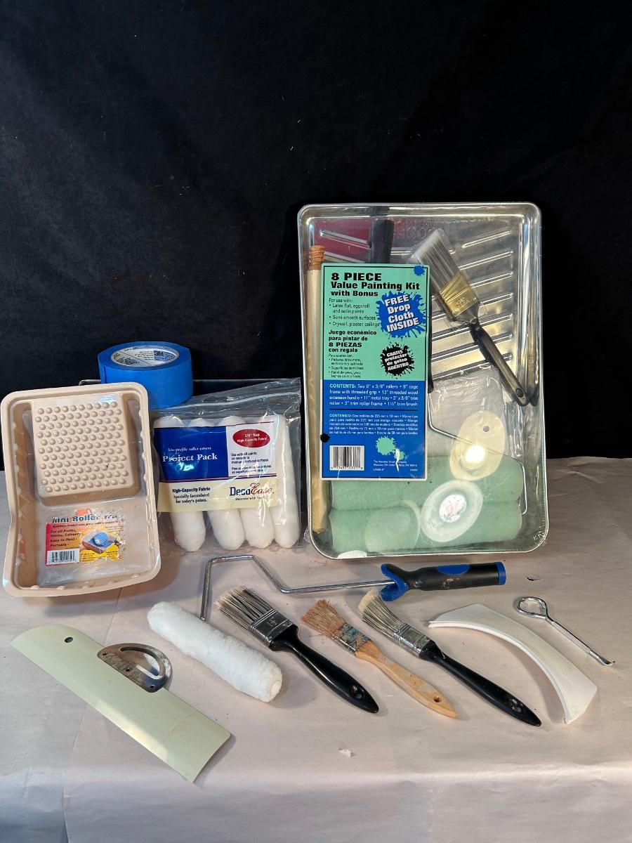 includes new 8 pc kit, assorted rollers and brushes, painter's tape